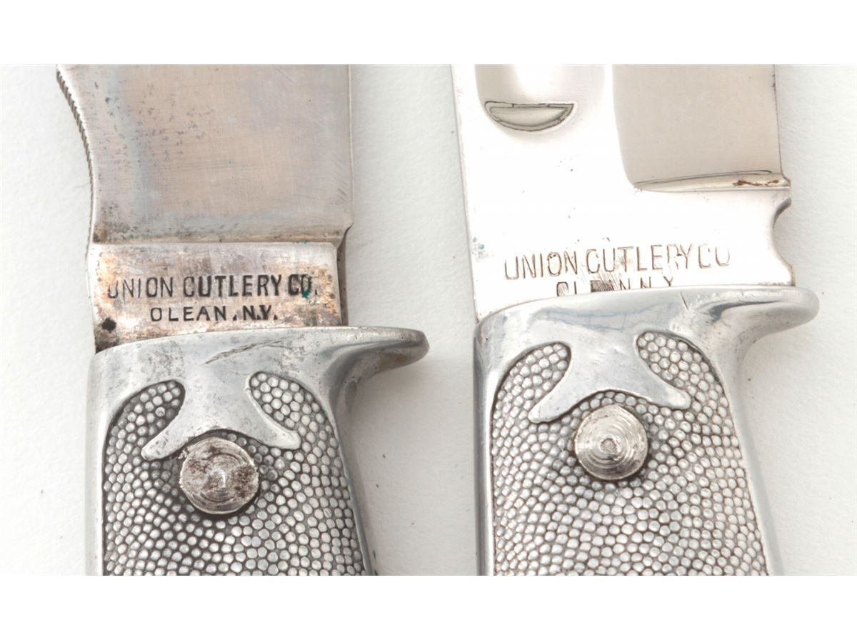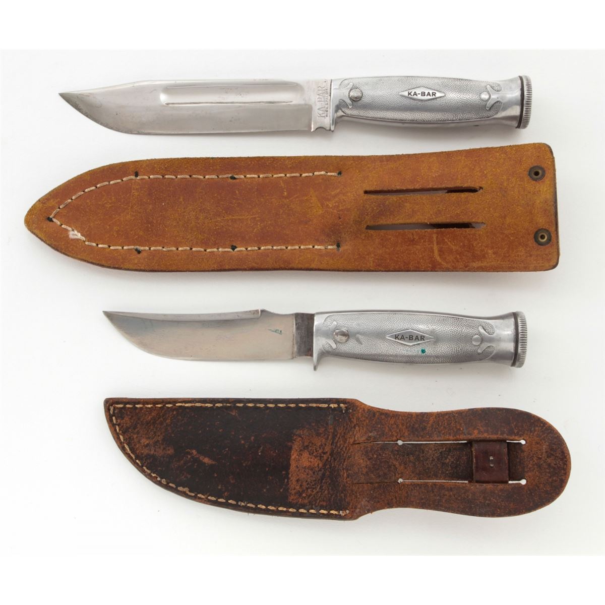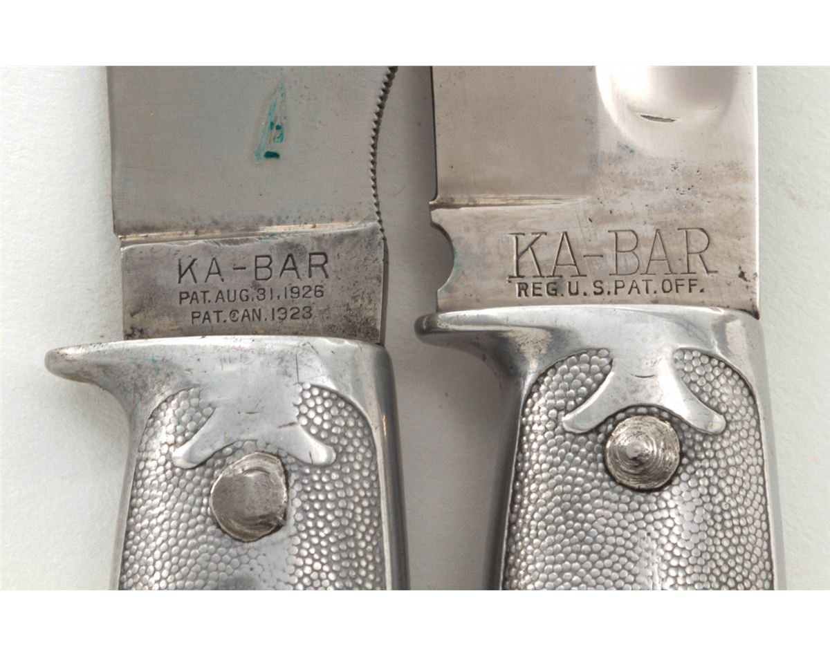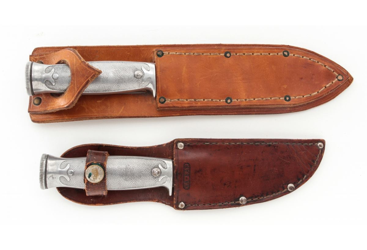 Lot of Two (2) KA-BAR/Union Cut. Co. Hollow Handle Survival Knives: 1.) 4-1/4'' up-swept blade, marked ''KA-BAR/PAT. AUG. 31, 1926/PAT. CAN. 1923'' The reverse is marked ''UNION CUTLERY CO./OLEAN, N.Y.'' 8-1/2'' overall, hollow aluminum handle, removeable threaded aluminum pommel with compass and leather ''KA-BAR'' sheath. 2.) 5-7/8'' clipped point blade, marked ''KA-BAR/REG. U.S. PAT. OFF.'', reverse marked ''UNION CUTLERY CO./OLEAN, N.Y.''; 10'' overall, hollow aluminum handle, removable threaded aluminum pommel with compass and leather sheath. Condition of the 8-1/2'' knife is fine overall with normal signs of age and wear. The 10'' knife is excellent as cleaned. Handles and threaded pommels remain tight. Compass arrows move freely. Sheaths with tight stitching and seams. Est.: $200-$350/lot.