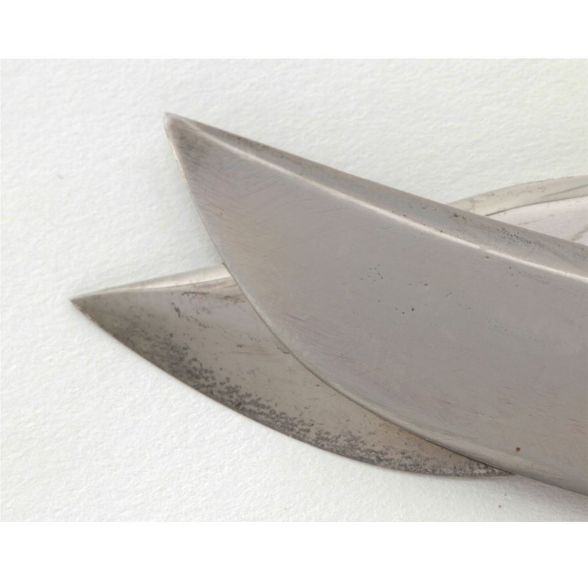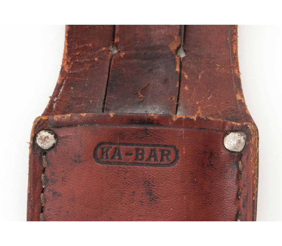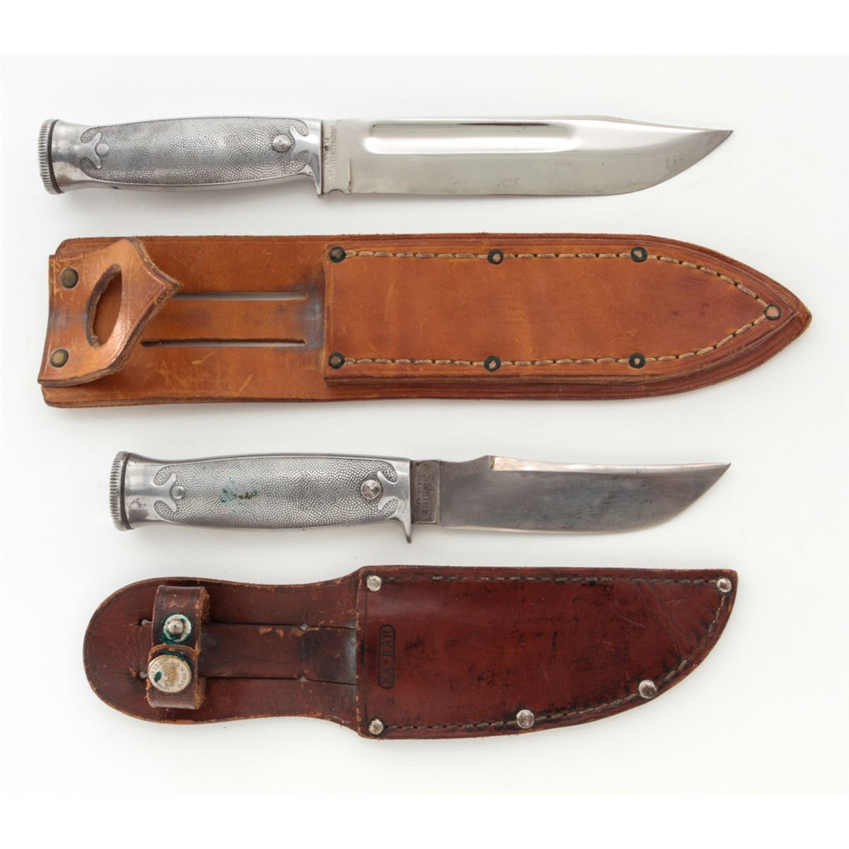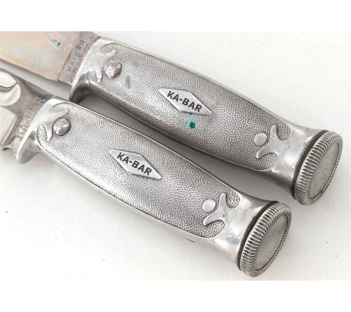 Lot of Two (2) KA-BAR/Union Cut. Co. Hollow Handle Survival Knives: 1.) 4-1/4'' up-swept blade, marked ''KA-BAR/PAT. AUG. 31, 1926/PAT. CAN. 1923'' The reverse is marked ''UNION CUTLERY CO./OLEAN, N.Y.'' 8-1/2'' overall, hollow aluminum handle, removeable threaded aluminum pommel with compass and leather ''KA-BAR'' sheath. 2.) 5-7/8'' clipped point blade, marked ''KA-BAR/REG. U.S. PAT. OFF.'', reverse marked ''UNION CUTLERY CO./OLEAN, N.Y.''; 10'' overall, hollow aluminum handle, removable threaded aluminum pommel with compass and leather sheath. Condition of the 8-1/2'' knife is fine overall with normal signs of age and wear. The 10'' knife is excellent as cleaned. Handles and threaded pommels remain tight. Compass arrows move freely. Sheaths with tight stitching and seams. Est.: $200-$350/lot.