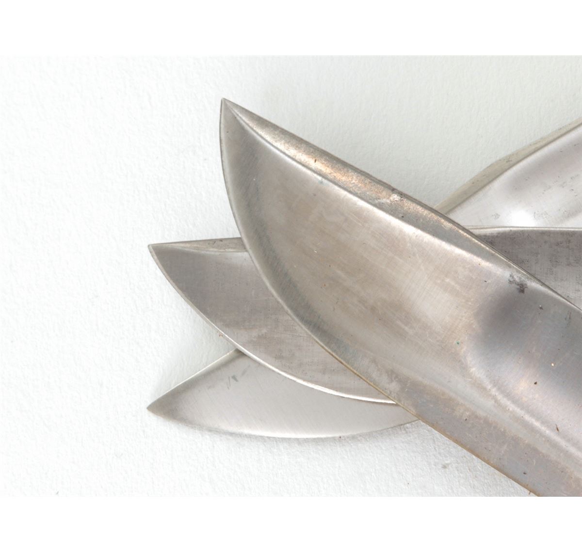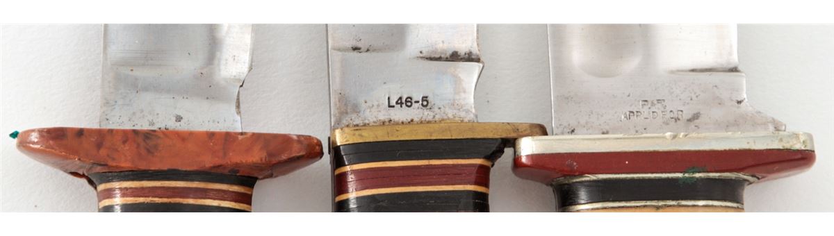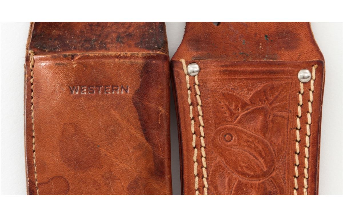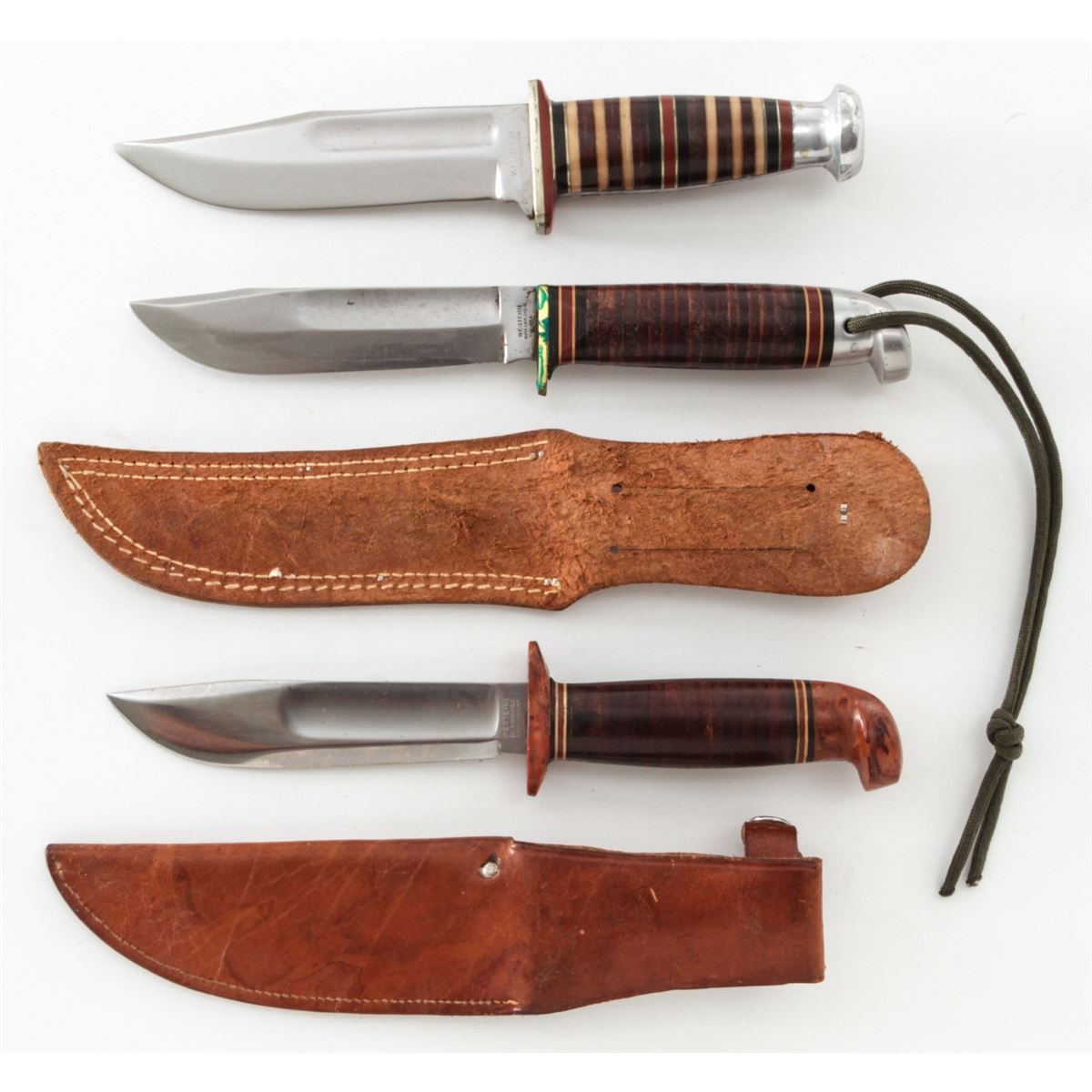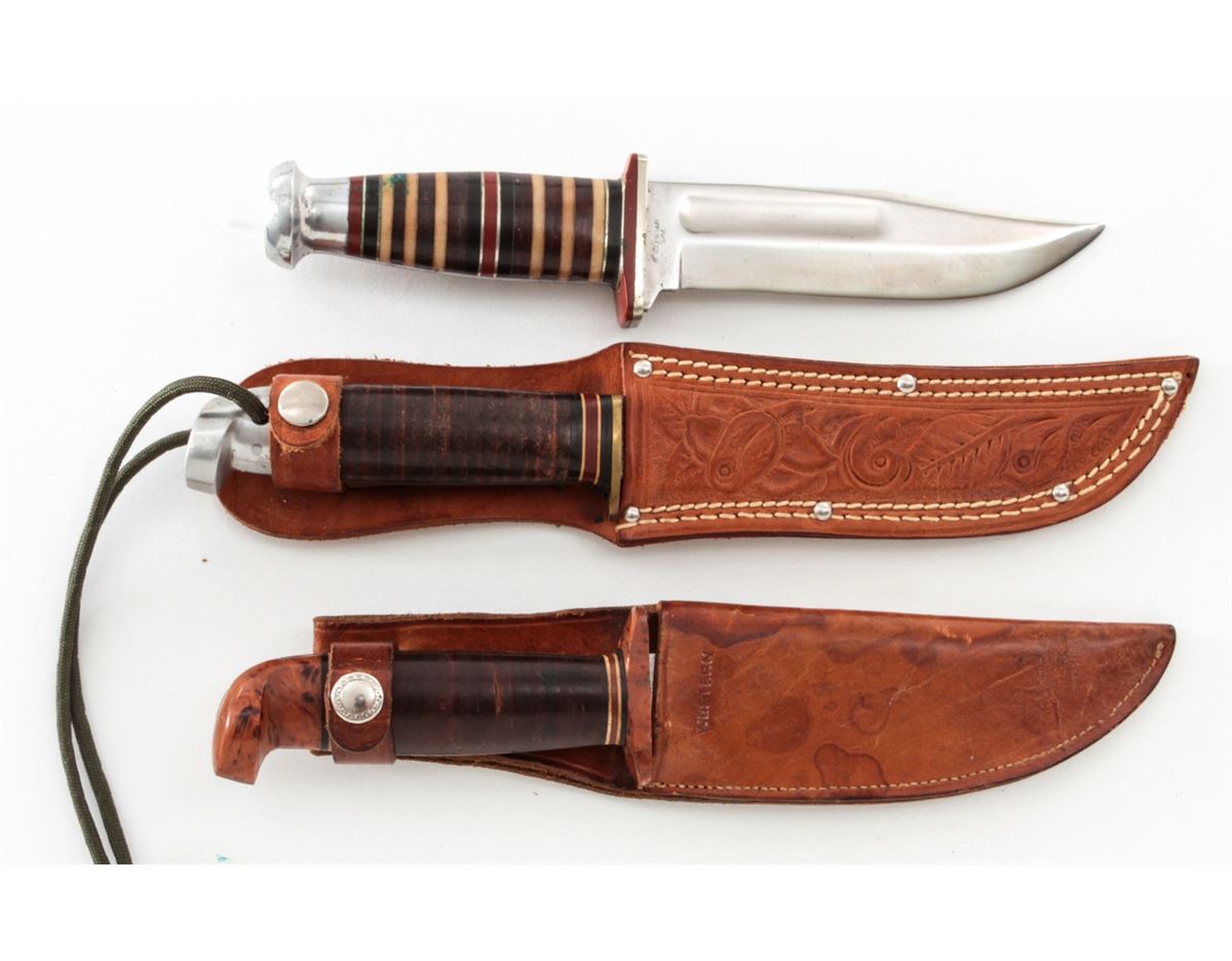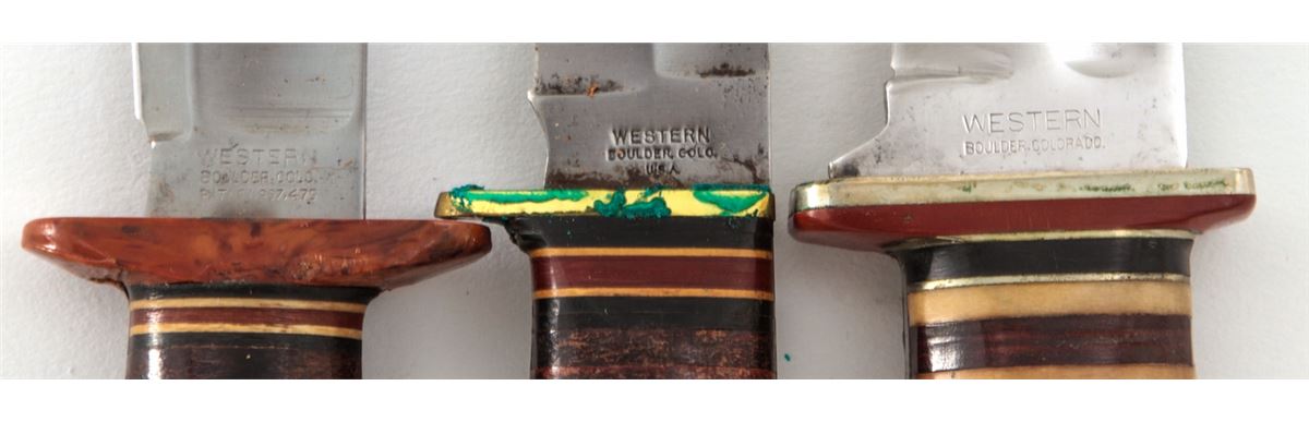 Lot of Three (3) Early to mid-20th Century Knives, by Western: 1.) Hunting knife, 4-7/8'' blade marked on ricasso ''WESTERN/BOULDER COLORADO.'', reverse marked PAT./APPLD FOR''; 8-7/8'' overall, nickel silver guard with red spacer, handle made of stacked wood, nickel silver, and micarta washers, with aluminum pommel. 2.) Western hunting/fighting knife, 4-7/8'' blade marked on ricasso ''WESTERN/BOULDER COLO./PAT. NO. 1,967,479''; 9-1/4'' overall, brown plastic guard and pommel, stacked leather washer handle with multi-colored inserts and leather Western sheath. 3.) #L46-5 Shark knife, 4-7/8'' blade marked on ricasso ''WESTERN/BOULDER COLO./U.S.A.'', reverse marked ''L46-5''; 9-1/4'' overall, brass half guard, stacked leather washer handle with multi-colored inserts, aluminum pommel, green paracord wrist thong, with tooled double stitched leather sheath. Conditions range from very good to fine overall showing normal signs of age and wear. Blades have been cleaned with light scattered pitting visible; handles remain tight, small amounts of verdigris present on some metal surfaces. Est.: $250-$350/lot.