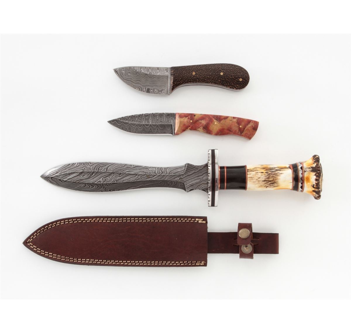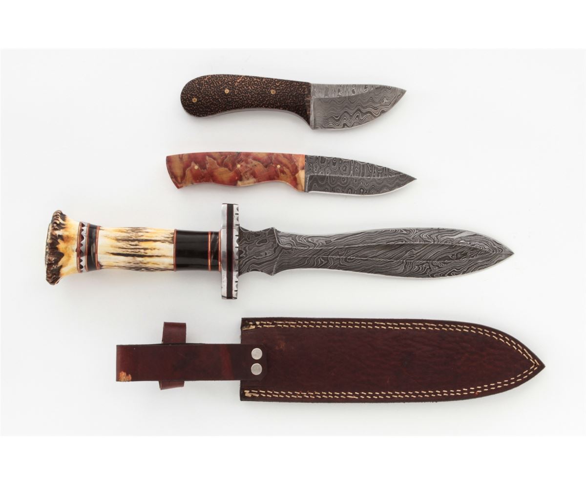Lot of Three (3) Damascus Blade Knives: 1.) Skinning knife, 3-1/4'' blade, 7-3/8'' overall, black palm wood grips with mosaic pins. 2.) Hunting knife, 3-3/4'' blade, 8-3/8'' overall, file worked spine, spalted box elder grips with brass pins. 3.) Large dagger, 9-1/4'' blade, 15-1/4'' overall, stag and buffalo horn handle with a leather sheath. Condition to all is excellent showing no use. Grips with light marks from handling. Black palm wood with some natural fissures. All grips are stabilized. Est.: $250-$350/lot.