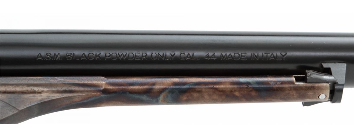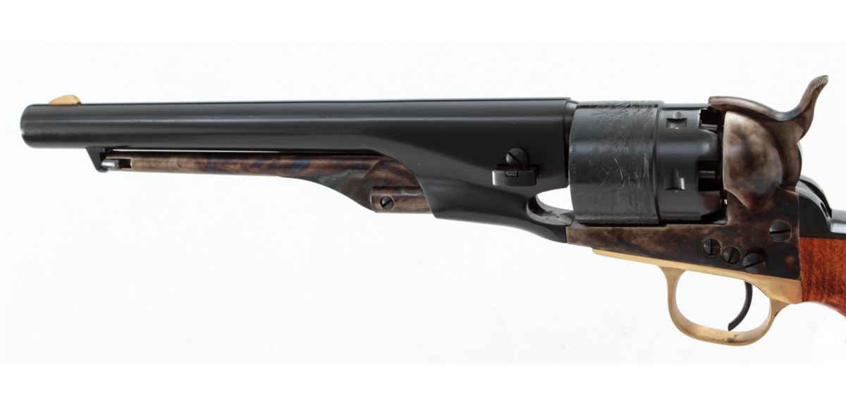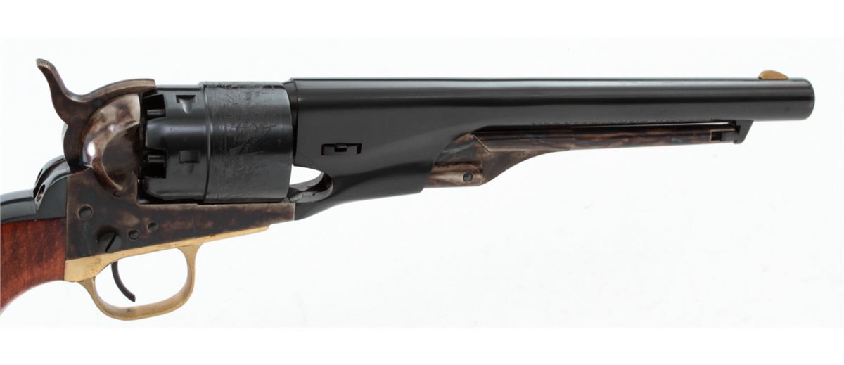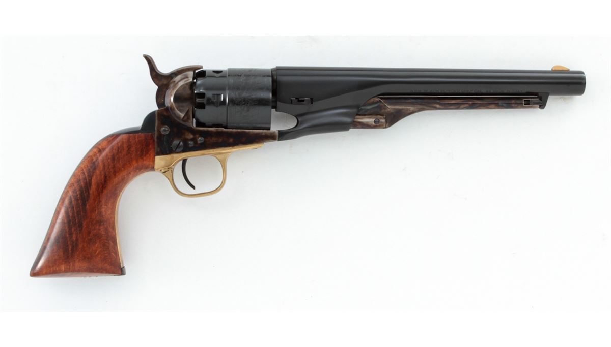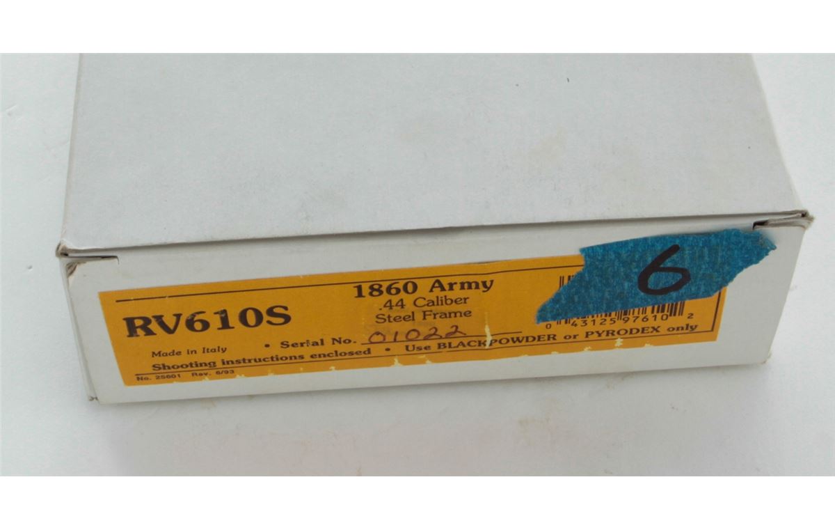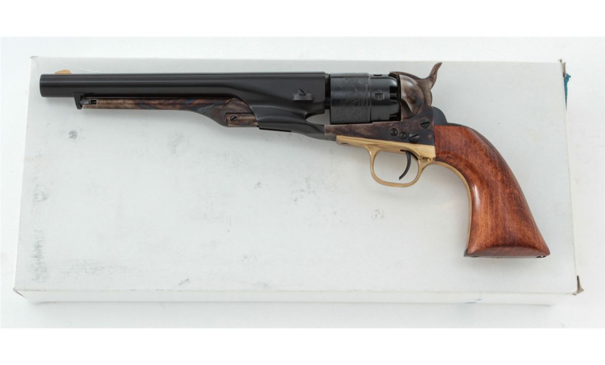 Italian Copy of 1860 Colt Army, probably by Pietta, #0122, .44 ball, 8'' barrel, blue and case hardened finish, with dark stained hardwood grips and brass triggerguard. Condition is excellent, appearing as new and unfired, in its original box. Est.: $200-$400. (Antique)