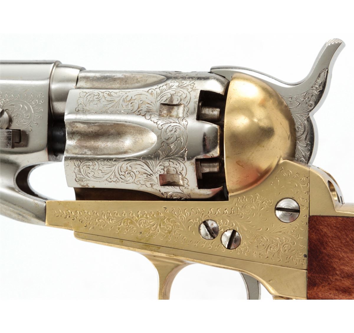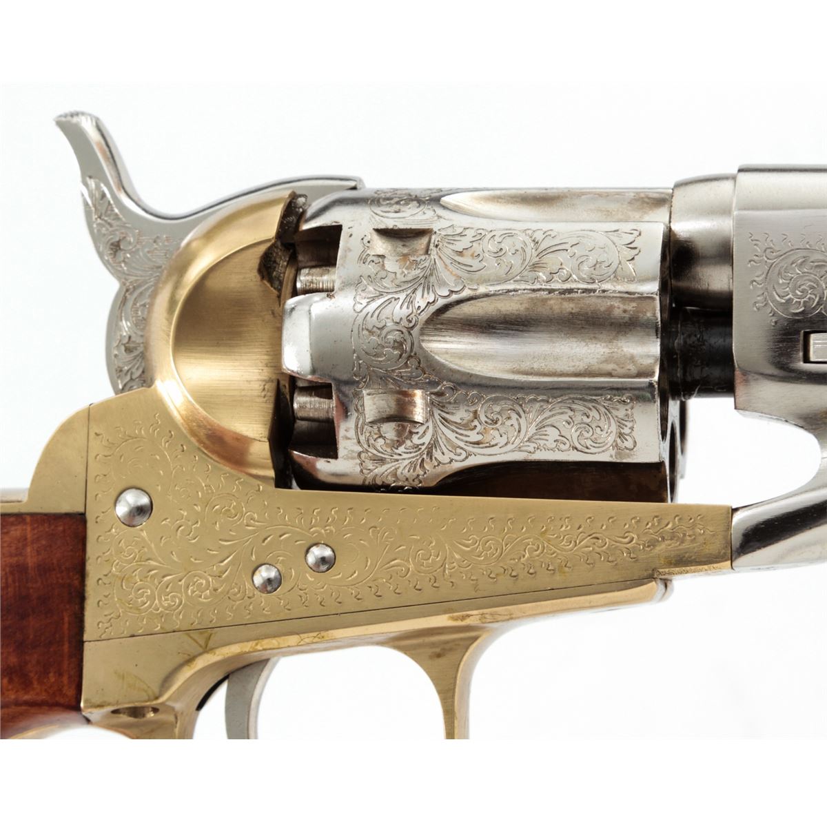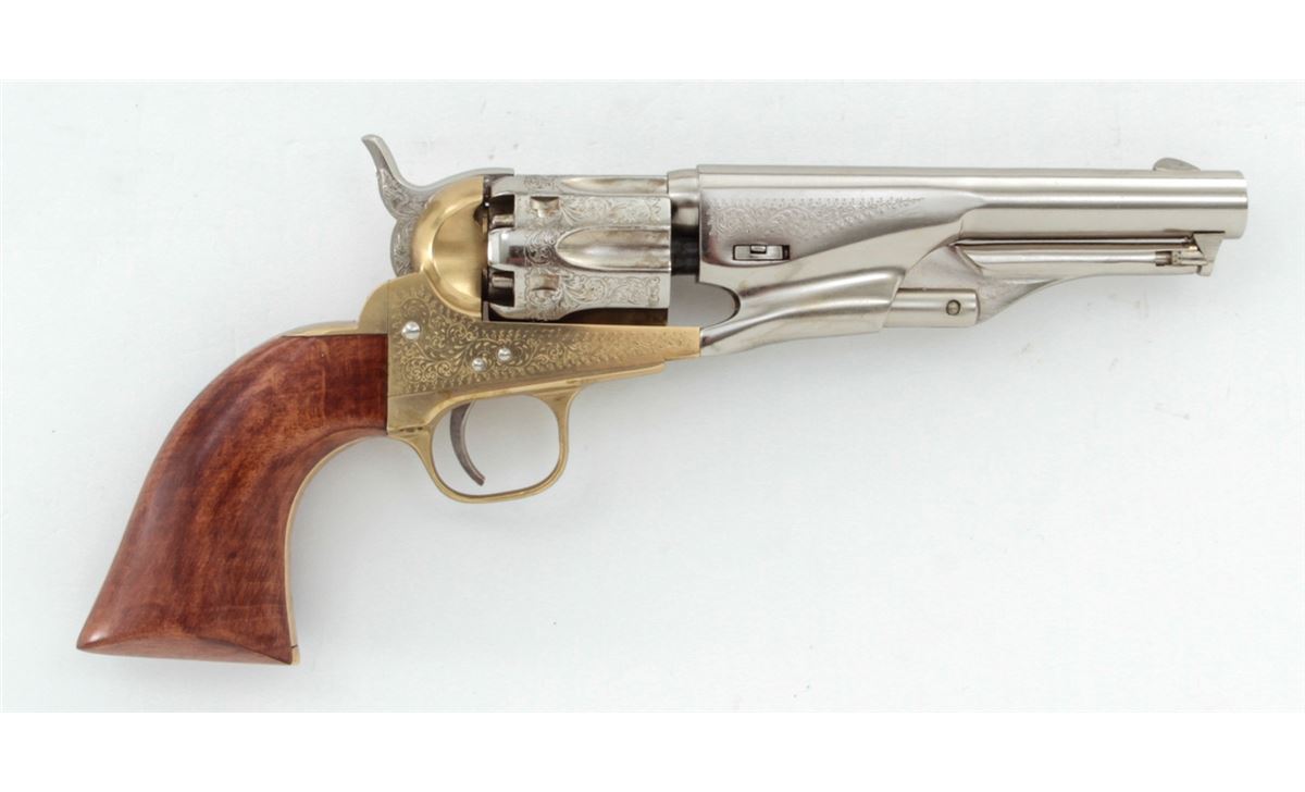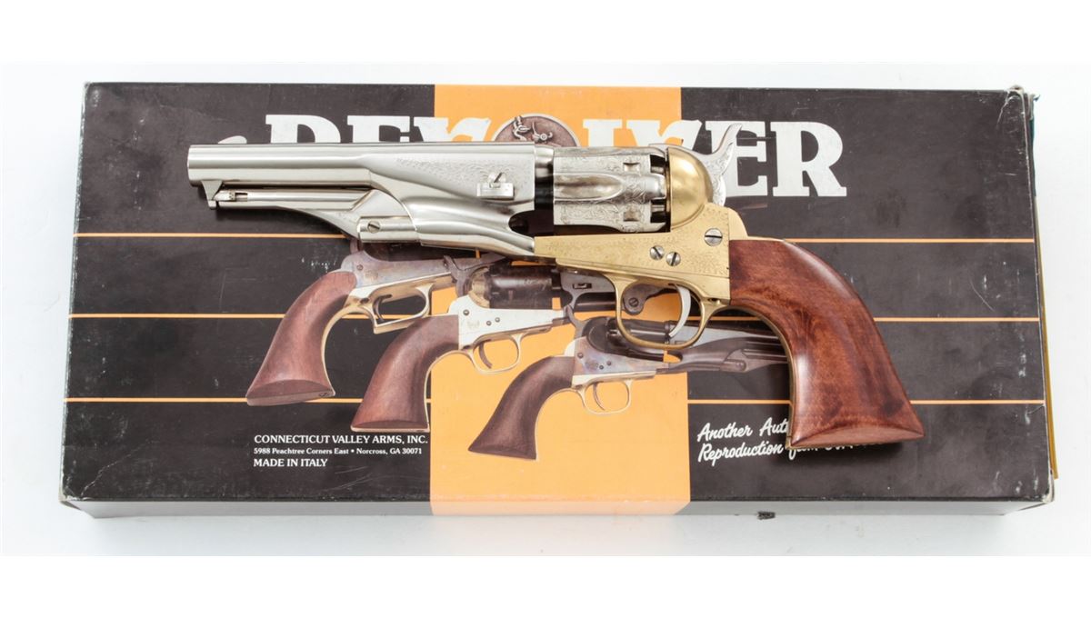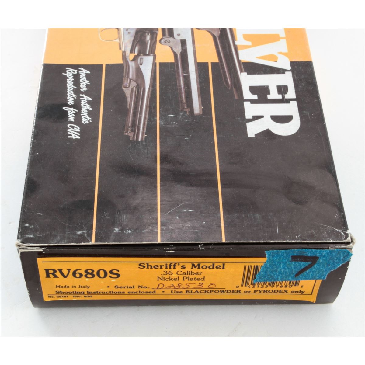 CVA Percussion ''Sheriff's Model'' Revolver, #D28530, .36 cal., 5-1/2'' barrel, roll-engraved nickel finish, brass frame and triggerguard, one-piece dark stained grips. Condition is excellent, appearing as new, in its original box. Est.: $150-$300. (Antique)