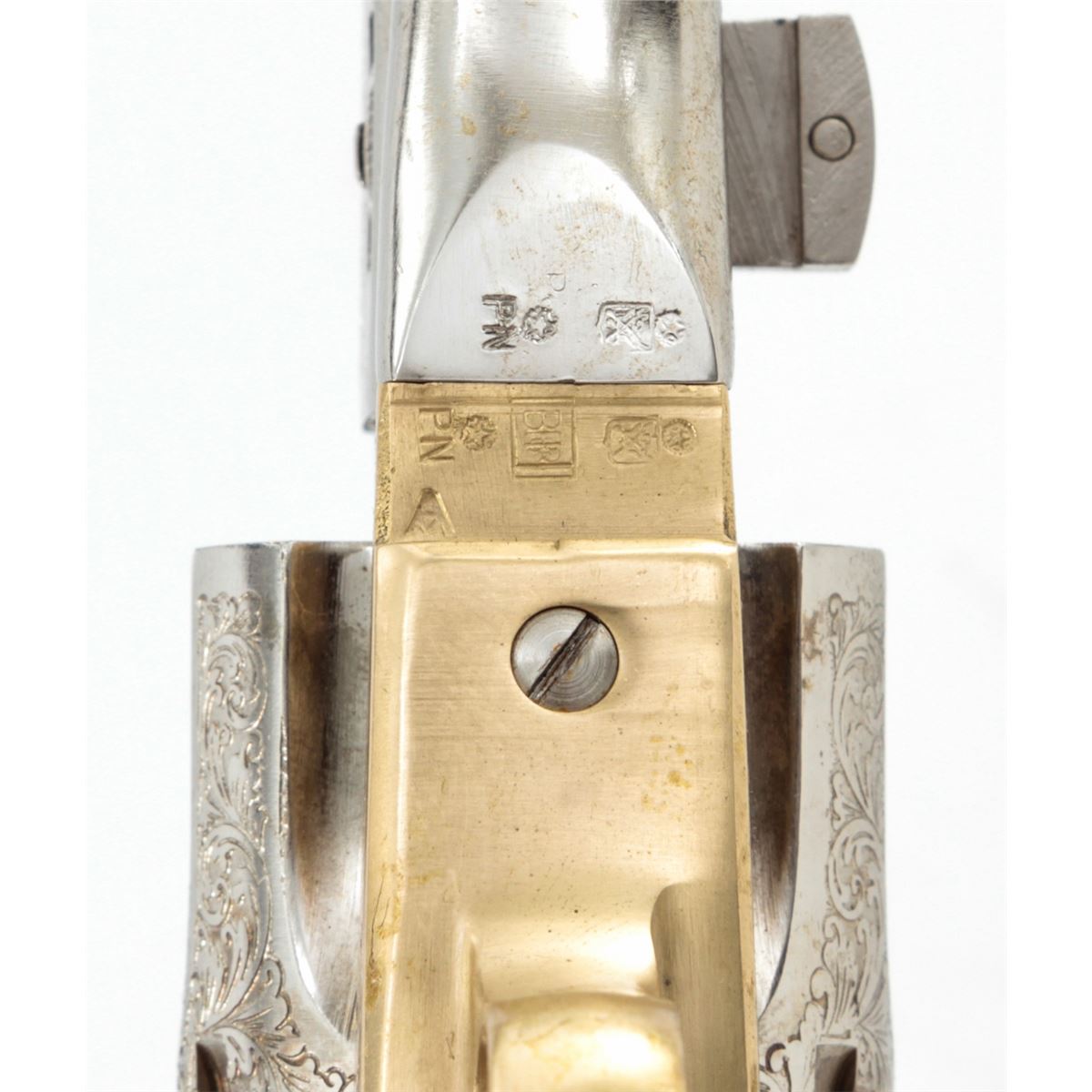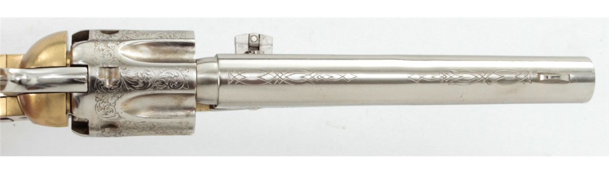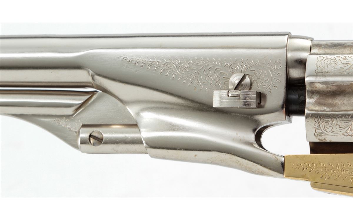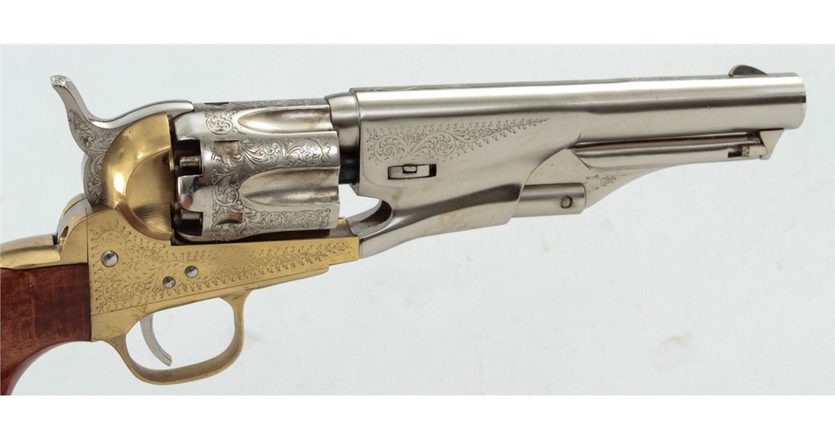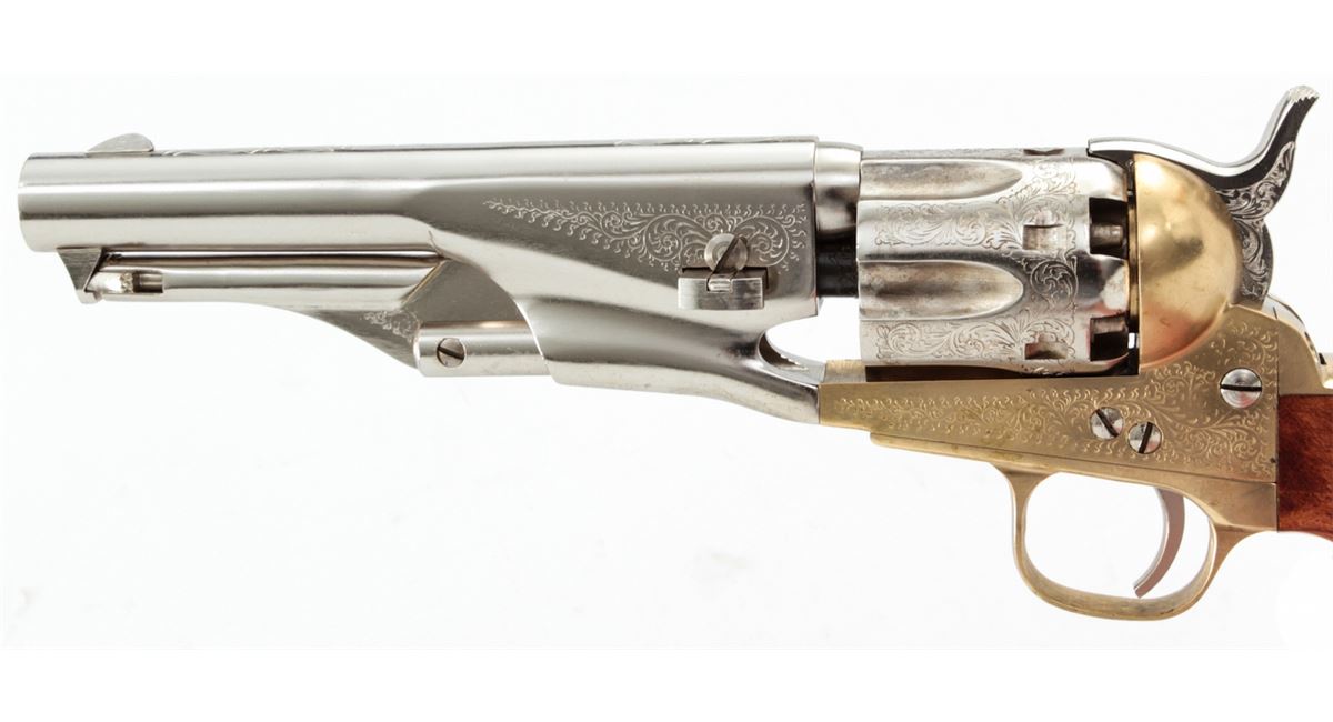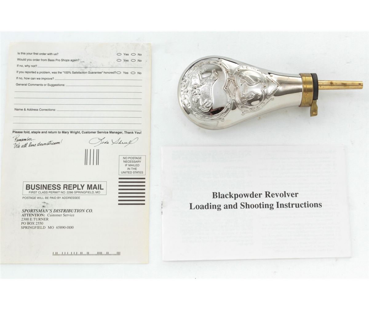 CVA Percussion ''Sheriff's Model'' Revolver, #D28530, .36 cal., 5-1/2'' barrel, roll-engraved nickel finish, brass frame and triggerguard, one-piece dark stained grips. Condition is excellent, appearing as new, in its original box. Est.: $150-$300. (Antique)
