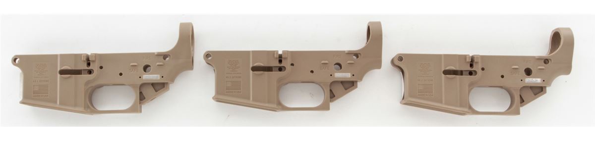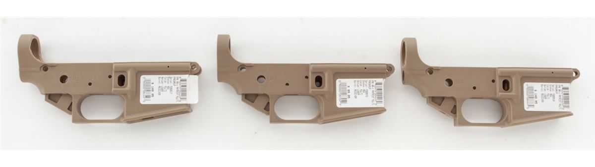 Lot of Three (3) FDE AR-1 Patriot Multi-Caliber AR Polymer Frame Lower Receivers, #FDE05217, #FDE0534, and #FDE0572, all in desert sand color. Brand new. Retails @ $450/lot. Est.: $250-$400/lot. (Modern, registration required) (Field Time)