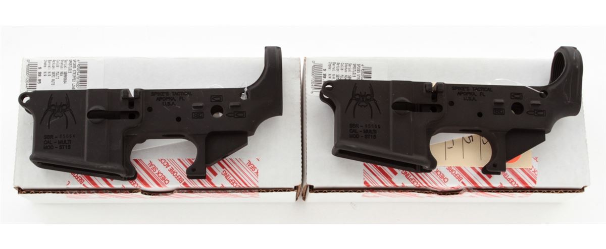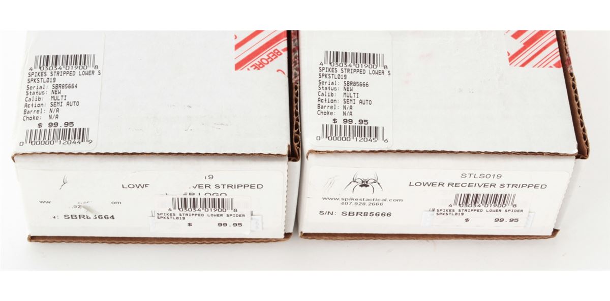 Lot of Two (2) Spike's Tactical ST-15 Multi-Caliber Lower Receivers for AR-15 Type Weapons, #85664 and #85666. Bth appear to be high quality aluminum receivers. Brand new in original boxes, no small parts included. Retails @ $200/lot. Est.: $100-$200/lot. (Modern) (Not available to Calif. residents.) (Field Time)