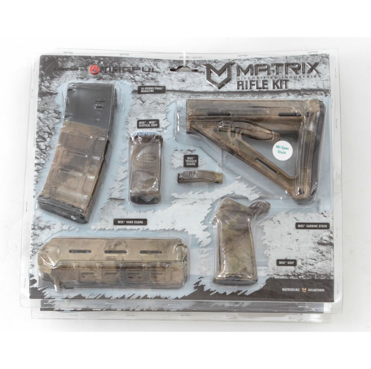 Lot of Two (2) Matrix Diversified Ind. MagPul AR-15 Rifle Kits, includes MDI custom finish magpul, MOE carbine HG, pistol grip, vertical grip, triggerguard, MOE buttstock, and one 30-round mag per kit. All brand new in original packaging. Retails @ $500/lot. Est.: $200-$400/lot. (High cap mags not available to Calif. residents.) (Field Time)