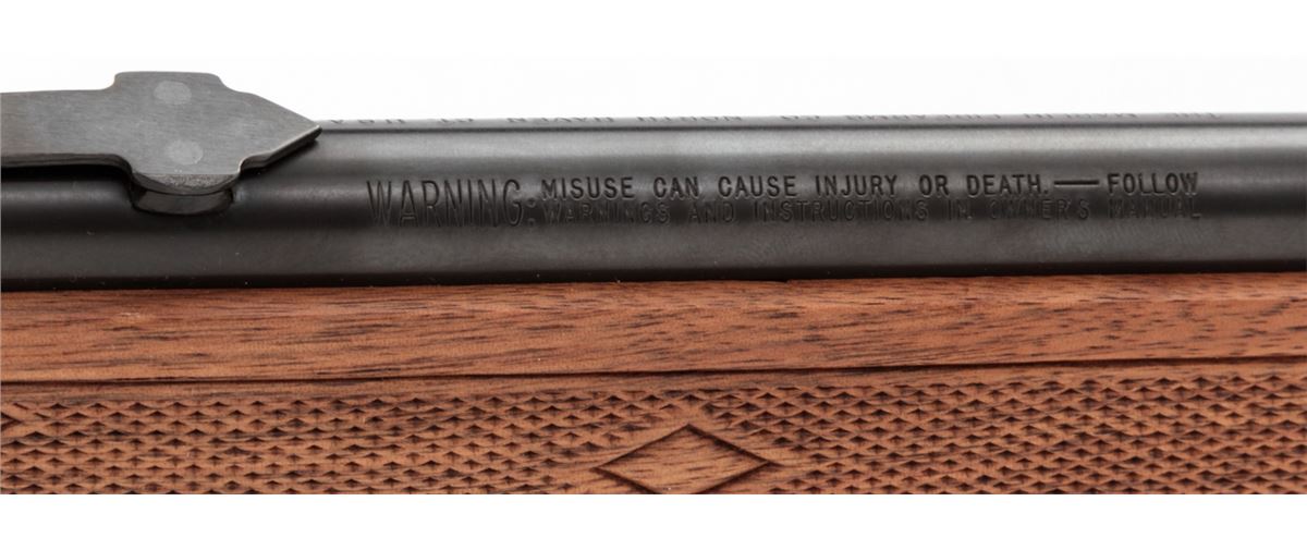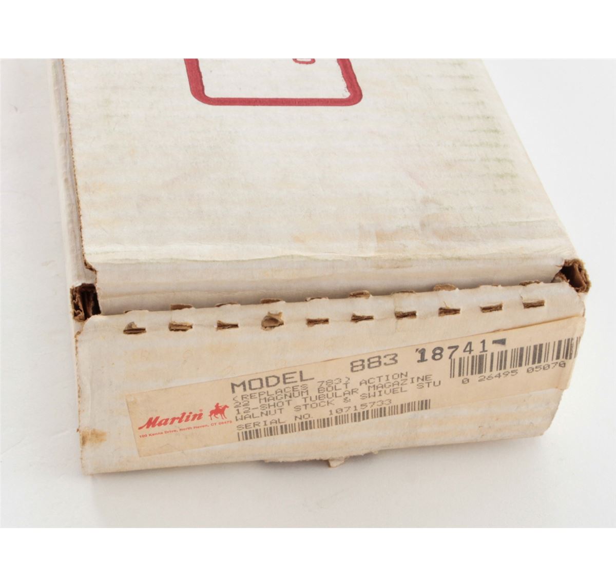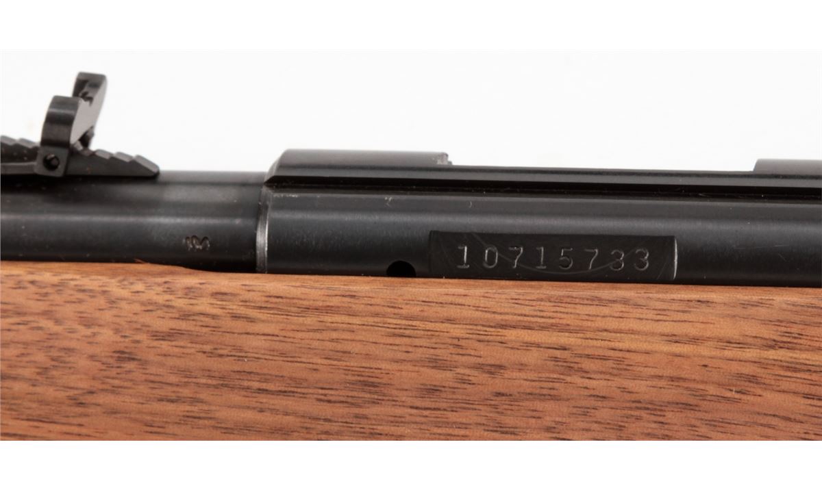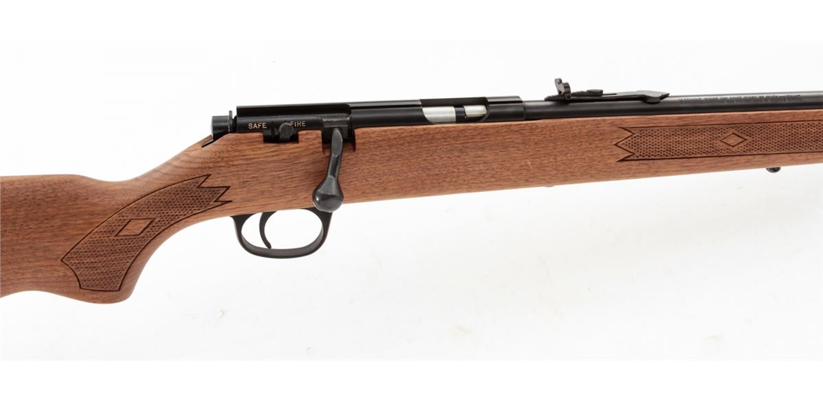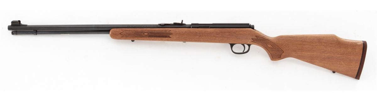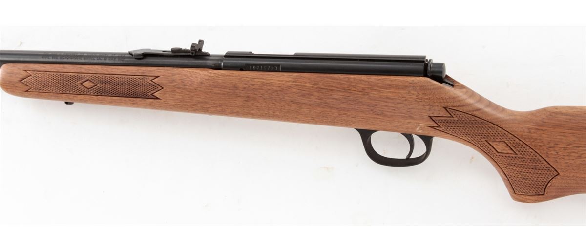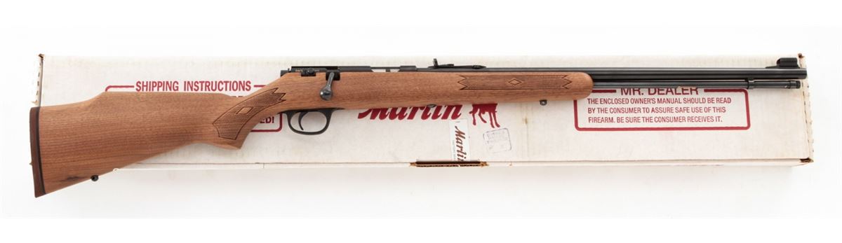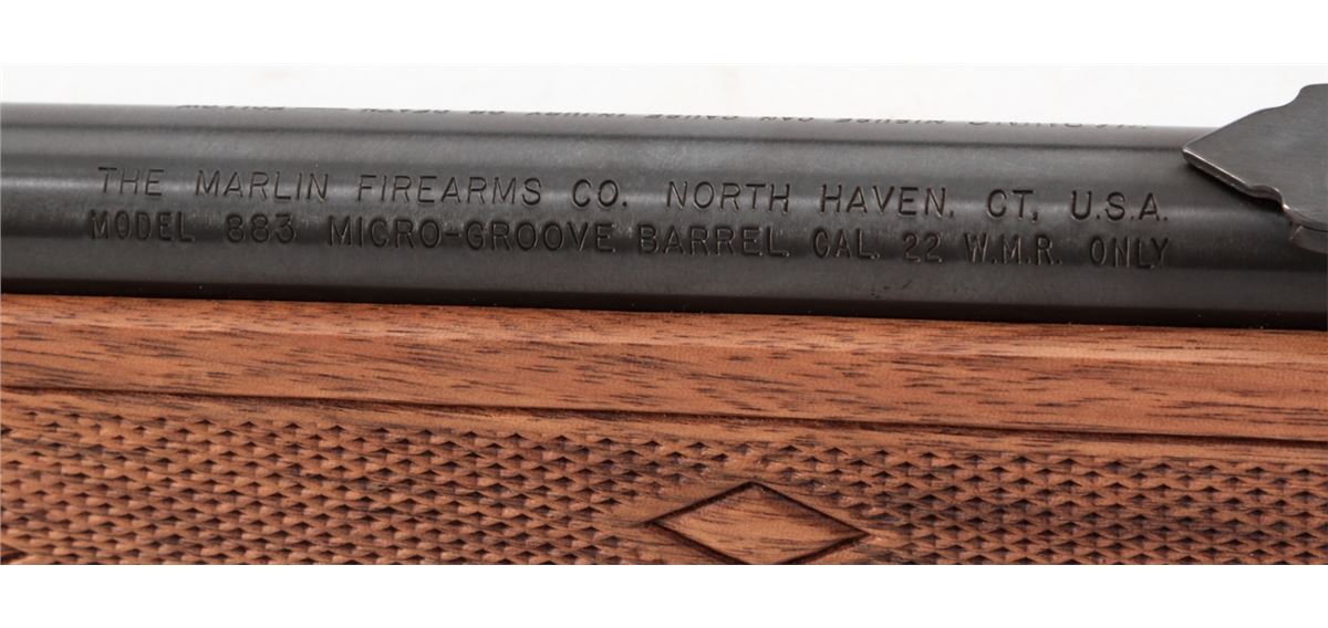 Marlin Model 883 Bolt Action Rifle, #10715733, .22 WMR cal., 22'' micro-groove barrel, blue finish, checkered walnut stock, Marlin hard rubber buttpad, adjustable semi-buckhorn rear sight, hooded front sight, in original box with matching end label. Condition is fine overall retaining approx. 98% blue, metal surfaces with light marks from handling, stock with scattered moderate scratches and impressions. Action is crisp, bore is bright. Est.: $200-$300. (Modern)