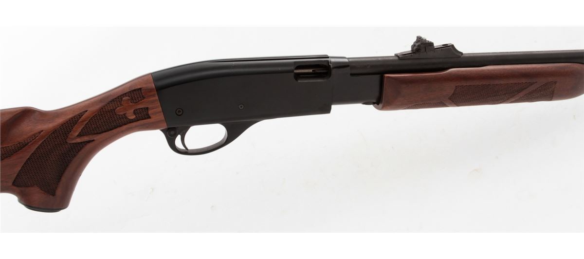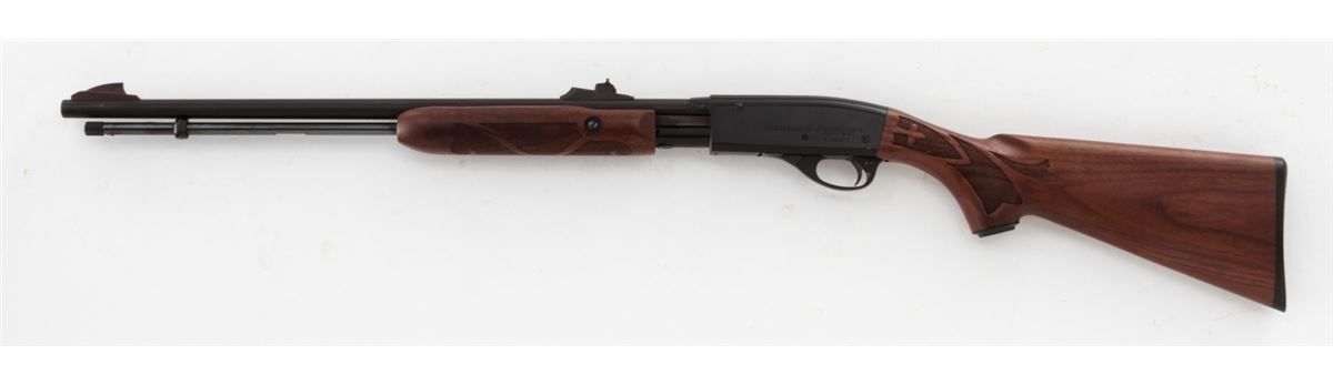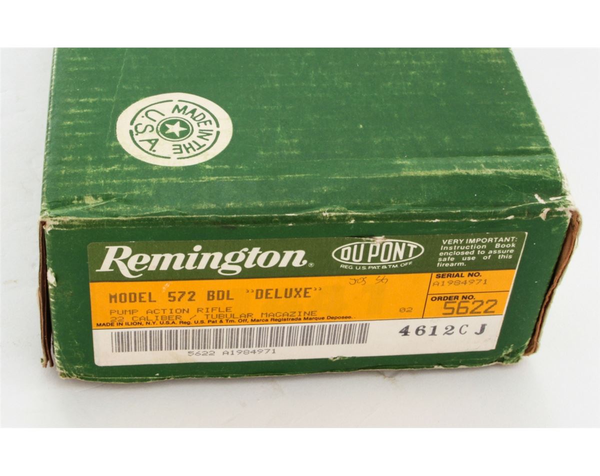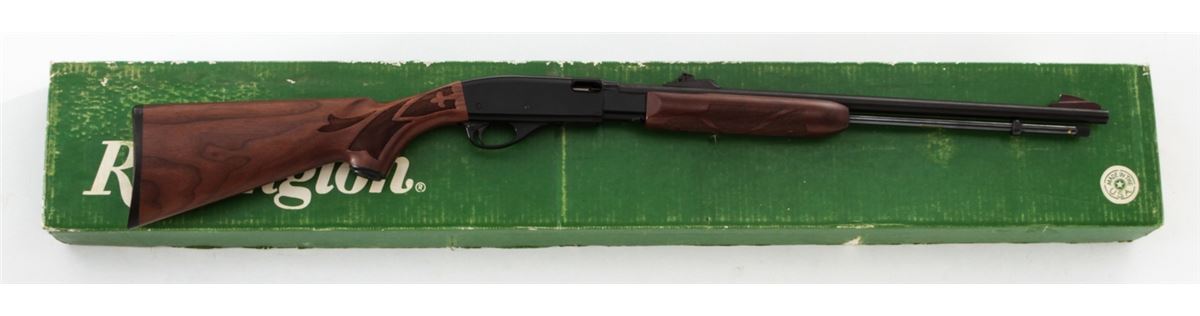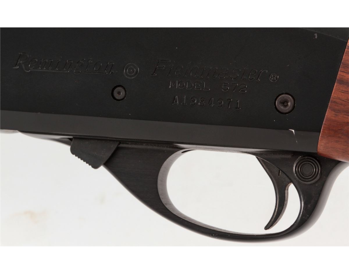 Remington Model 572 BDL Fieldmaster Slide Action Rifle, #A1984971, .22 SL/LR cal., 21'' barrel, black finish receiver, blued barrel, checkered pistol-grip walnut stock and forend, Remington buttplate, in original box with matching end label. Condition is excellent overall showing light marks from handling with an additional few small losses to black finish on receiver. Action is crisp, bore is bright. Est.: $300-$500. (Modern)