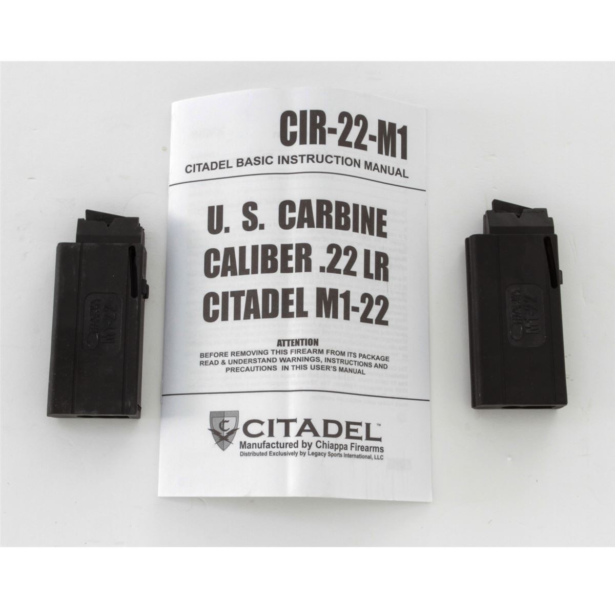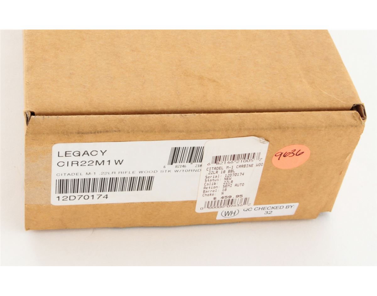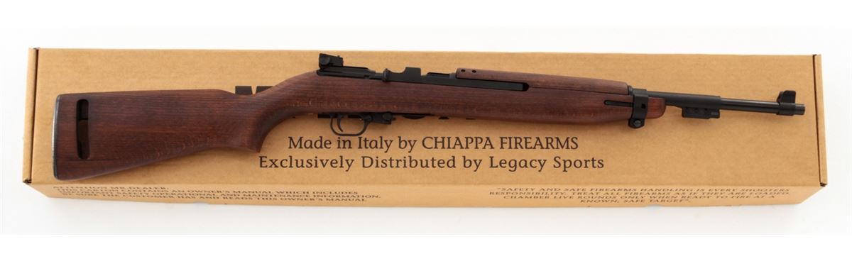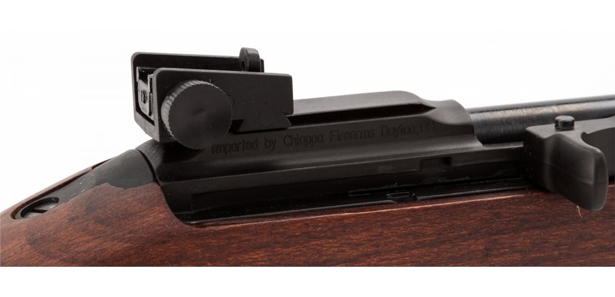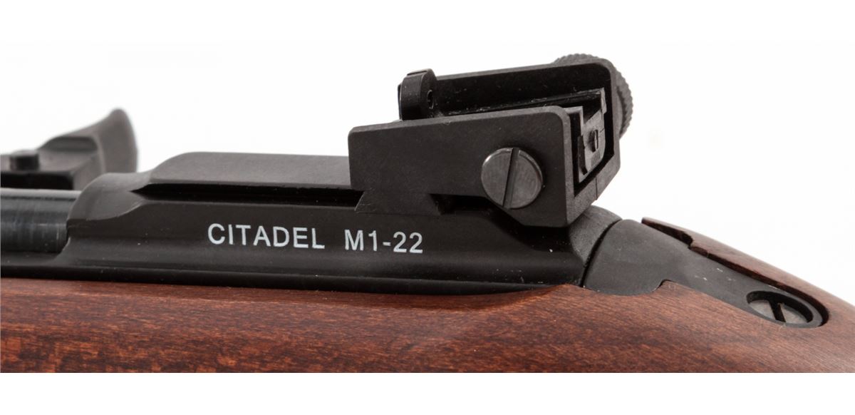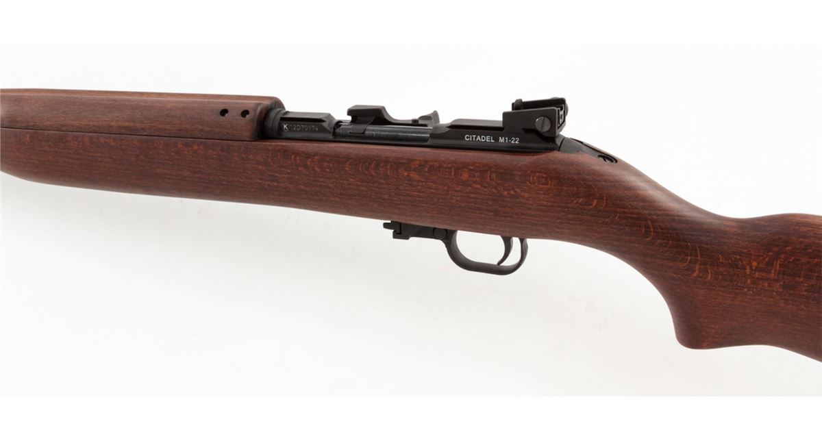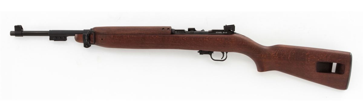Citadel Model M1-22 Semi-Automatic Rifle, #12D70174, .22 LR cal., 18'' barrel, blue finish, smooth walnut stock and handguard, adjustable rear sight, fixed front sight, synthetic bayonet lug, front sling swivel, with two (2) magazines, in box with matching end label and owner's manual. Mfg'd in Italy by Chiappa. Condition is excellent, remaining new and unfired. Retails @ $459.95. Est.: $200-$400. (Modern) (Field Time)