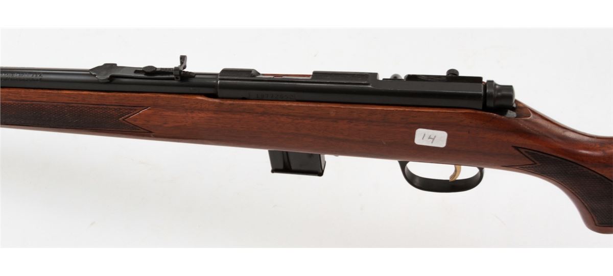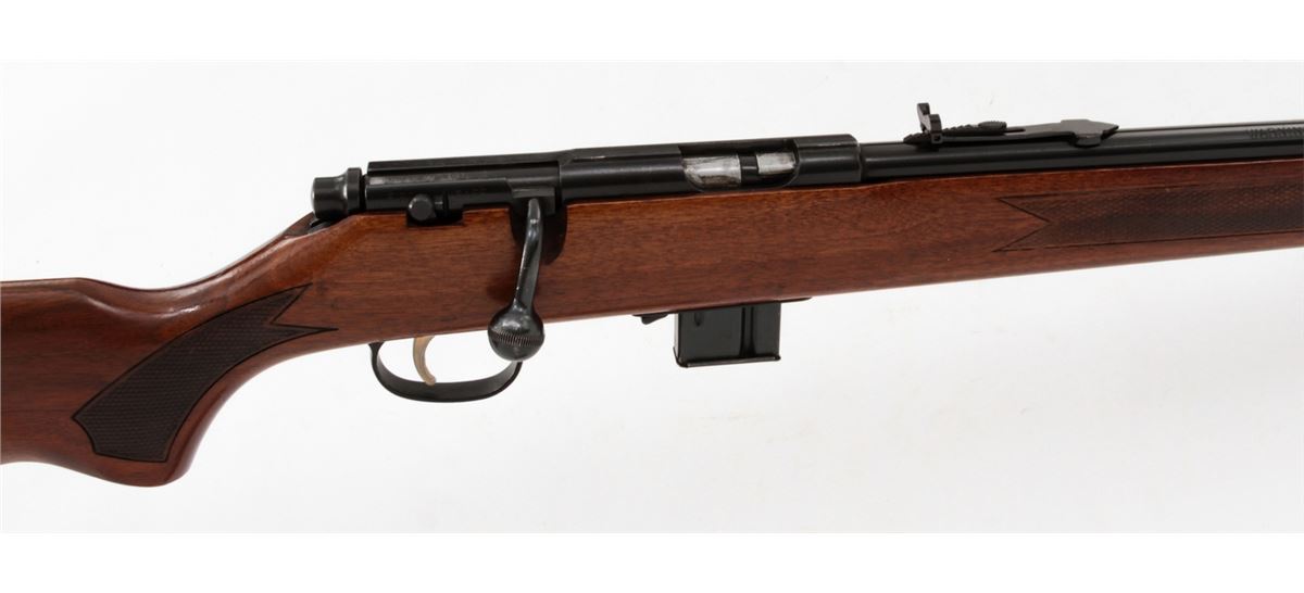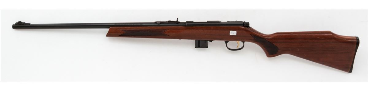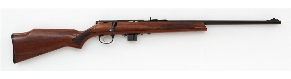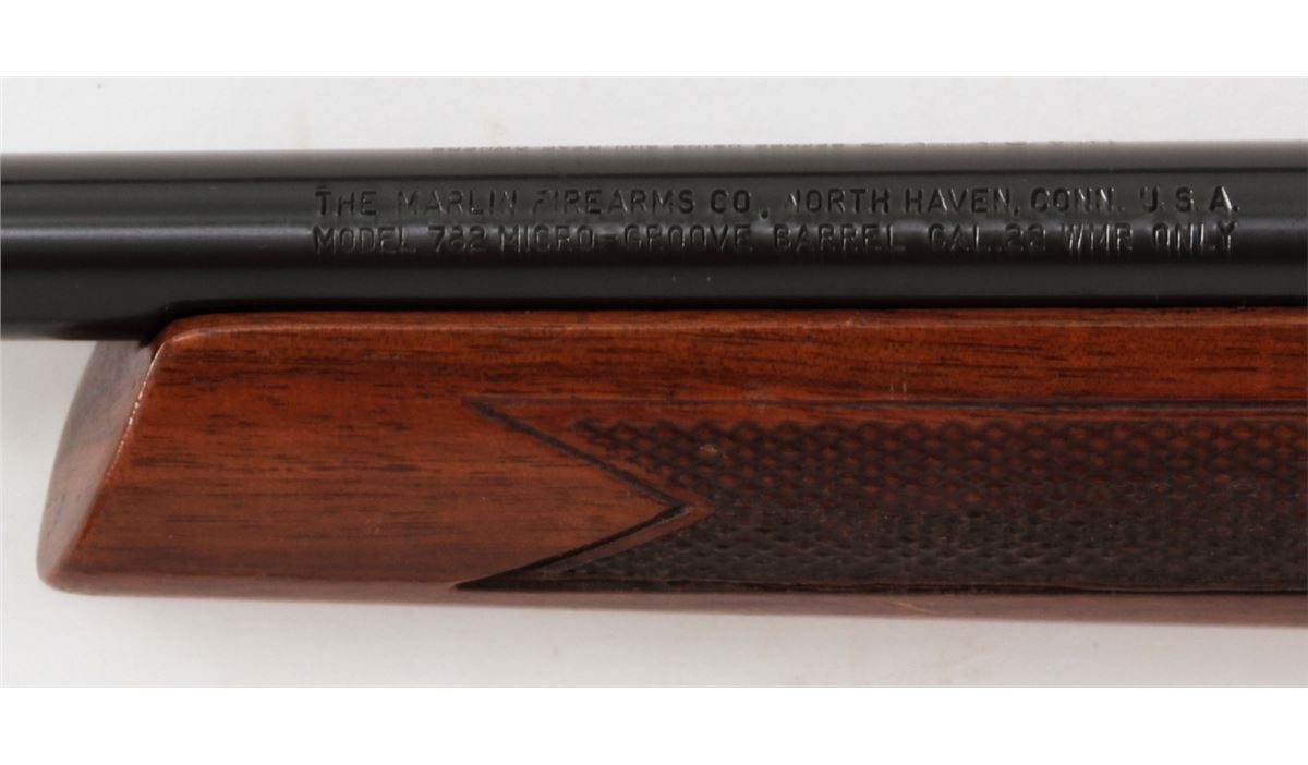 Marlin Model 782 Bolt Action Rifle #19772652, .22 WMR cal., blue finish, 22'' barrel with flip-up semi-buckhorn rear and front blade sight, receiver grooved for dovetail scope mounts, sliding side safety, gold-plated trigger, machine checkered walnut pistol-grip stock, with black plastic Marlin buttplate and one 7-round mag. Mfg'd 1981. Condition is good overall with bright bore and light surface oxidation. Wood with scattered scuffs and scratches. Est.: $100-$150. (Modern)