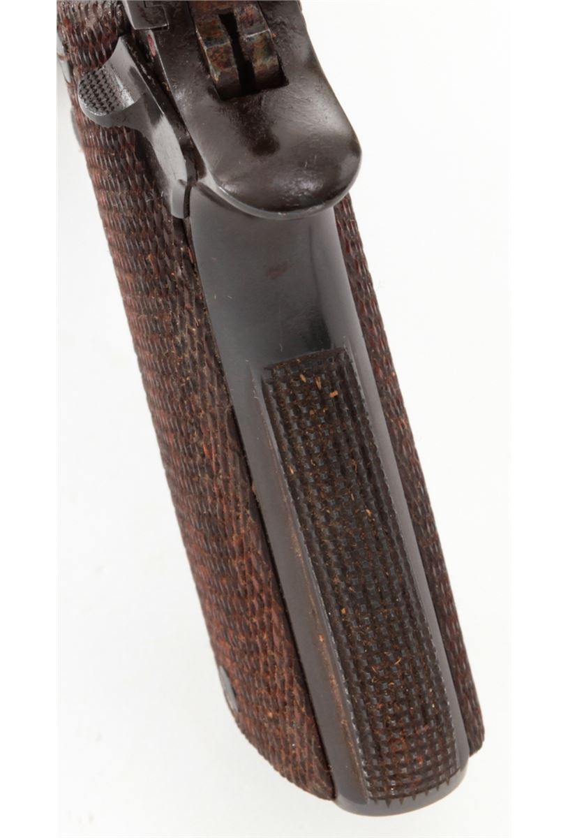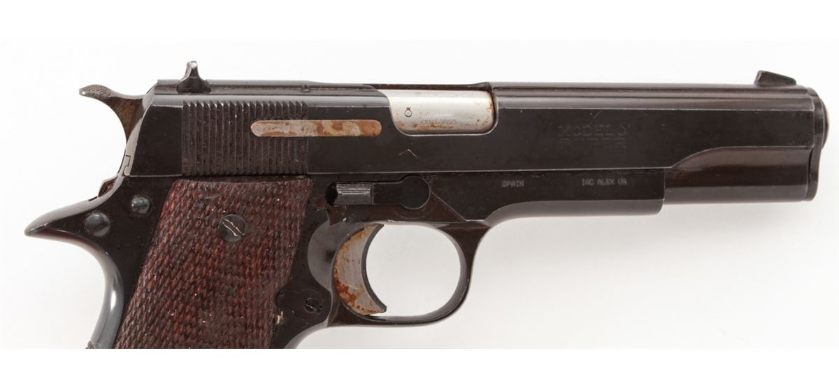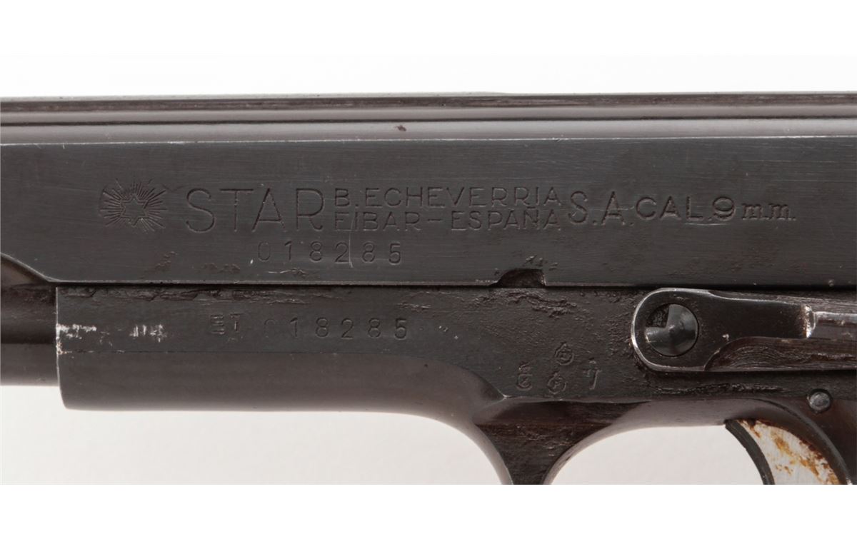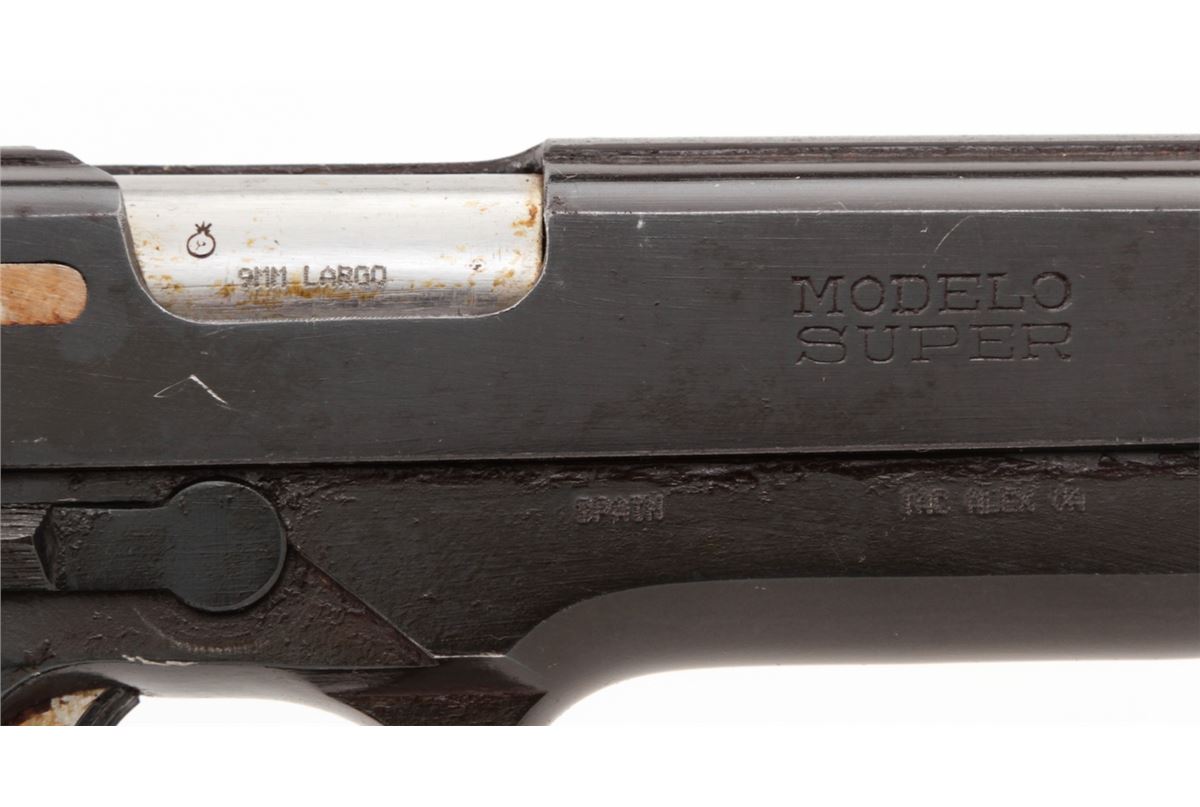 Star Super Semi-Automatic Pistol, #370096, 9mm Largo, 5'' barrel, blue finish, checkered walnut stock, with two (2) magazines. Condition is about fine retaining approx. 94% arsenal blue. Grips with moderate flattening and oil darkening. Good action and Largo barrel is fine. Pistol is covered by old preservative and should clean easily with solvent. Est.: $250-$450. (C&R/PPT)