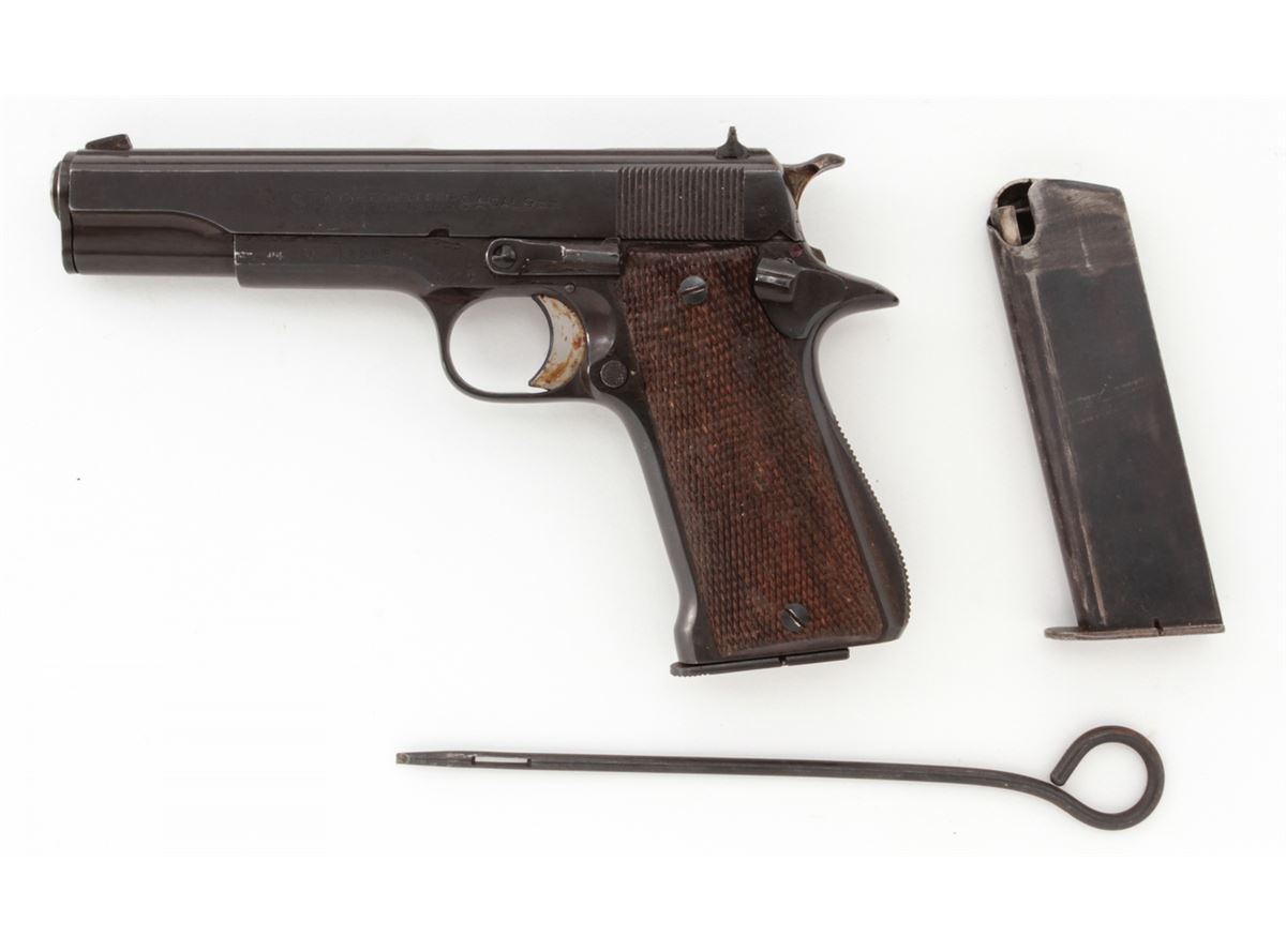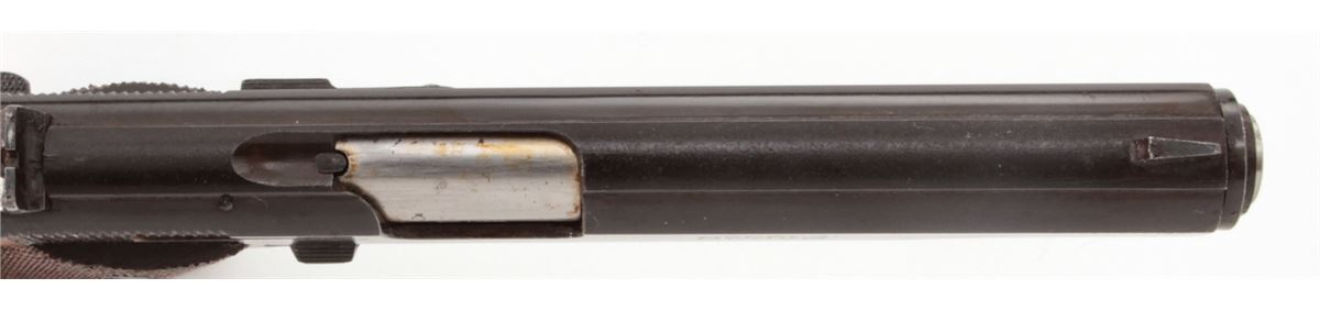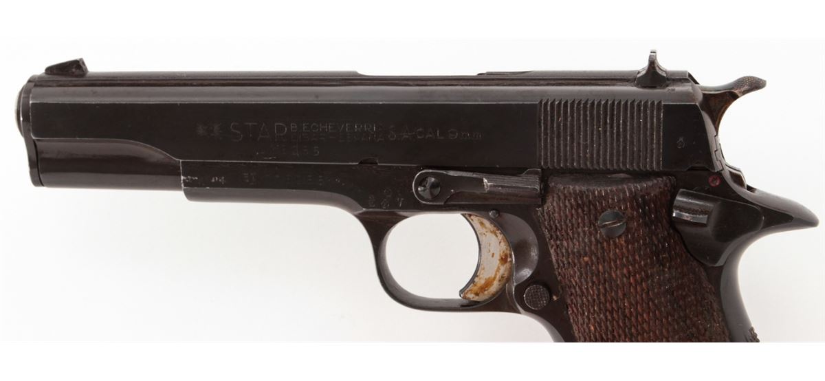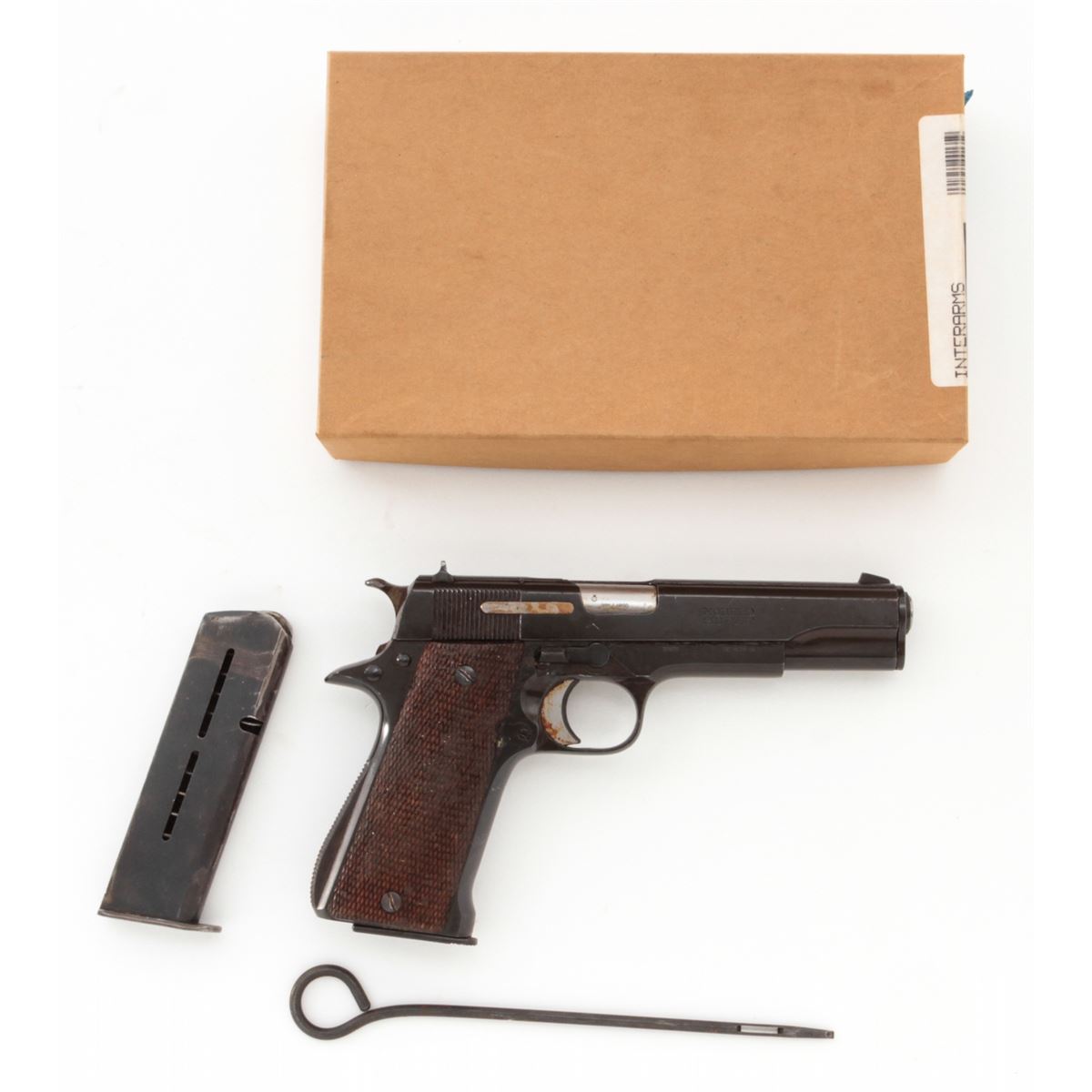 Star Super Semi-Automatic Pistol, #370096, 9mm Largo, 5'' barrel, blue finish, checkered walnut stock, with two (2) magazines. Condition is about fine retaining approx. 94% arsenal blue. Grips with moderate flattening and oil darkening. Good action and Largo barrel is fine. Pistol is covered by old preservative and should clean easily with solvent. Est.: $250-$450. (C&R/PPT)
