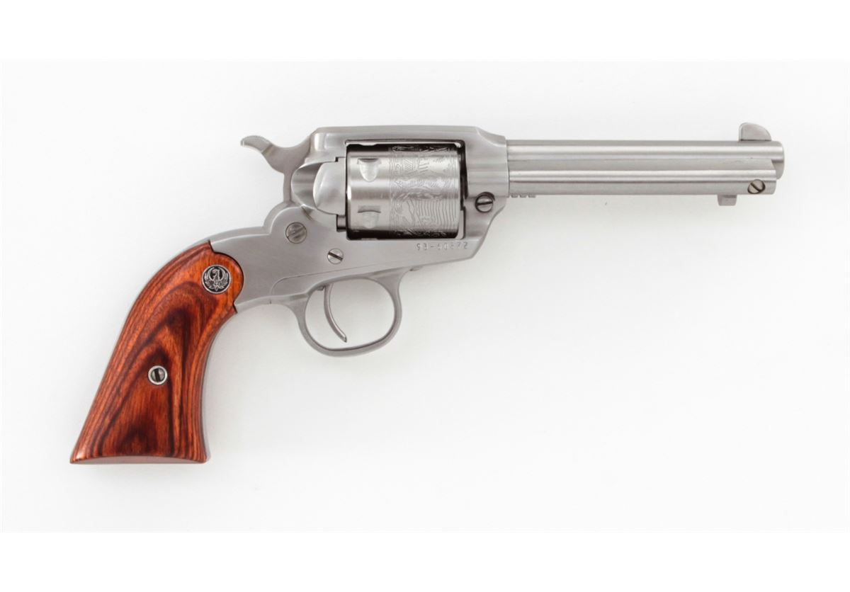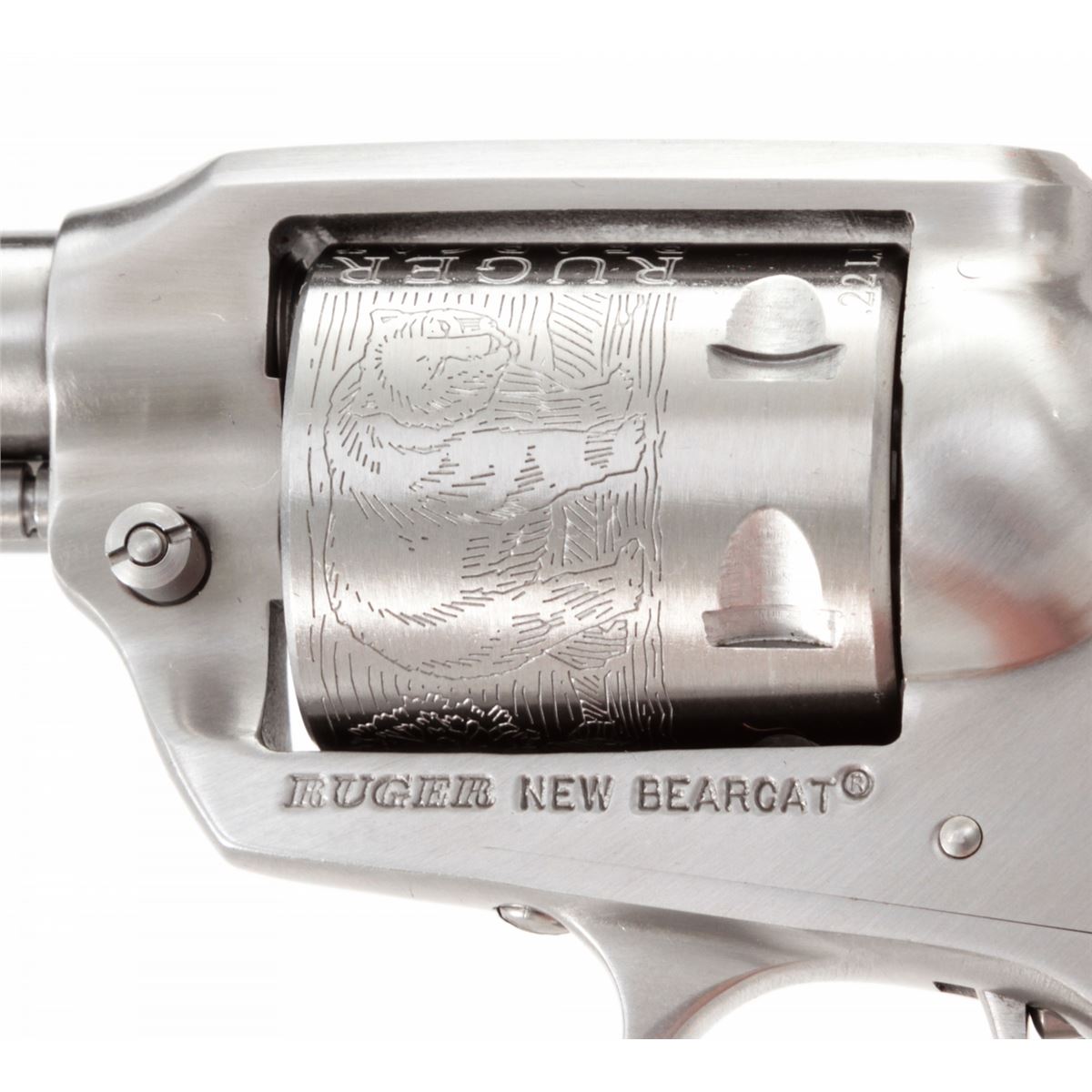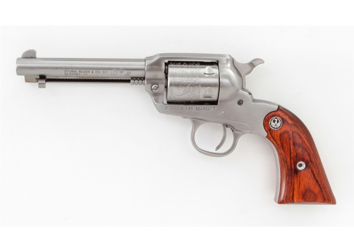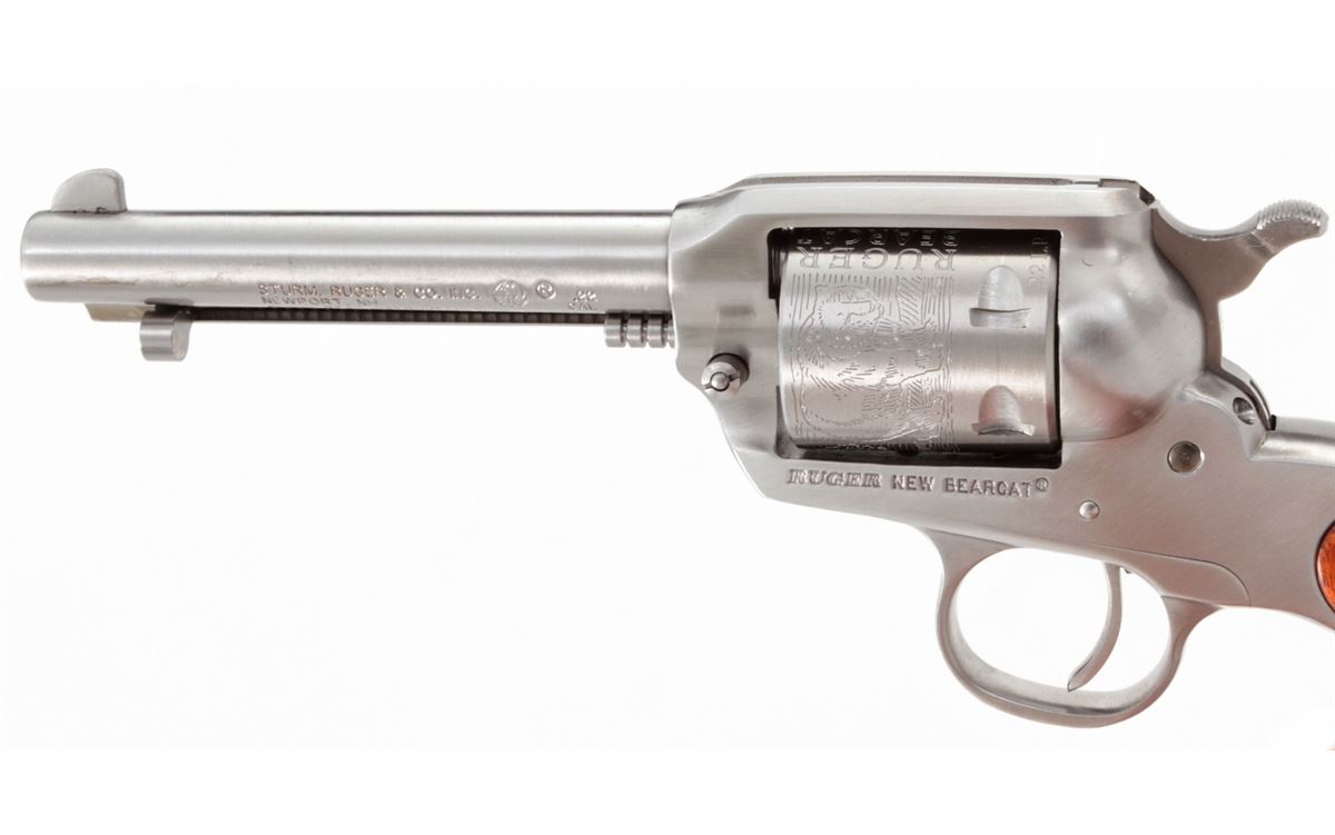 Ruger New Bearcat Single Action Revolver, #93-60872, .22 LR cal., 4-1/8'' barrel, stainless steel finish, rosewood grips, engraved cylinder, fixed sights, gun lock, original case with matching end label, and the owner's manual. The condition is excellent, remaining new and unfired, with a light index line to the cylinder and marks to the finish near the end of the barrel. Retail Price: $589.95 Est.: $300-$500. (Modern) (Field Time)