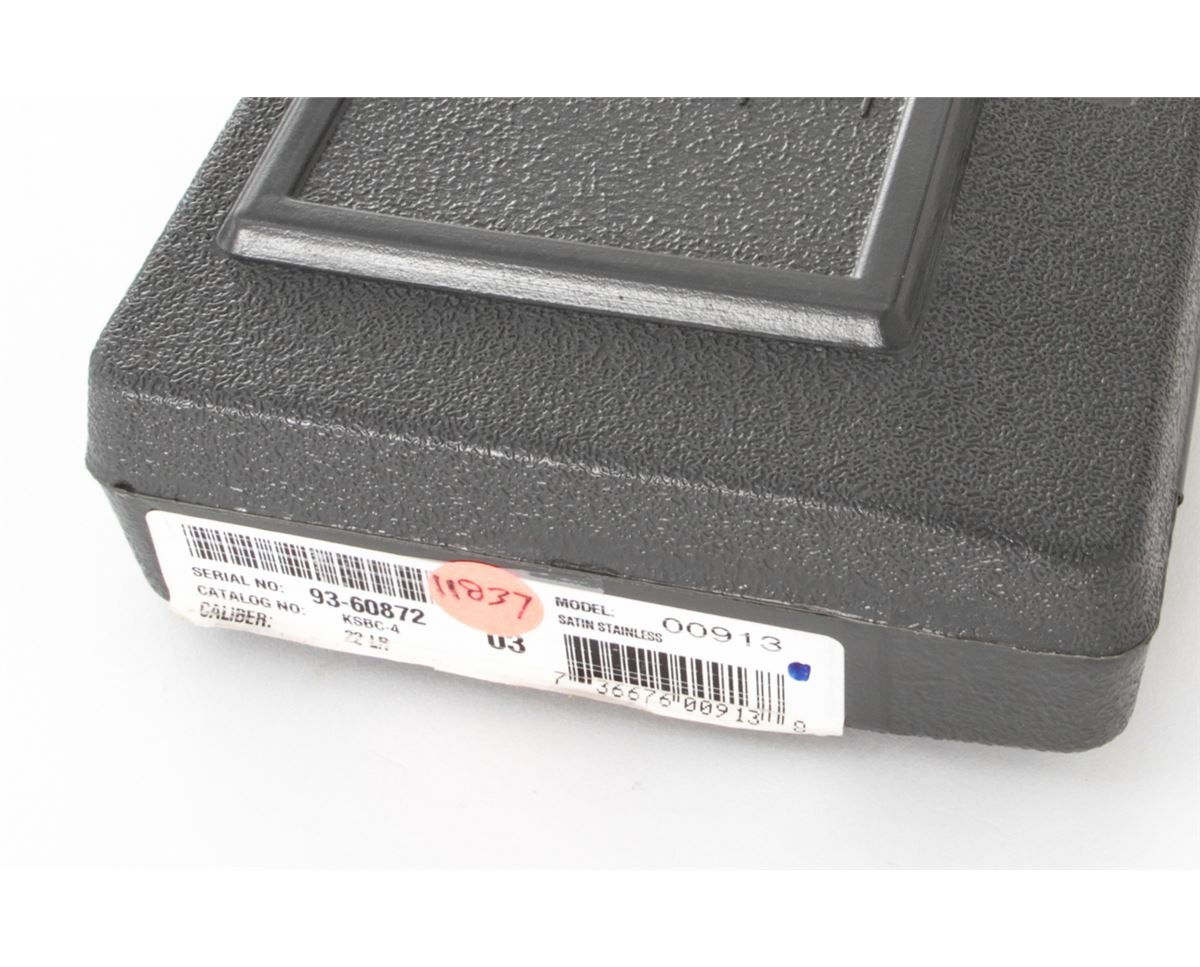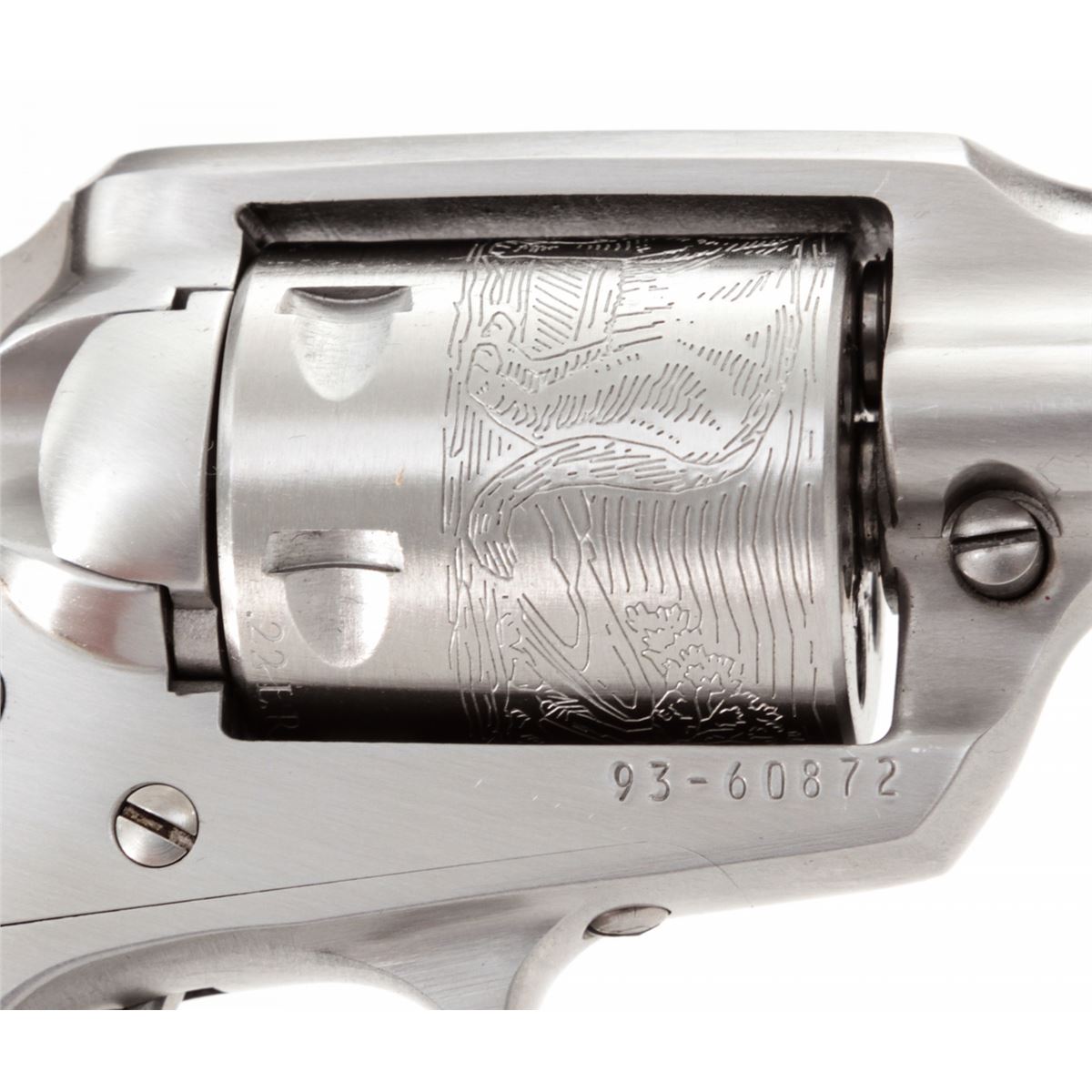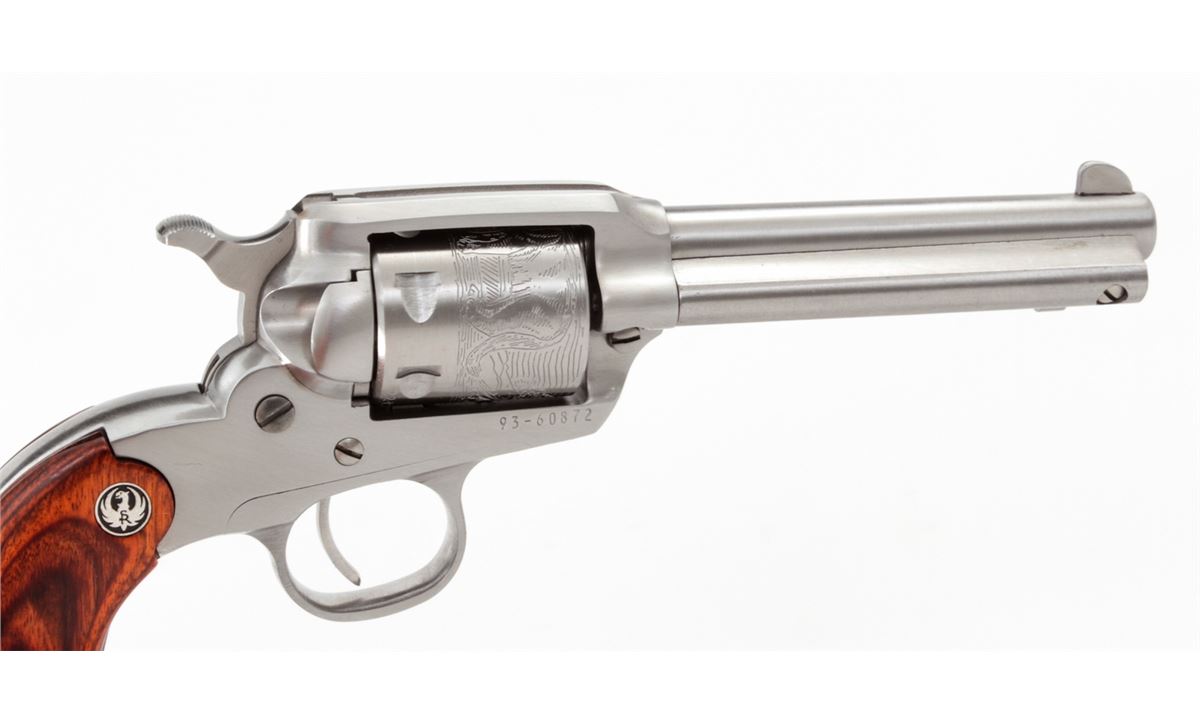 Ruger New Bearcat Single Action Revolver, #93-60872, .22 LR cal., 4-1/8'' barrel, stainless steel finish, rosewood grips, engraved cylinder, fixed sights, gun lock, original case with matching end label, and the owner's manual. The condition is excellent, remaining new and unfired, with a light index line to the cylinder and marks to the finish near the end of the barrel. Retail Price: $589.95 Est.: $300-$500. (Modern) (Field Time)