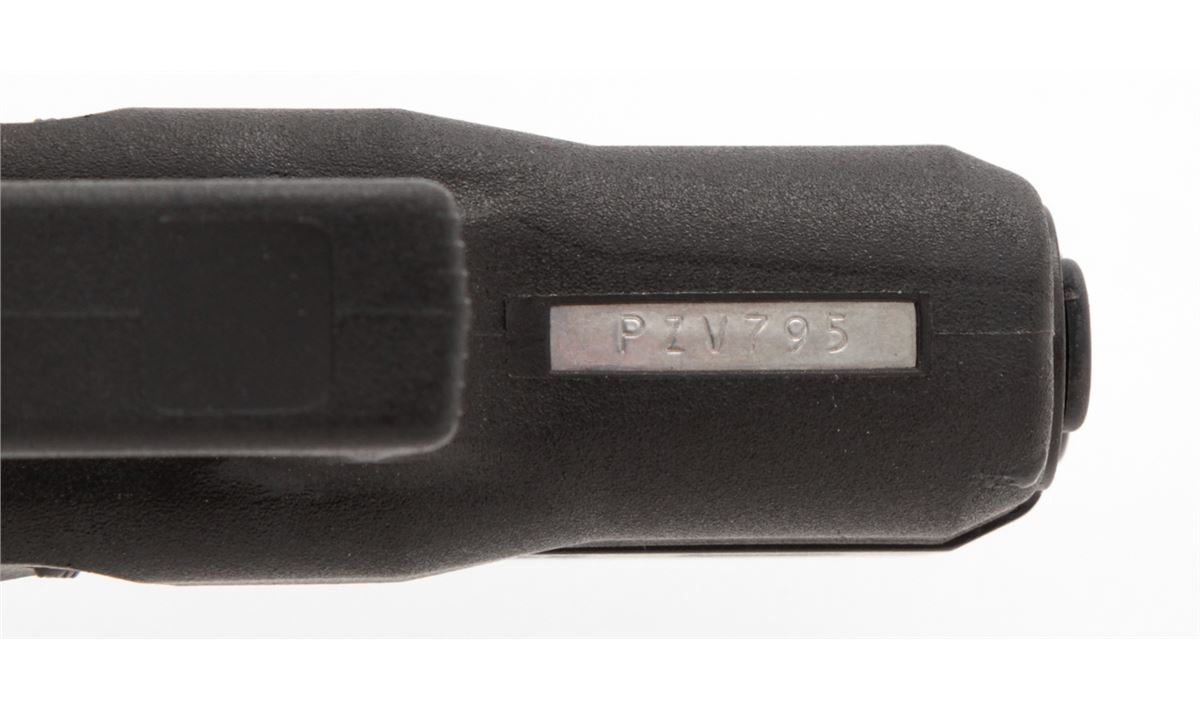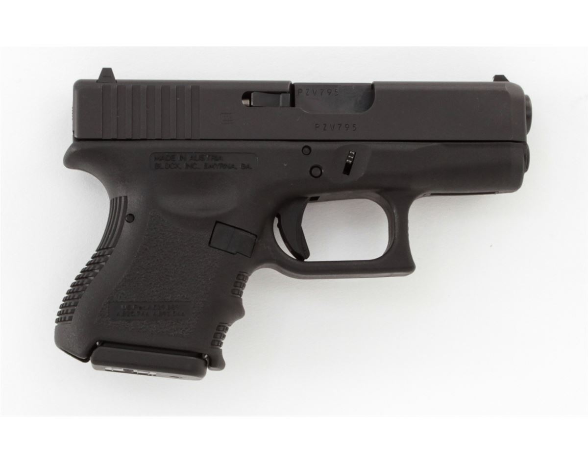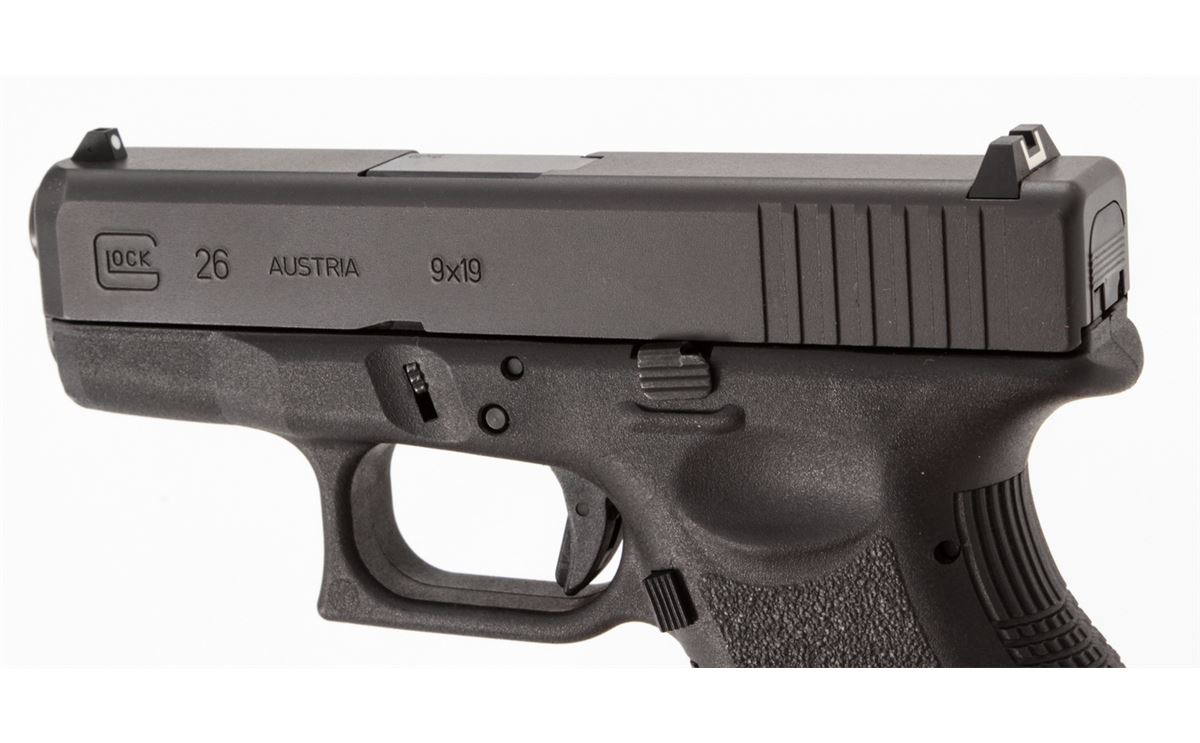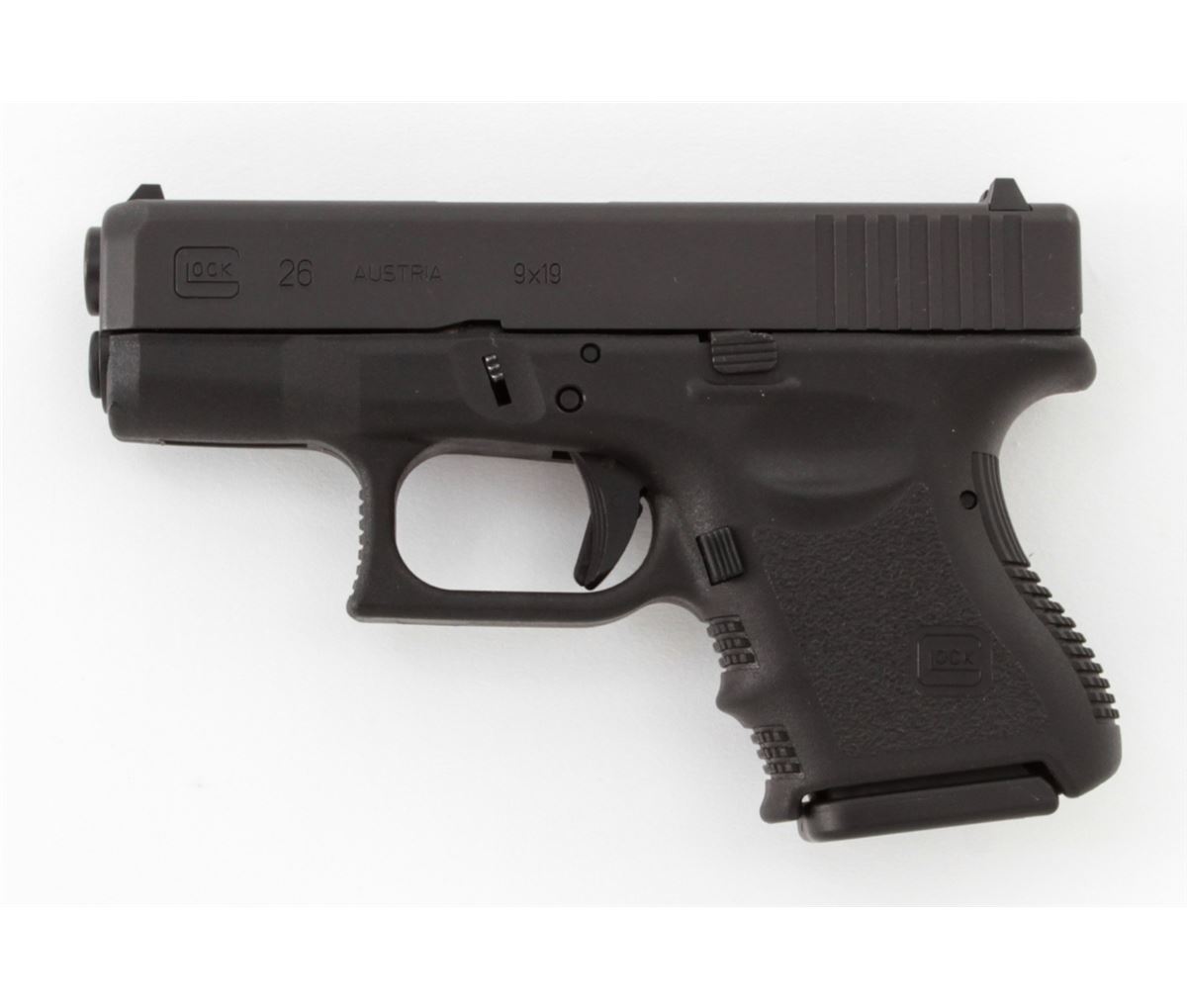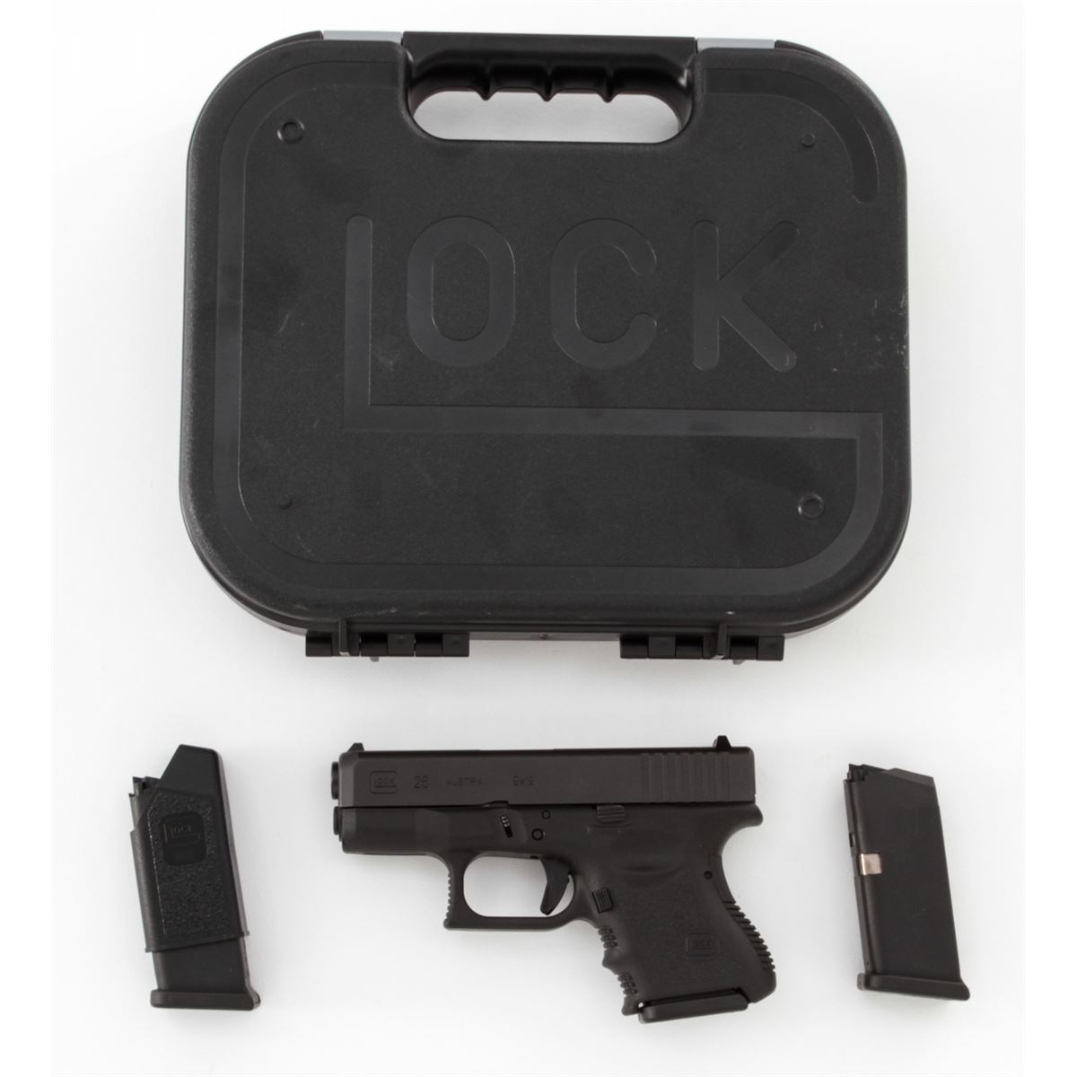 Glock Model 26 Semi-Automatic Pistol, #PZV795, 9mm cal., 3-3/8'' barrel, matte finish, textured fingergroove integral grip, white outline rear sight, white dot front sight, with three (3) Glock magazines, cleaning accessories, and original case. Condition is excellent and near new. Top of slide with light marks to dull matte finish from handling. Action is crisp, bore is bright. Est.: $350-$500. (Modern)