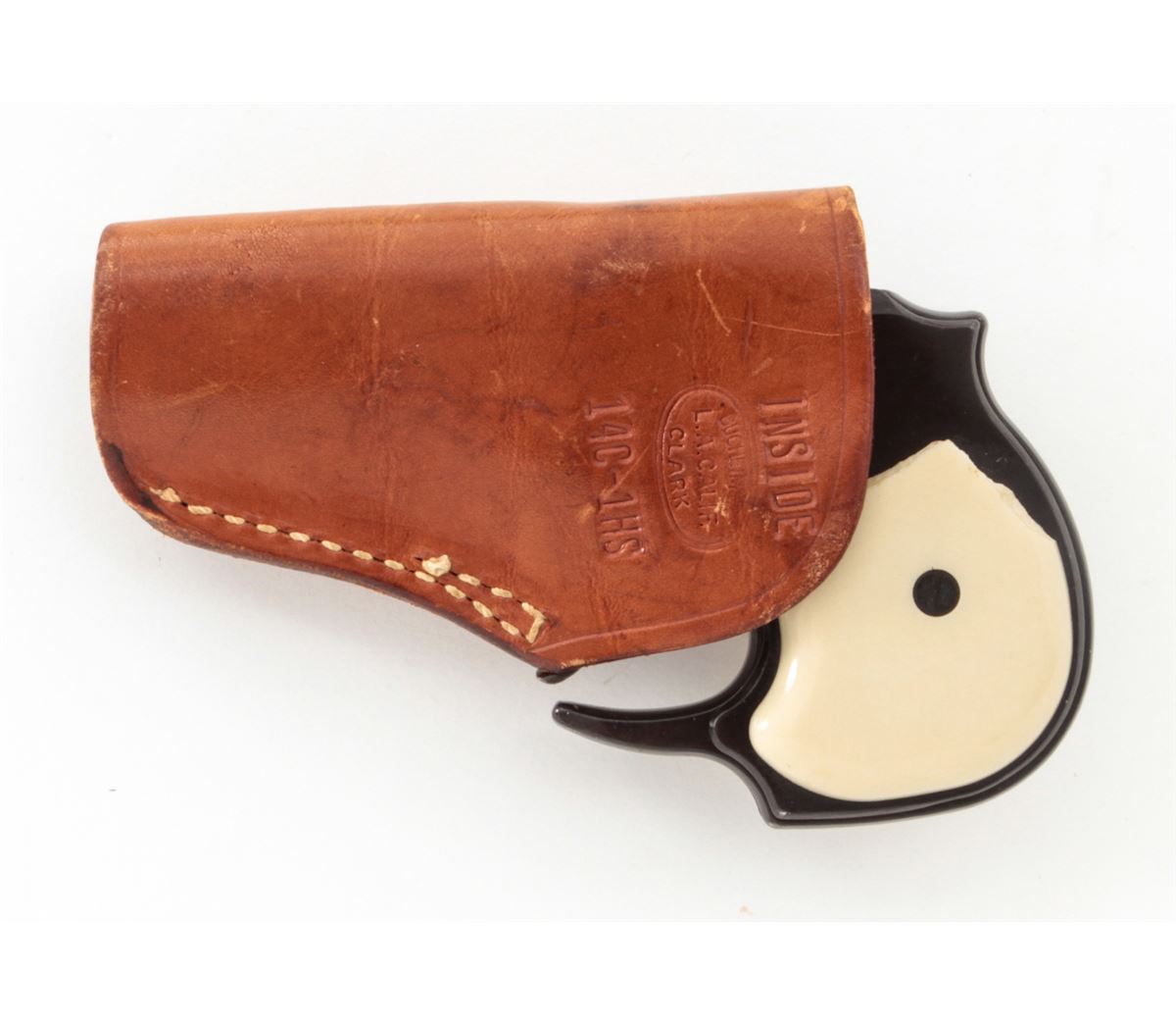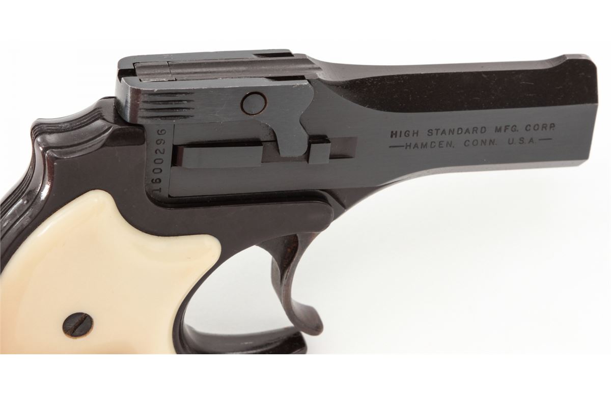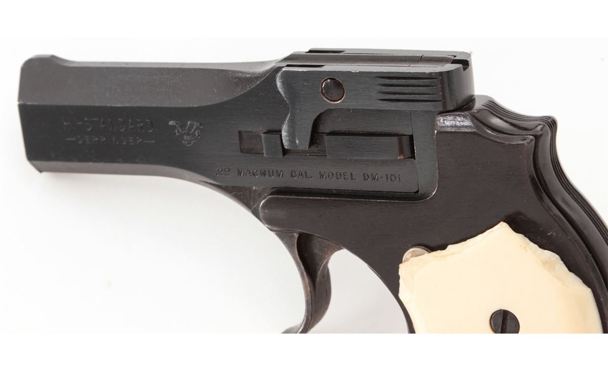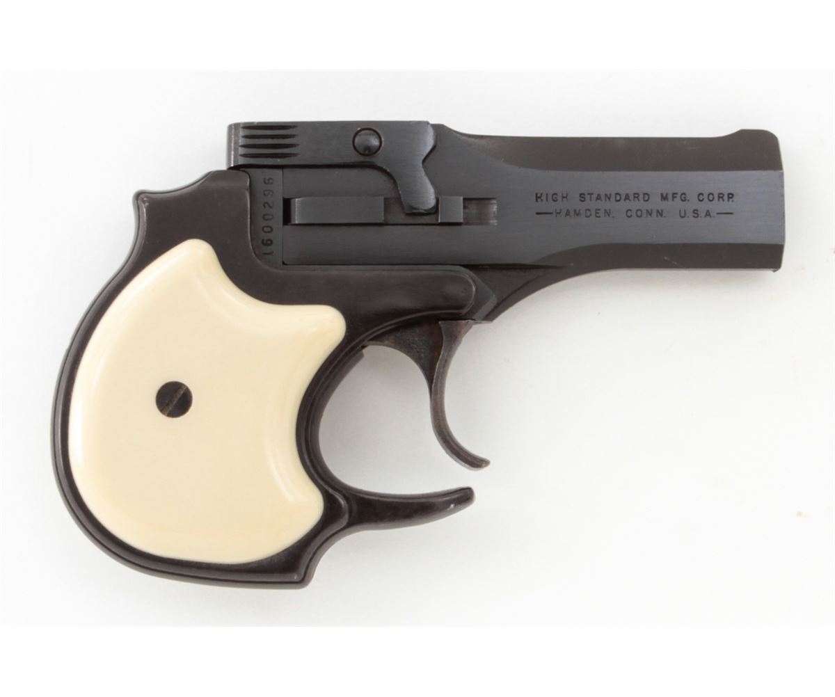 Hi-Standard Over/Under Derringer, #1600296, .22 mag. cal., 3-1/2'' barrel, blue finish, white plastic grips, with leather holster. Condition is very good retaining approx. 97% blue with light wear to backstrap. Left panel with losses and should be replaced. Good action, fine bores. Est.: $100-$200. (Modern/PPT)