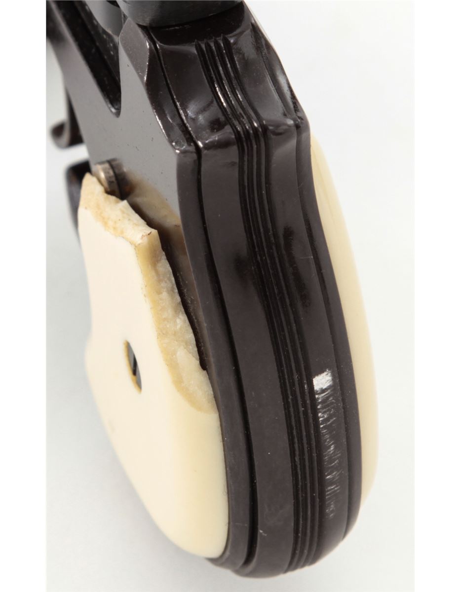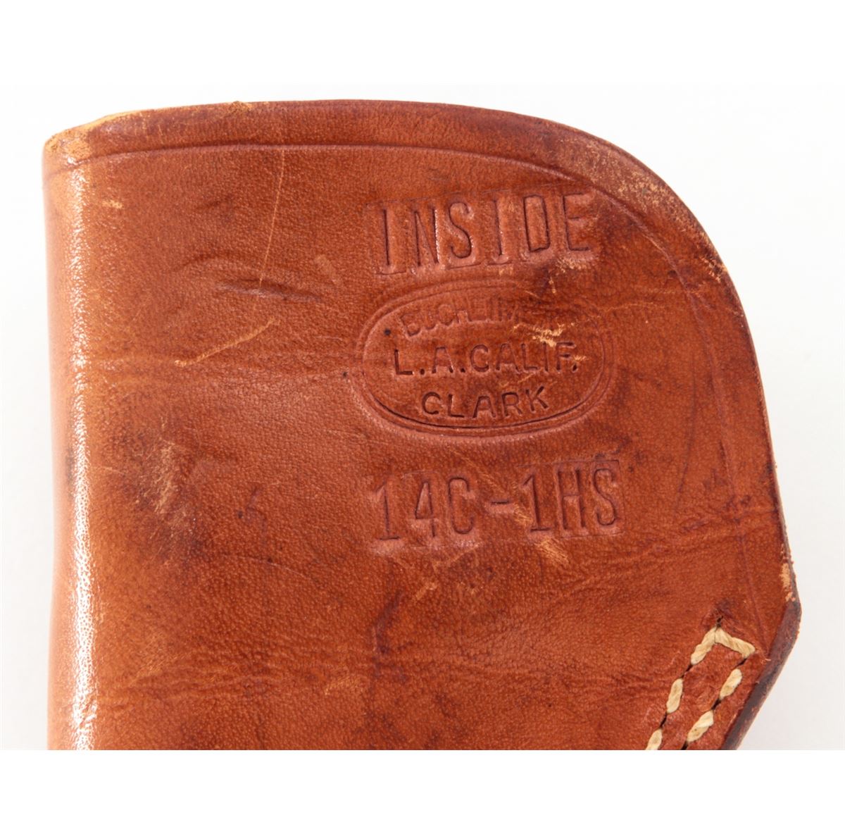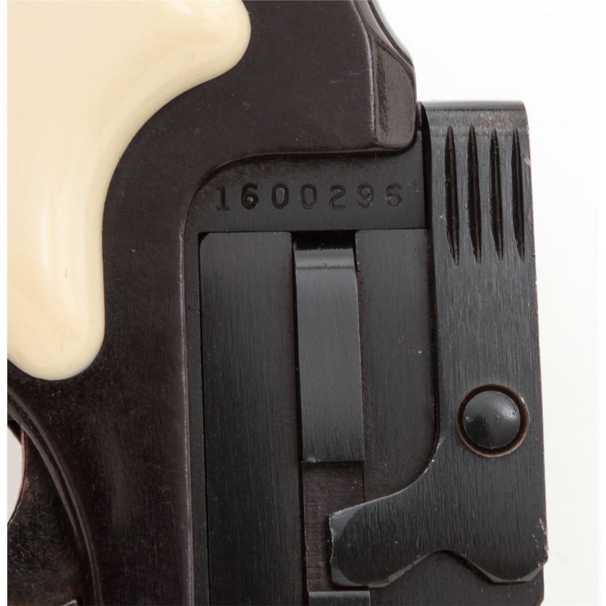 Hi-Standard Over/Under Derringer, #1600296, .22 mag. cal., 3-1/2'' barrel, blue finish, white plastic grips, with leather holster. Condition is very good retaining approx. 97% blue with light wear to backstrap. Left panel with losses and should be replaced. Good action, fine bores. Est.: $100-$200. (Modern/PPT)