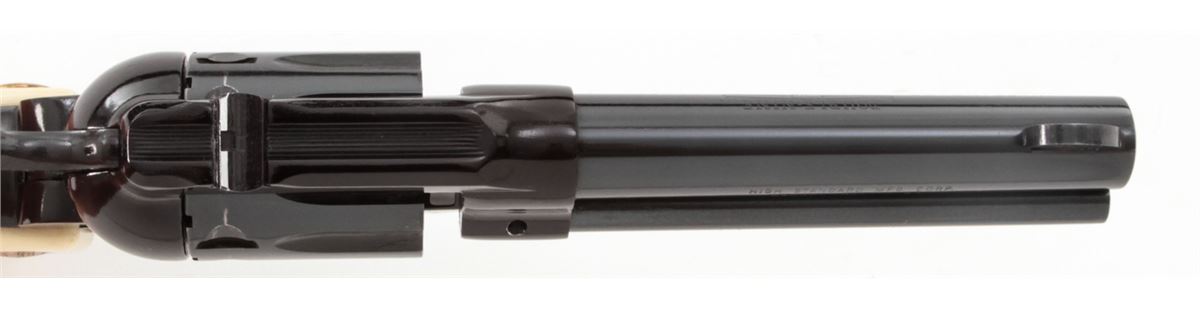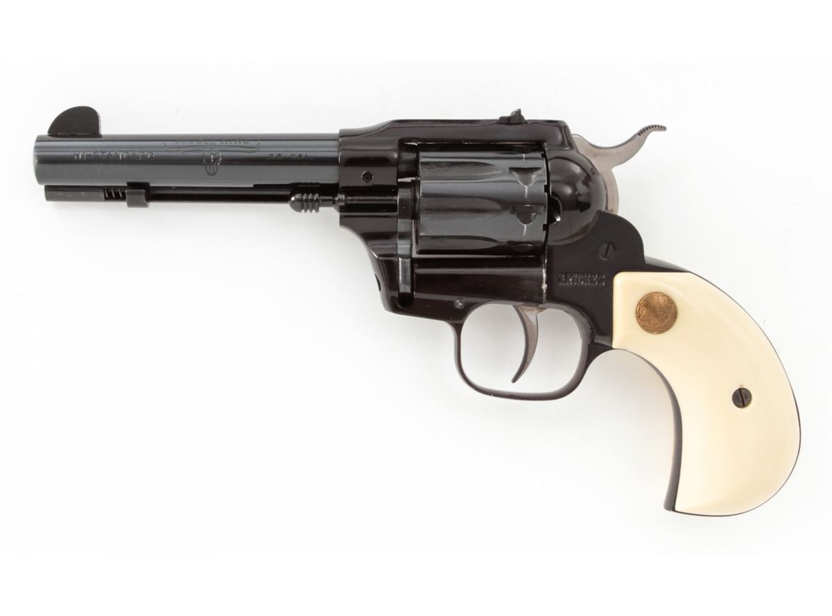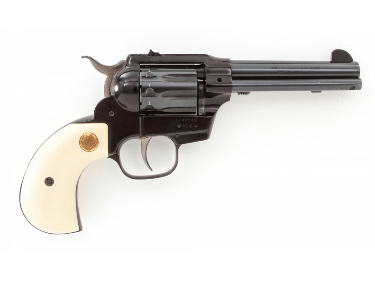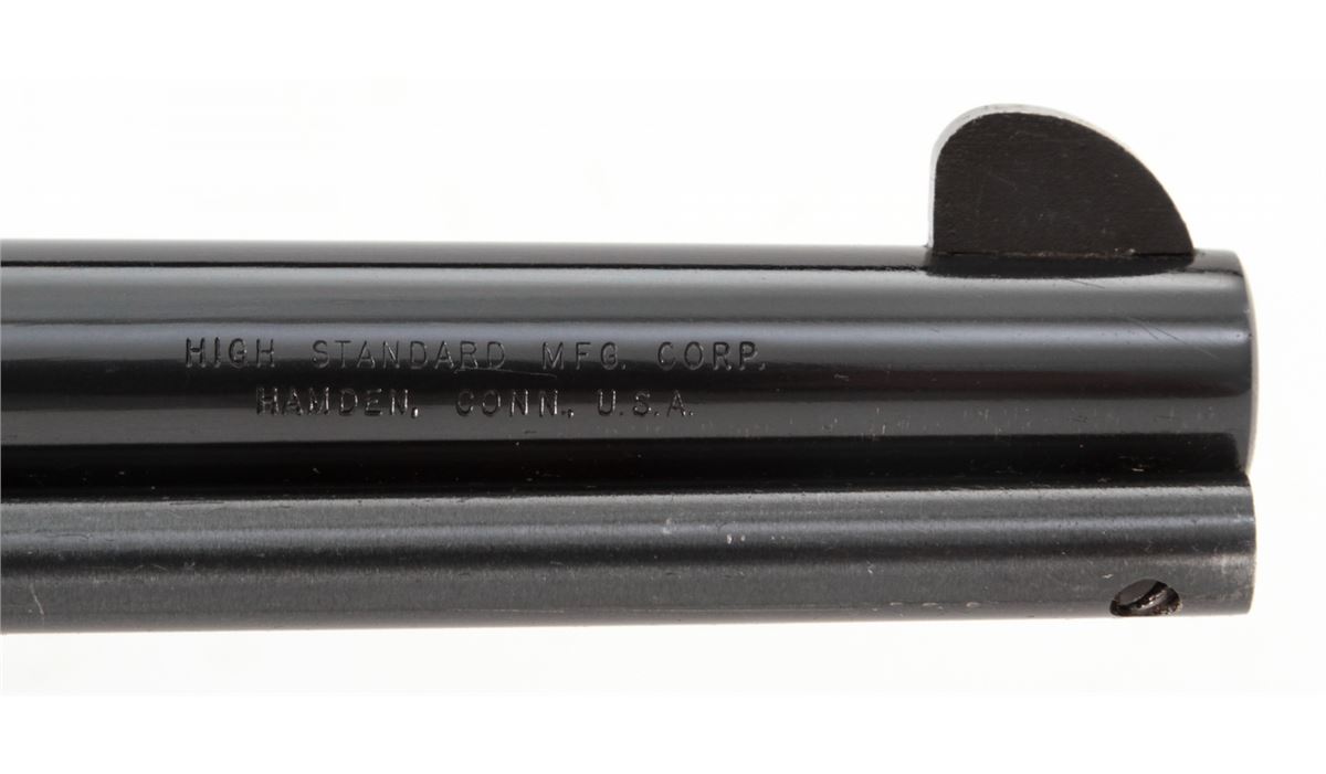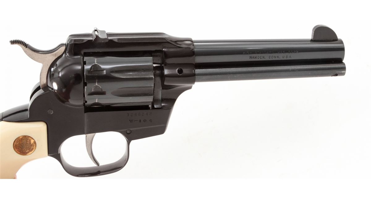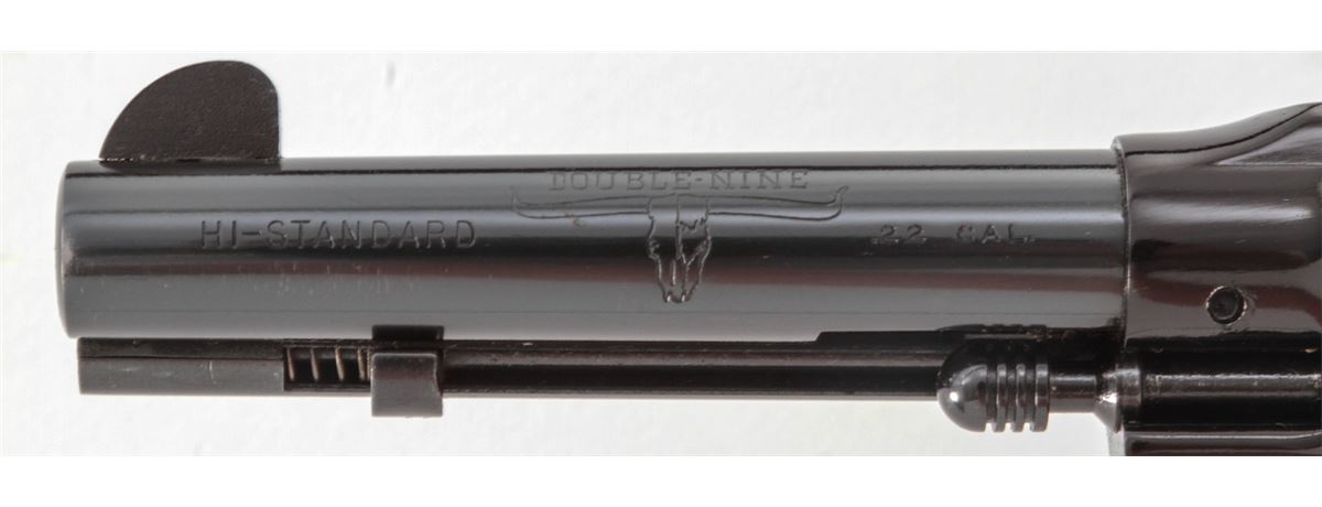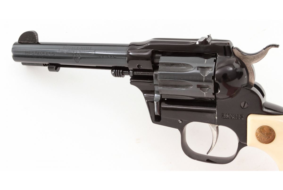 Hi-Standard Double 9 Natchez Double Action Revolver, #1248242, .22 LR cal., 9-shot, 4-1/2'' barrel, blue finish, white plastic grips with plated Hi-Standard medallions. Condition is very good showing light use, but retaining nearly 95% of its original finish. Good grips and action, bright bore. Est.: $150-$300. (C&R/PPT)