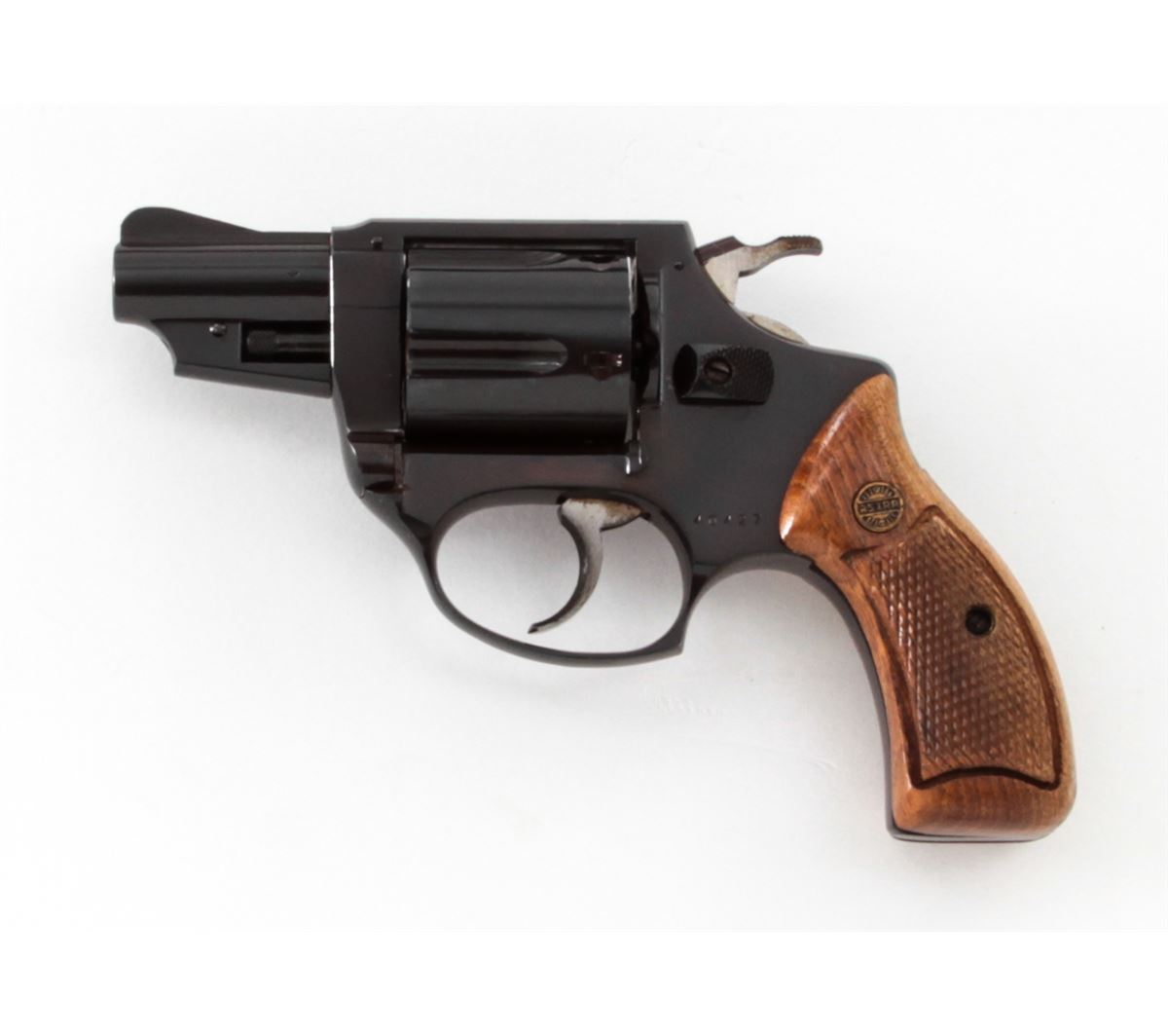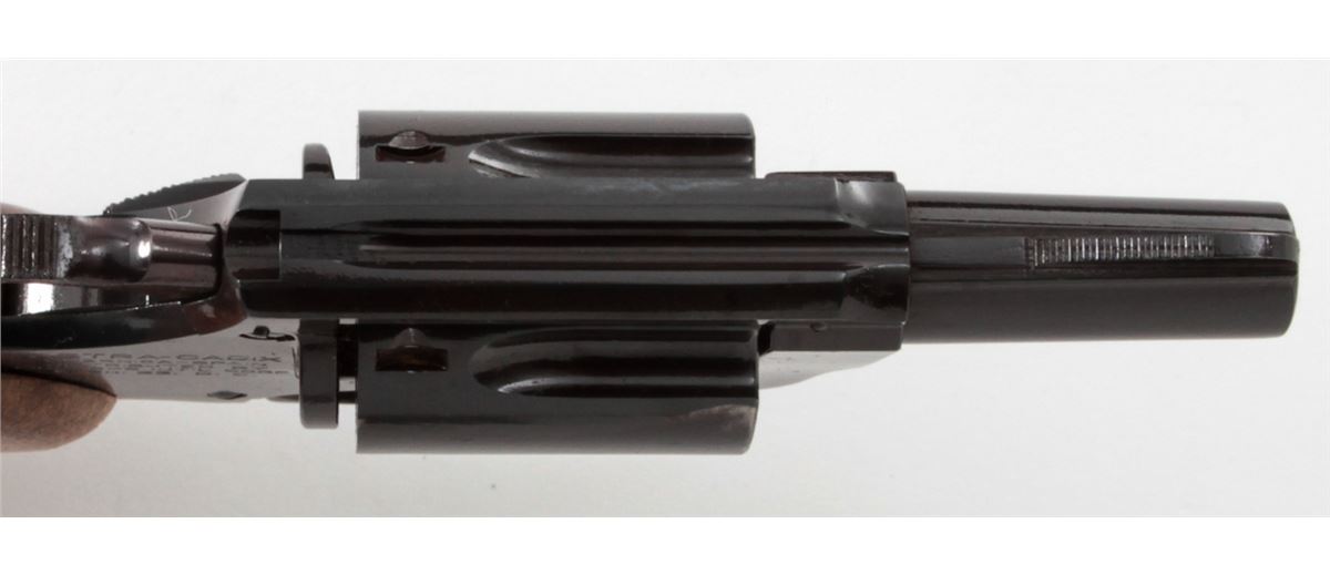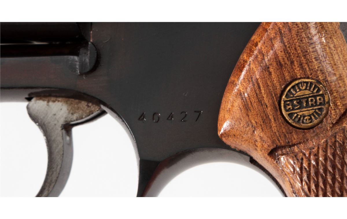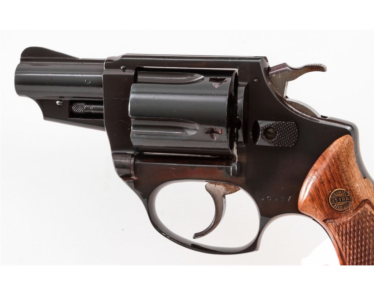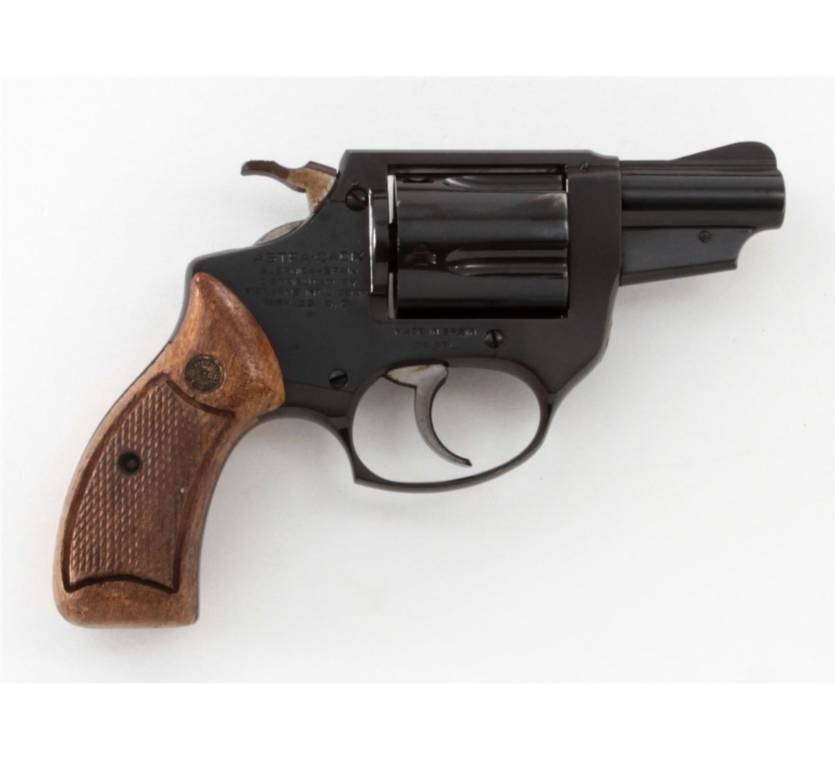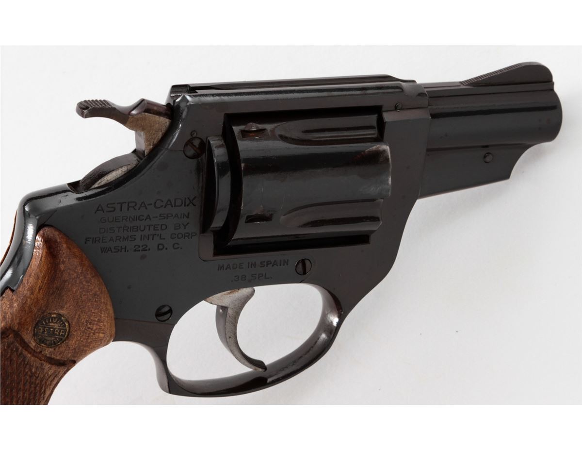 Astra-Cadix Double Action Revolver, #40427, .38 Spec. cal., 2'' barrel, blue finish, factory checkered wooden grips. Condition is very good with minor discoloration to finish at left side of frame. Grips with mild flattening. Good action and bore. Est.: $150-$300. (Modern/PPT)