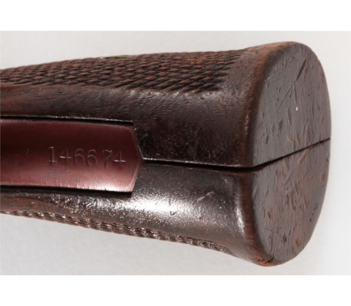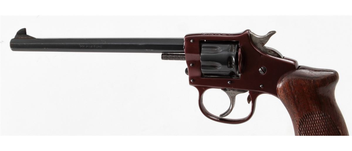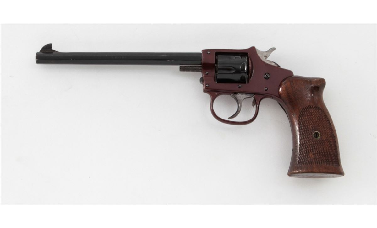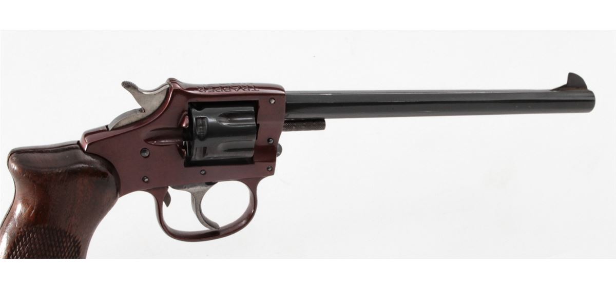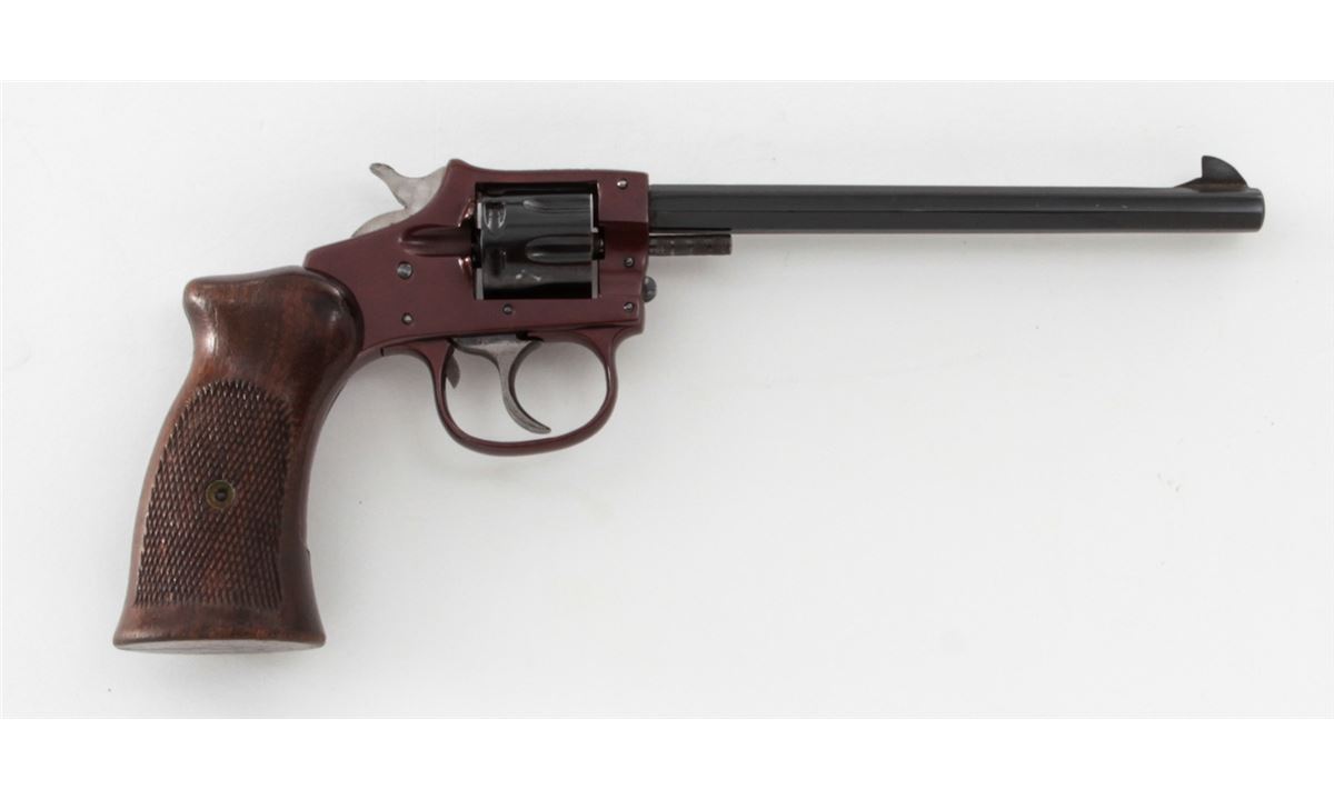 H&R 7-Shot ''The Trapper'' Double Action Revolver, #146674, .22 LR cal., 6'' barrel, blue finish, factory checkered wood grips. Condition is fine as refinished retaining approx. 95% blue to cylinder and barrel; plum color to frame. Grips with mild flattening. Good action and bore. Est.: $100-$200. (C&R/PPT)