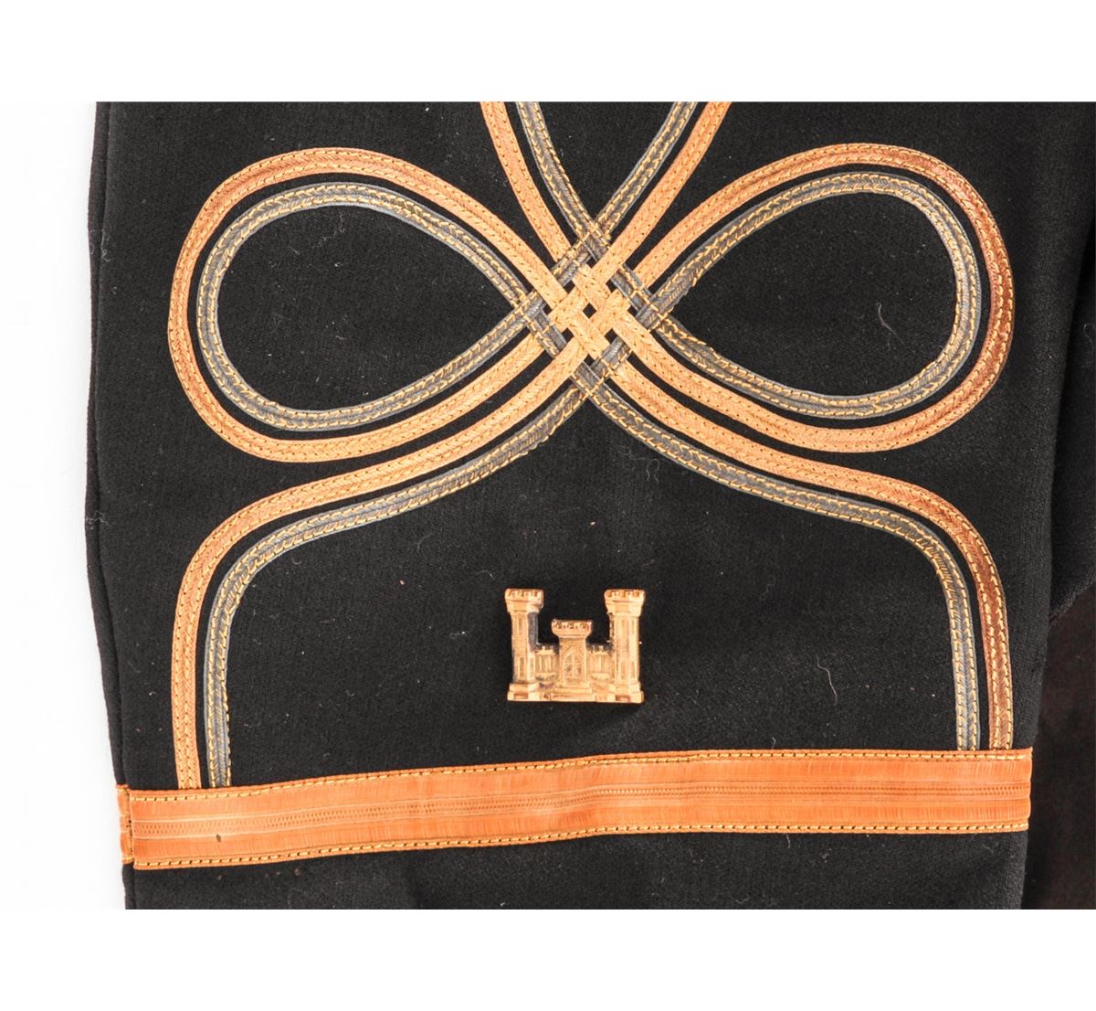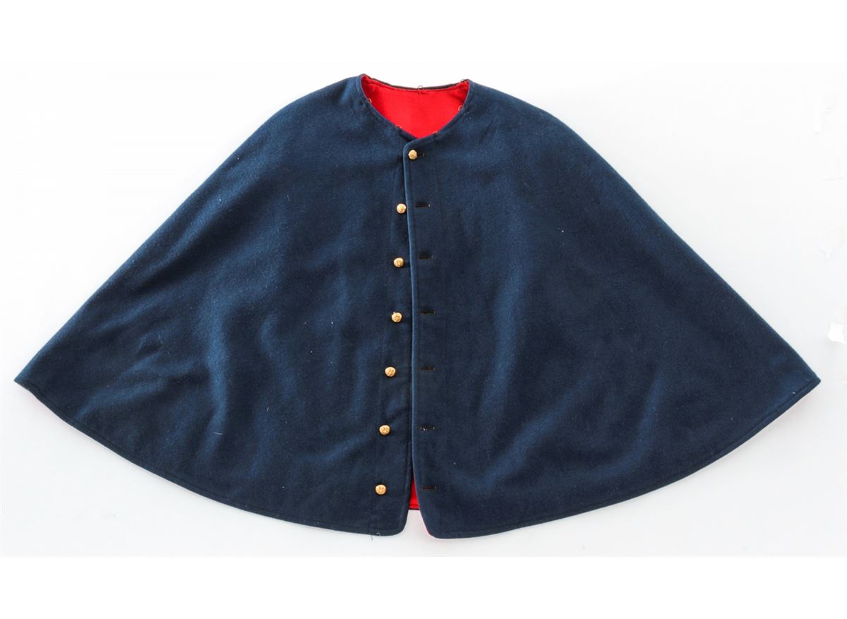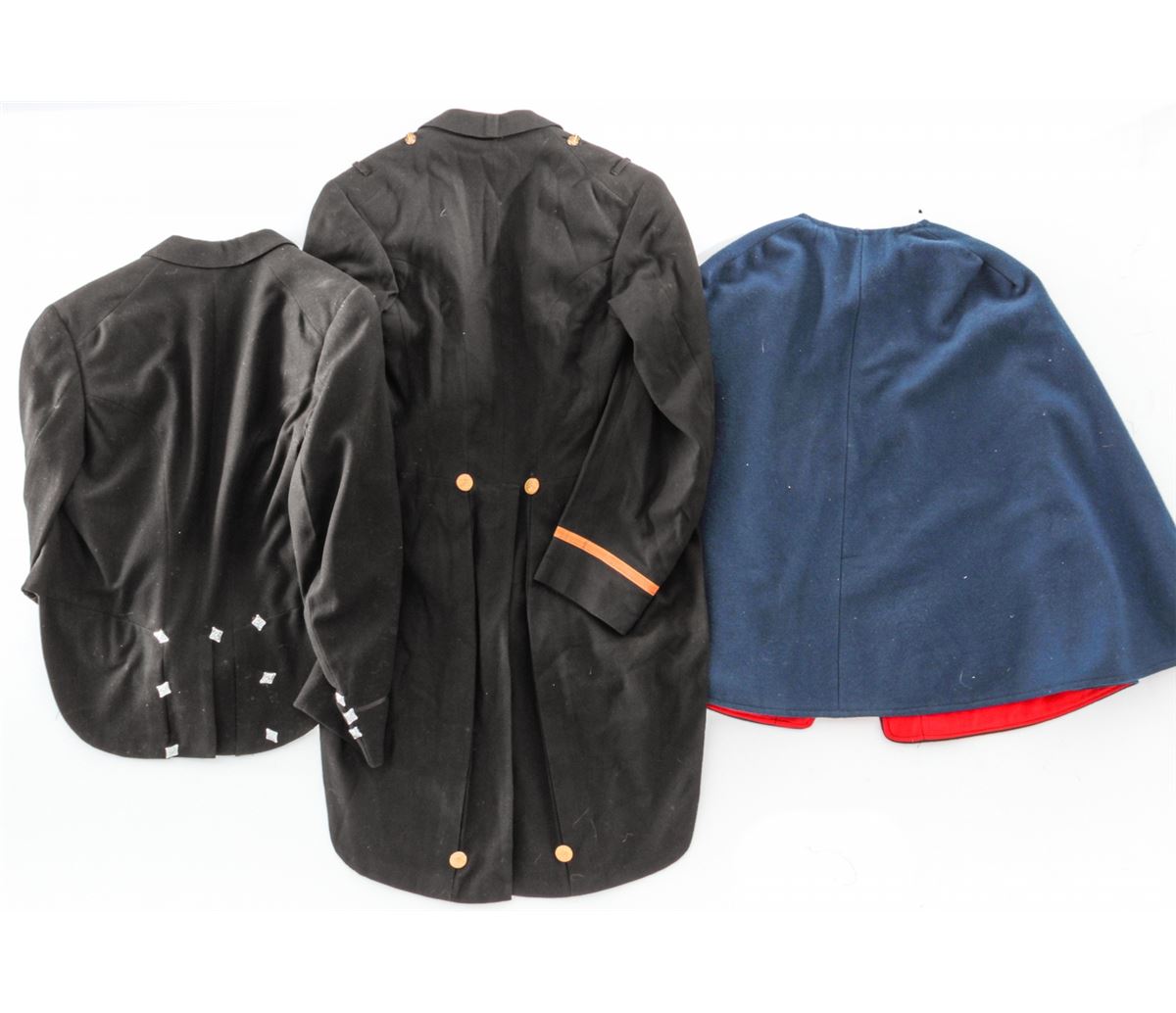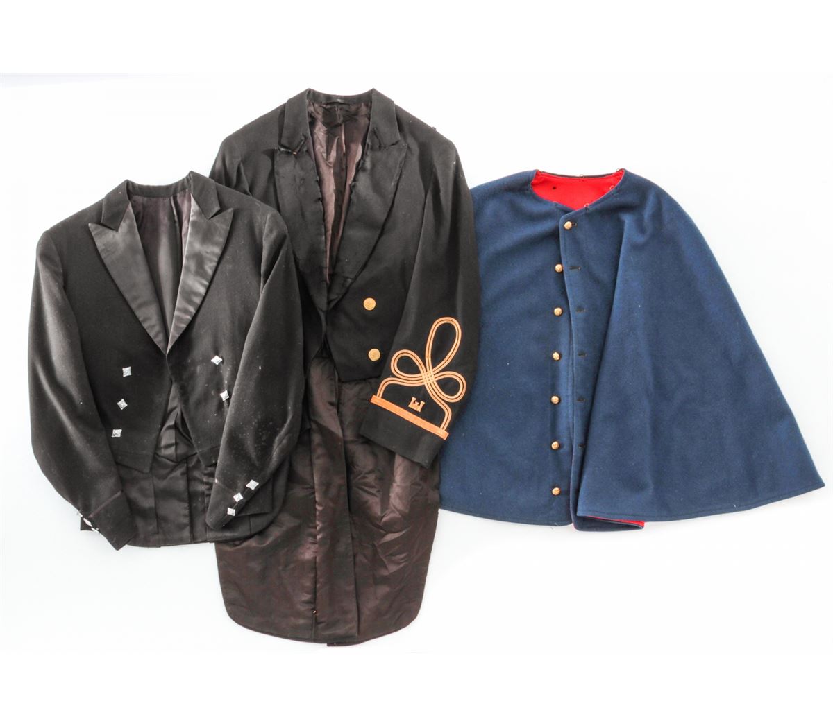 Lot of Three (3) Mid-20th Century Uniforms: (1) High Quality Theatrical Civil War Cape, red lined, medium blue serge exterior, in excellent condition. (2) Black Wool Engineer's Dinner Jacket, with Engineer buttons and embroidered rank insignia to both cuffs, remaining in fair condition with extensive fraying at lapels. (3) Scottish type Black Waistcoat, with bright diamond-shaped Scottish clan buttons, in very good condition with light mildewing that should be laundered. Est.: $100-$200/lot.