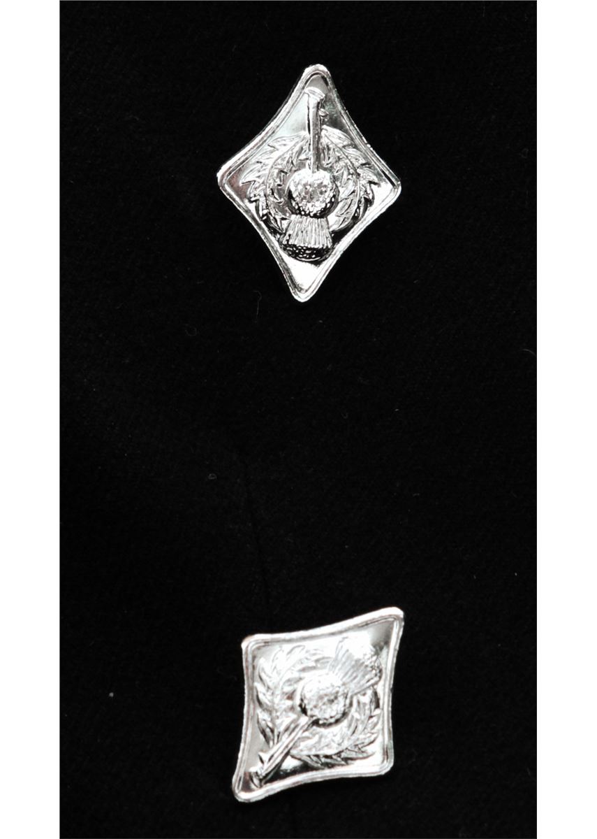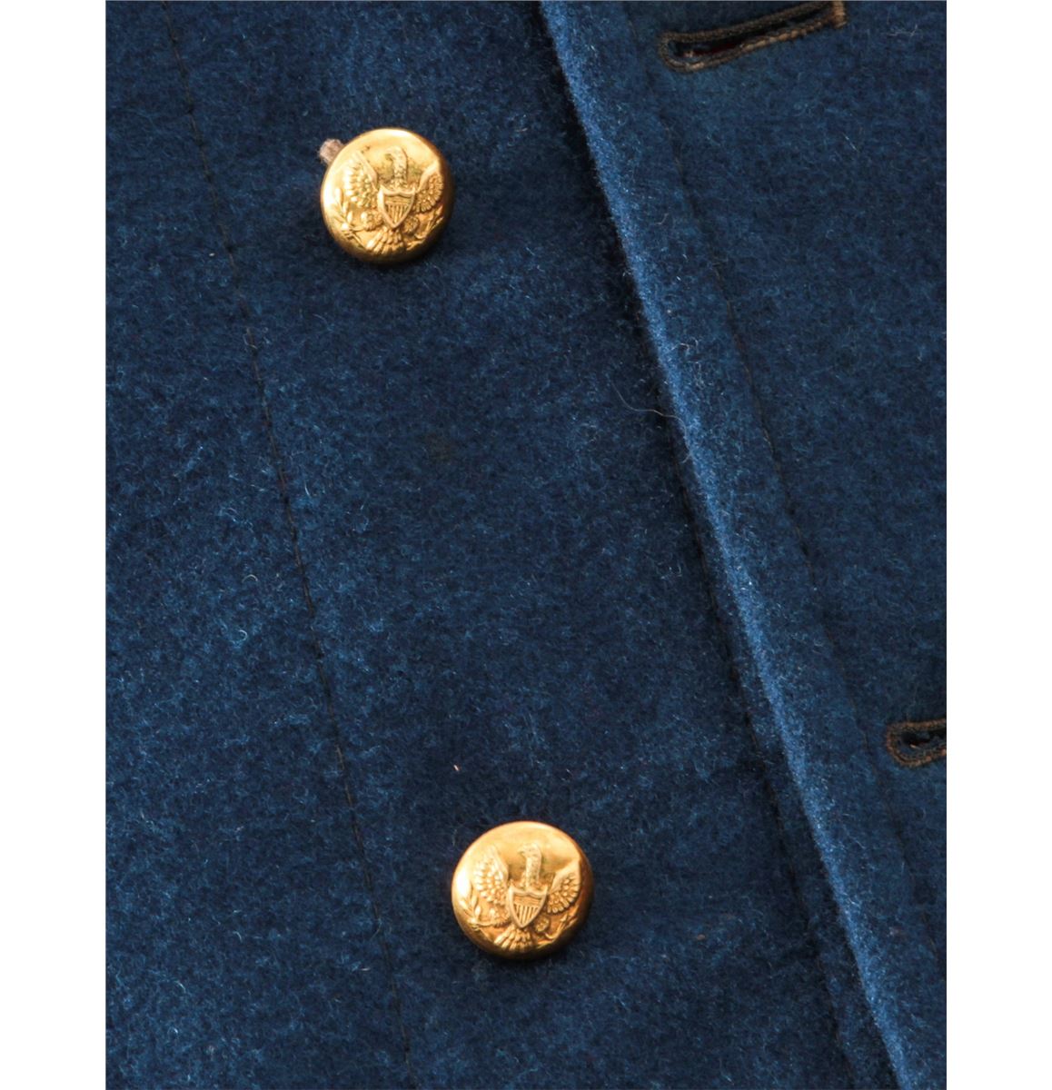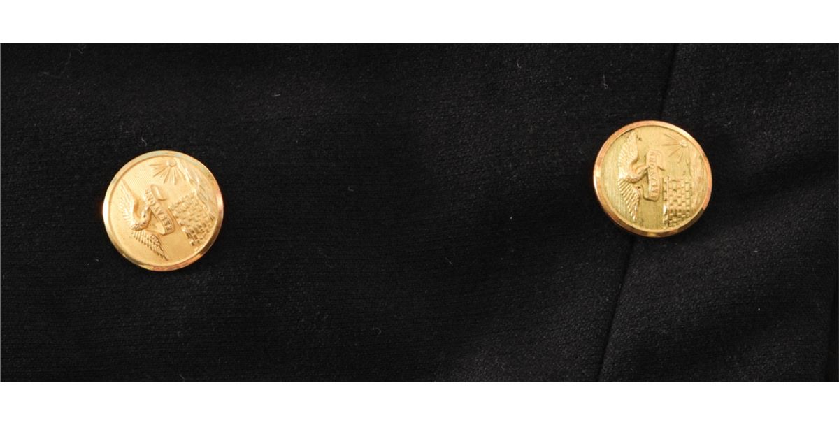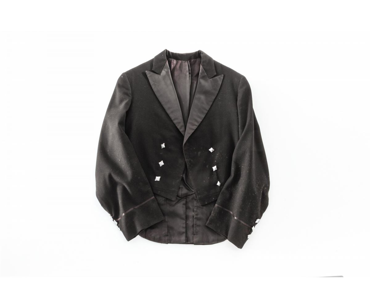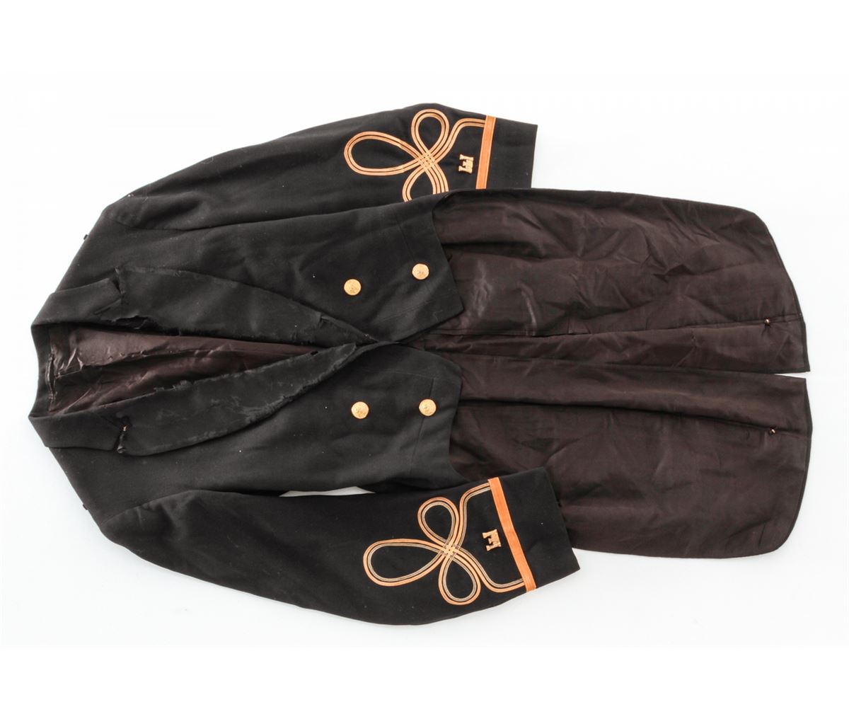 Lot of Three (3) Mid-20th Century Uniforms: (1) High Quality Theatrical Civil War Cape, red lined, medium blue serge exterior, in excellent condition. (2) Black Wool Engineer's Dinner Jacket, with Engineer buttons and embroidered rank insignia to both cuffs, remaining in fair condition with extensive fraying at lapels. (3) Scottish type Black Waistcoat, with bright diamond-shaped Scottish clan buttons, in very good condition with light mildewing that should be laundered. Est.: $100-$200/lot.