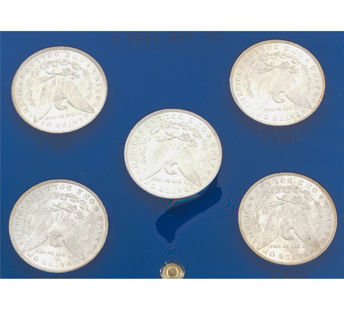 Five (5) Uncirculated ''P'' Mint Morgan Silver Dollars of the 1880s: 1885-P, 1886-P, 1887-P, 1888-P, 1889-P, in plastic display and box. All are in excellent condition with only very slight toning to edges. Est.: $150-$250/set.