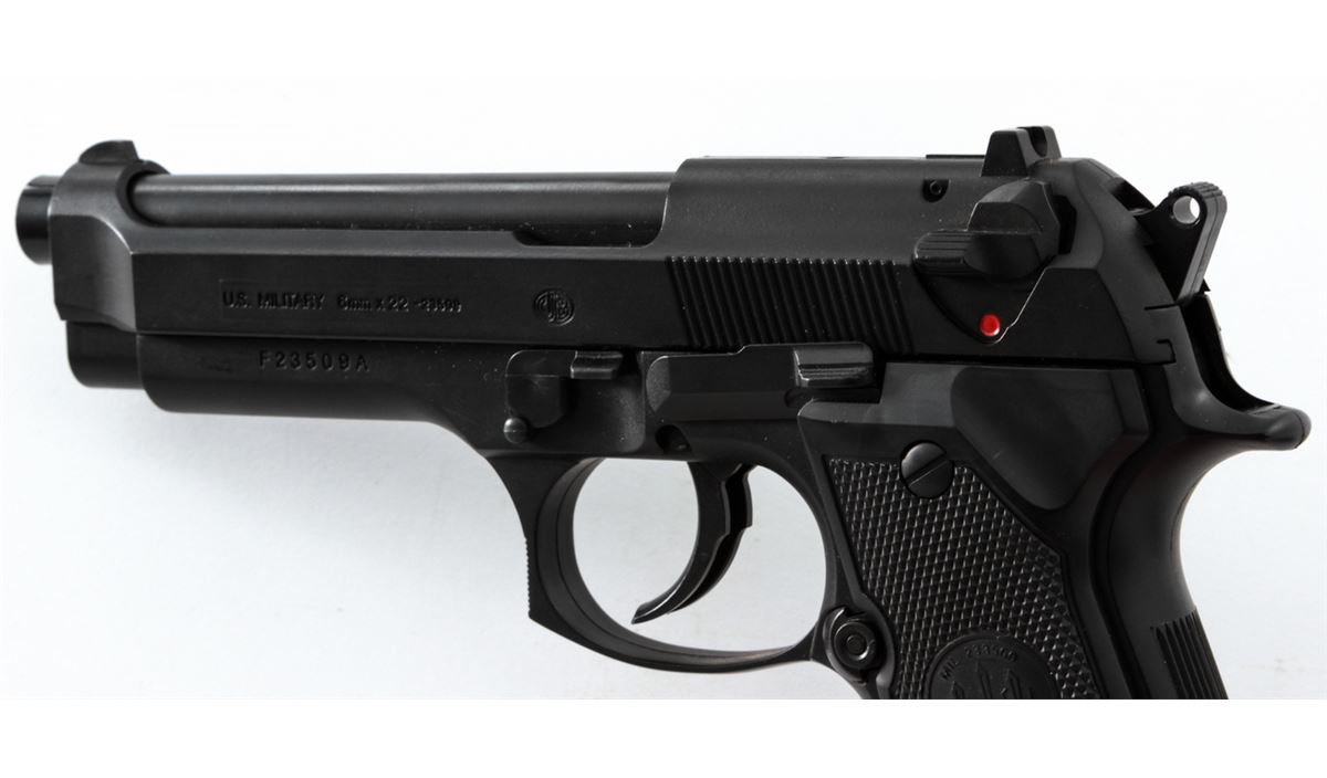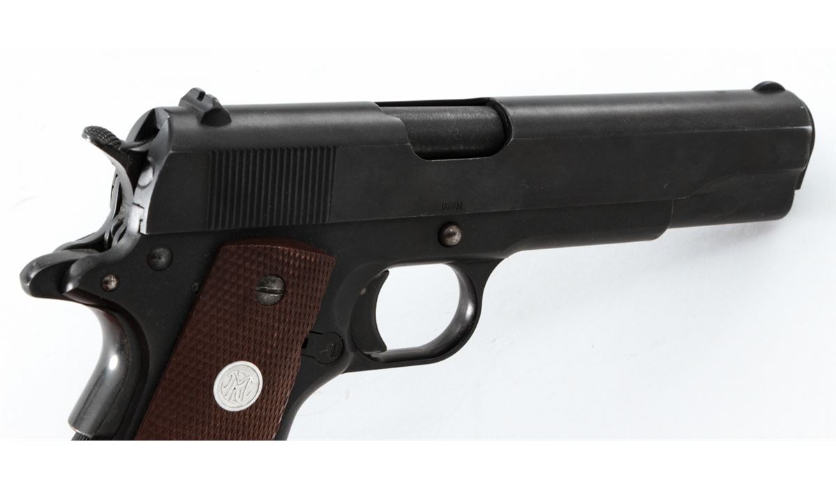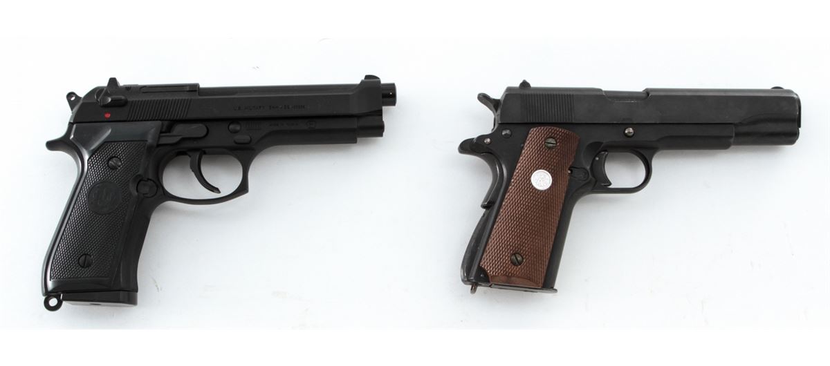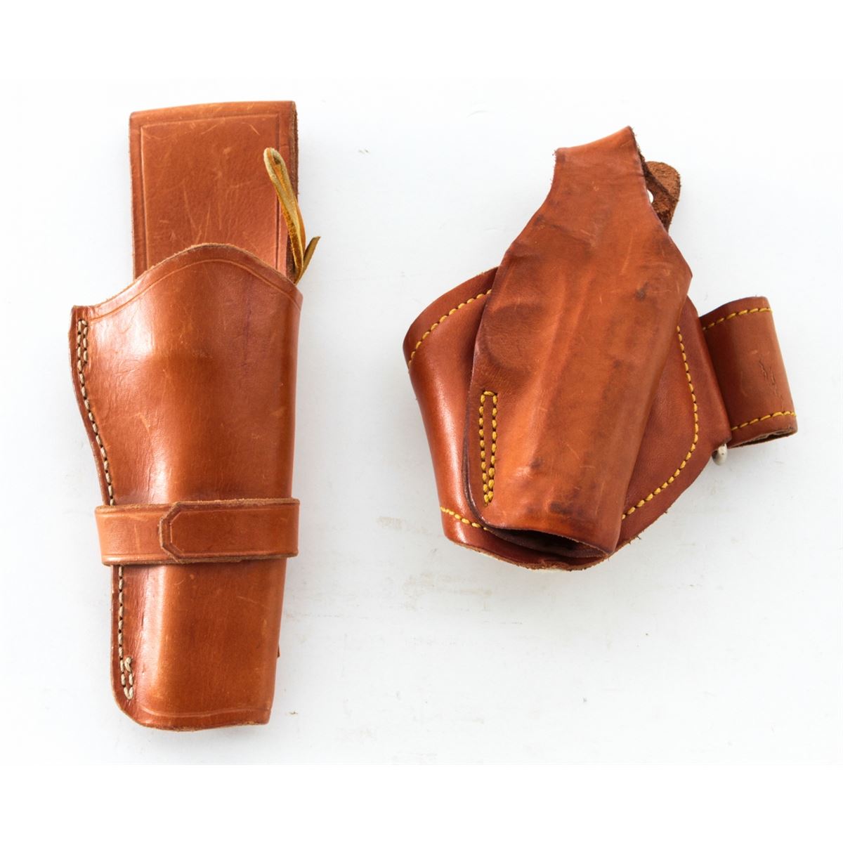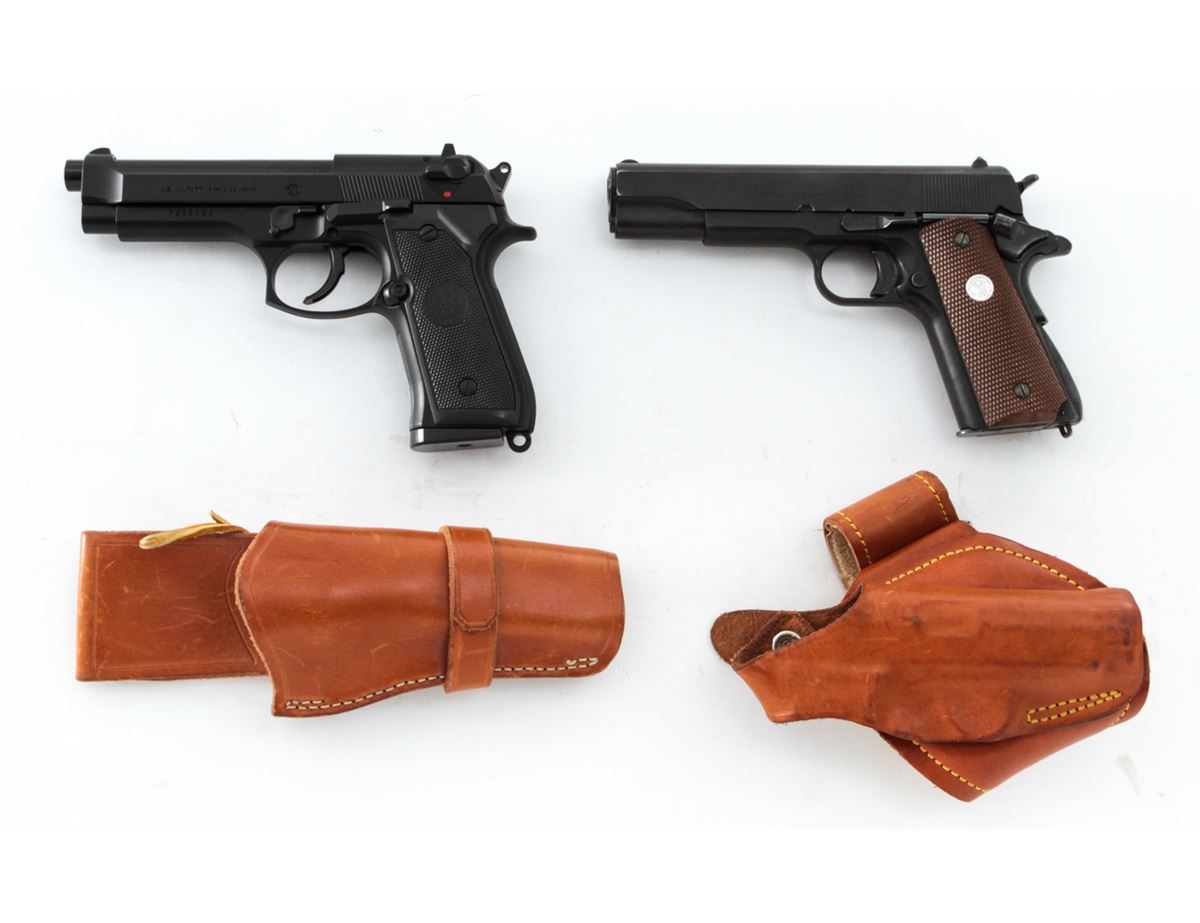 Lot consisting of One UHC Air-Soft Type Pistol shaped like a Beretta M9, with magazine; and two (2) Japanese Toy Gun Co. M1911-A1, one with magazine and one without. Along with a holster for small frame 4'' barreled double action revolver, and an ankle holster for a medium-frame semi-automatic pistol. Condition to all is fine. Est.: $100-$200/lot.