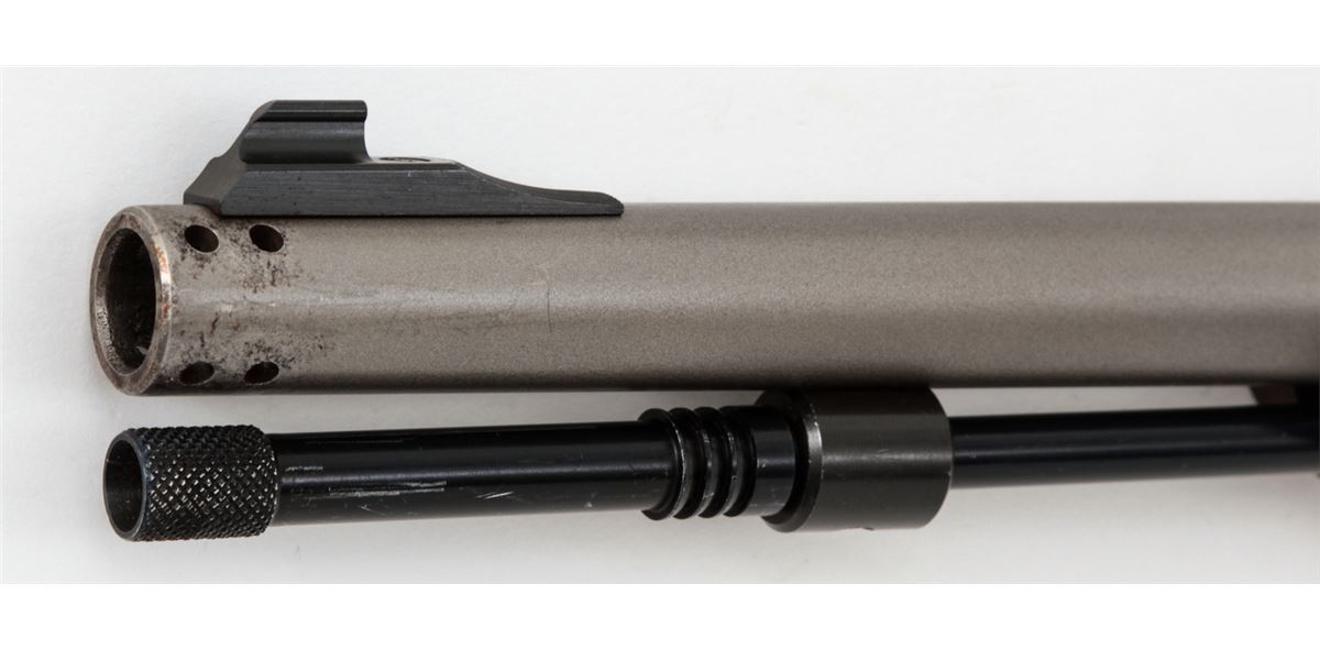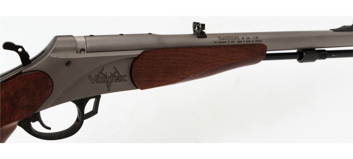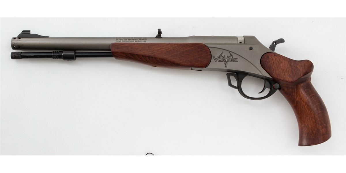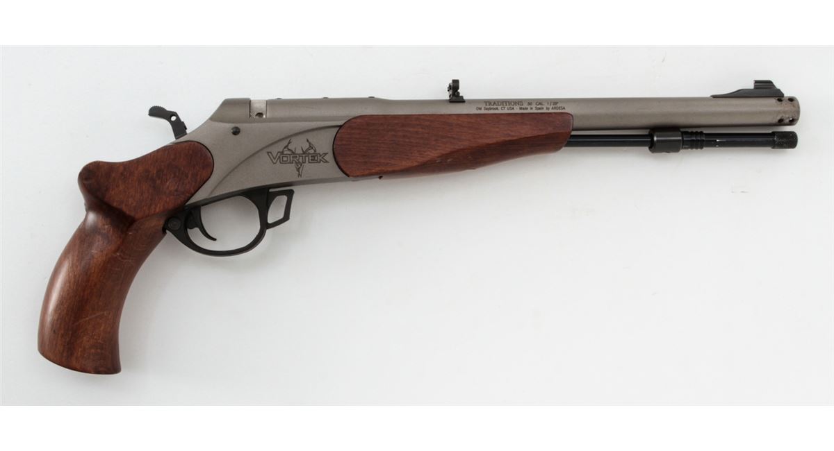 Traditions Vortek Single Shot Black Powder Pistol, #14-13-038672-10, .50 cal., 13-1/4'' compensated barrel, CeraKote finish, dark stained hardwood grips and forend. Condition is excellent, appearing near new. Est.: $250-$400. (Antique)