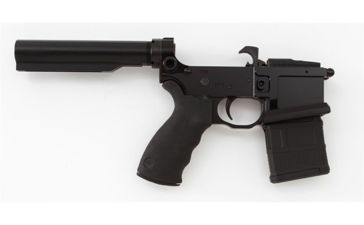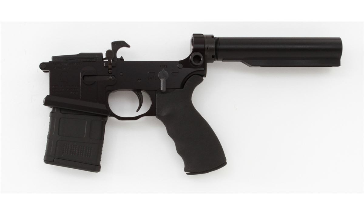 Franklin Armory Libertas Model Semi-Automatic AR-15 Lower Receiver, near complete, #R-08021, matte finish, Ergo grips, 10-round magazine, spring buffer assembly, internal parts, and bullet button mag release. Condition is excellent, appearing as new and unused. Est.: $250-$400. (Modern) (Field Time)