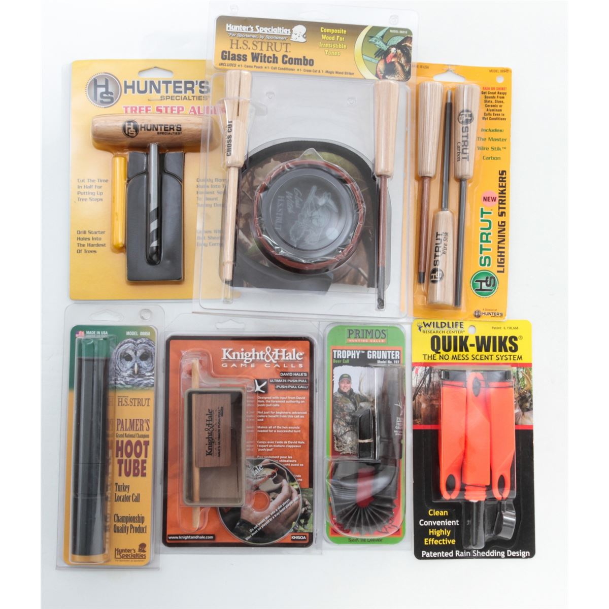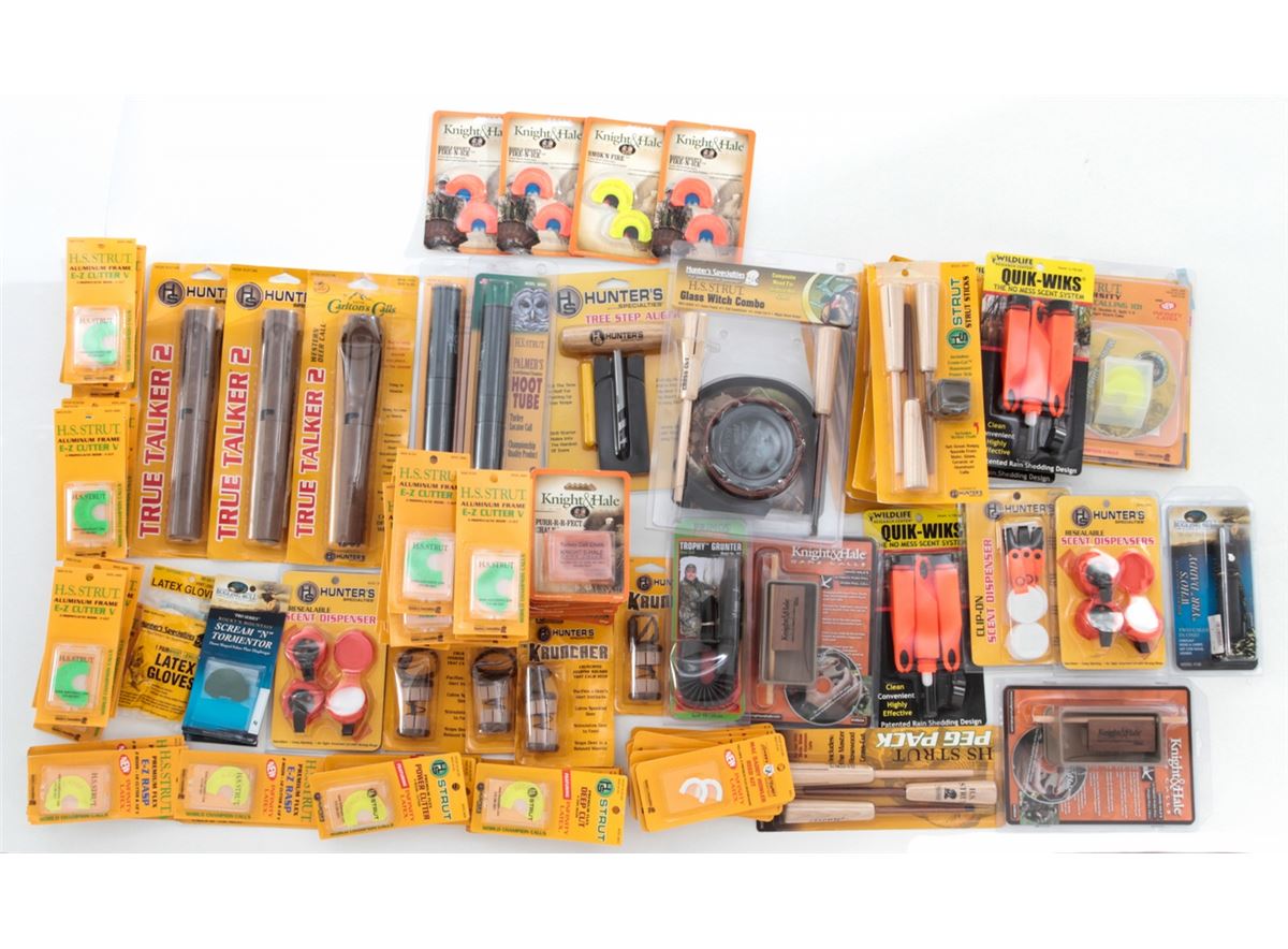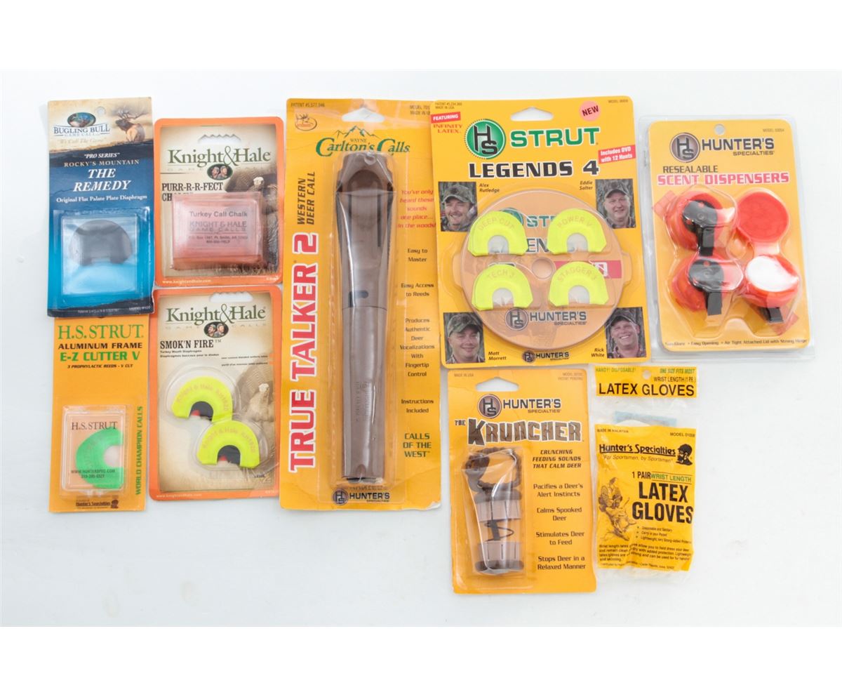 Bird Hunter's Lot, most items by Hunter's Specialties, consisting of HS Strut Peg Packs; Clip-on and Resealable Scent Dispensers; Glass Witch Combo; H.S. Strut Mouth Calling 101; H.S. Strut Premium Flex E-Z Rasp Calls; Knight & Hale Game Calls; Palmer's Hoot Tubes; Wildlife Research Center Quik-Wiks Scent System; Wayne Carlton's Calls True Talker 2; ''The Kruncher'' Calls; etc. Over fifty (50) items, all brand new in original packaging. Retails @ over $350/lot. Est.: $150-$250/lot. (Field Time)
