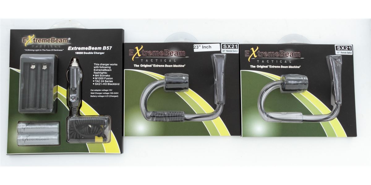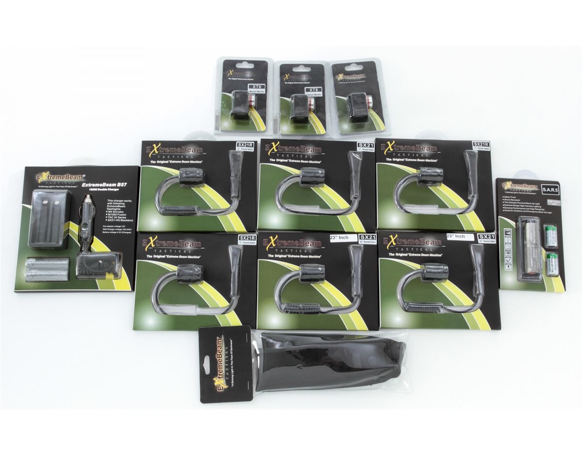 Dealer's Lot of ExtremeBeam Tactical Accessories, including five (5) Remote Switches; B57 Double Charger for car/wall; three (3) metal molles; S.A.R.5 LED high-output flashlight with lithium batteries; and a M1000 fusion holster. Eleven (11) pieces, all brand new in their original packaging. Retails @ $375/lot. Est.: $200-$300/lot. (Field Time)