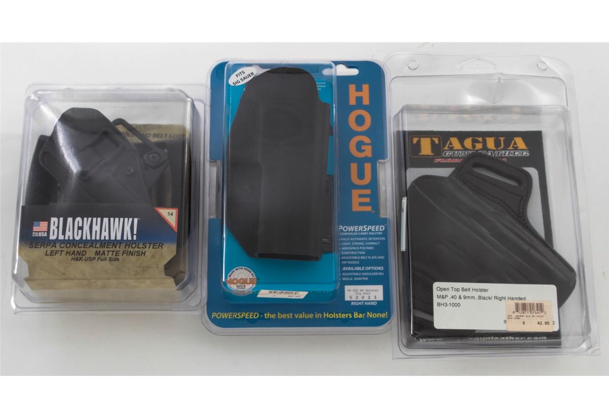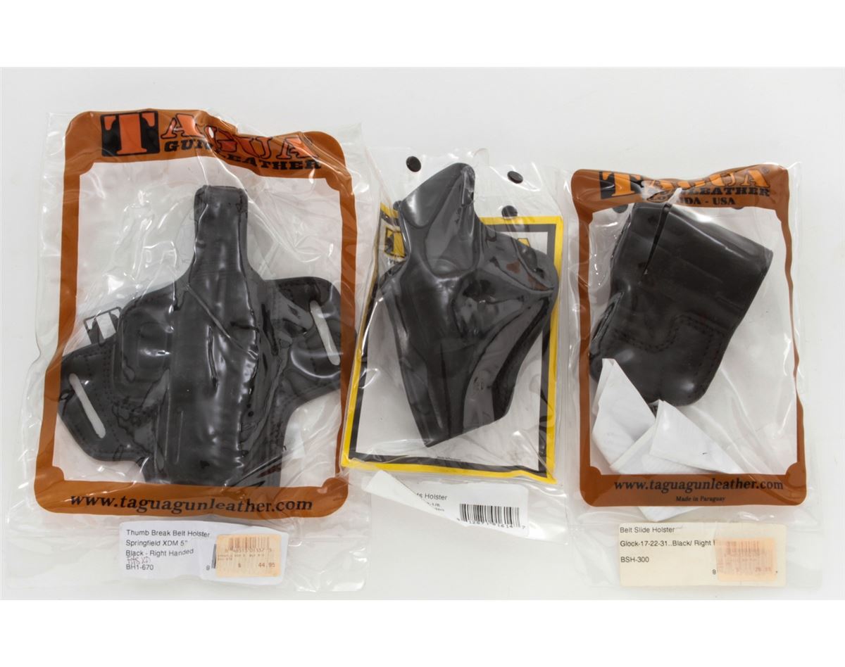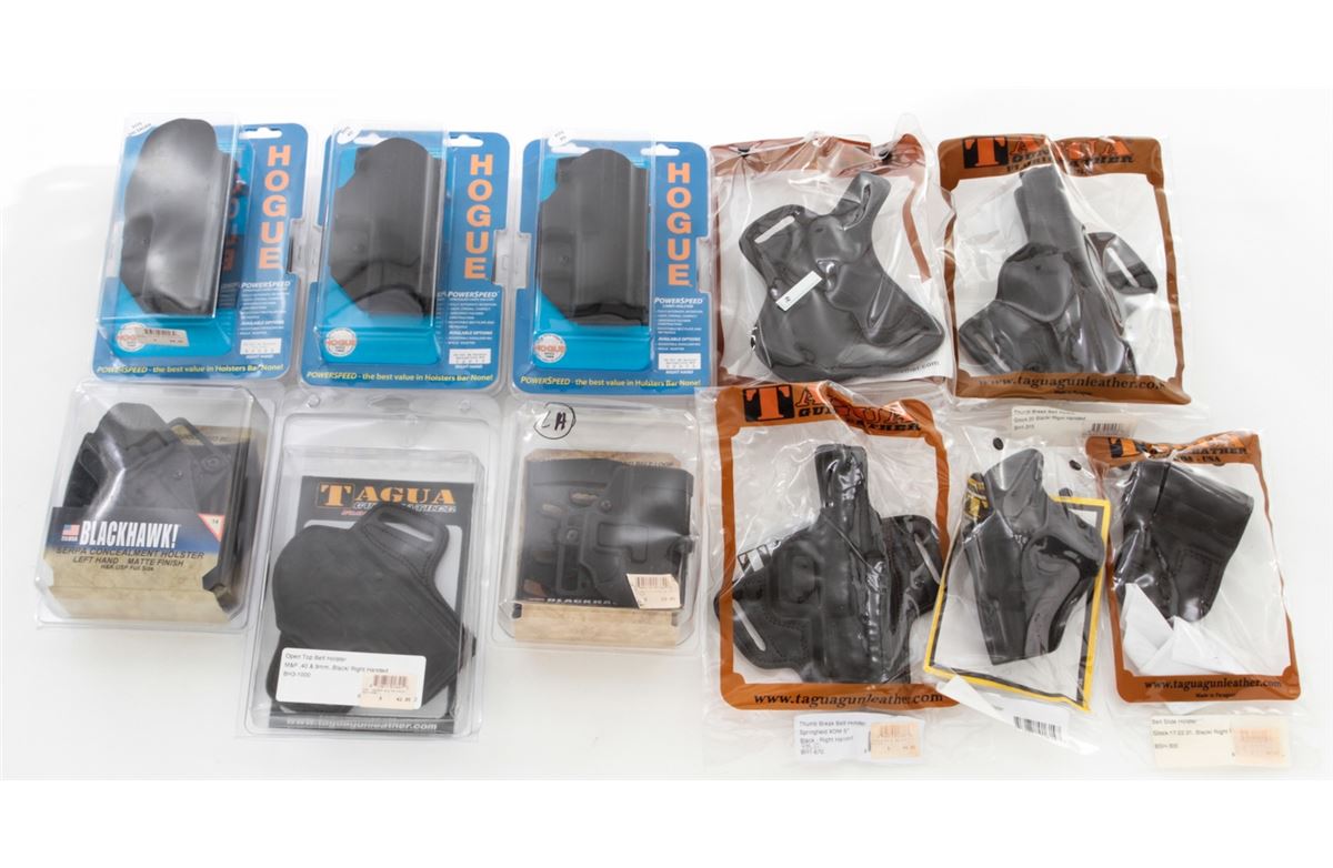 Lot of Black Leather Pistol Holsters, including six (6) Tagua for Glock 17-22-31-20, Springfield XDM 5'', M&P .40 & 9mm; three (3) Hogue holsters for Sig Sauer P220 and Springfield XD9; and two (2) Blackhawk Serpa Concealment Holsters, left-handed, for H&P USP and Glock 26/27/33. Eleven (11) pieces, all brand new in original packaging. Retails @ $500/lot. Est.: $250-$350/lot. (Field Time)
