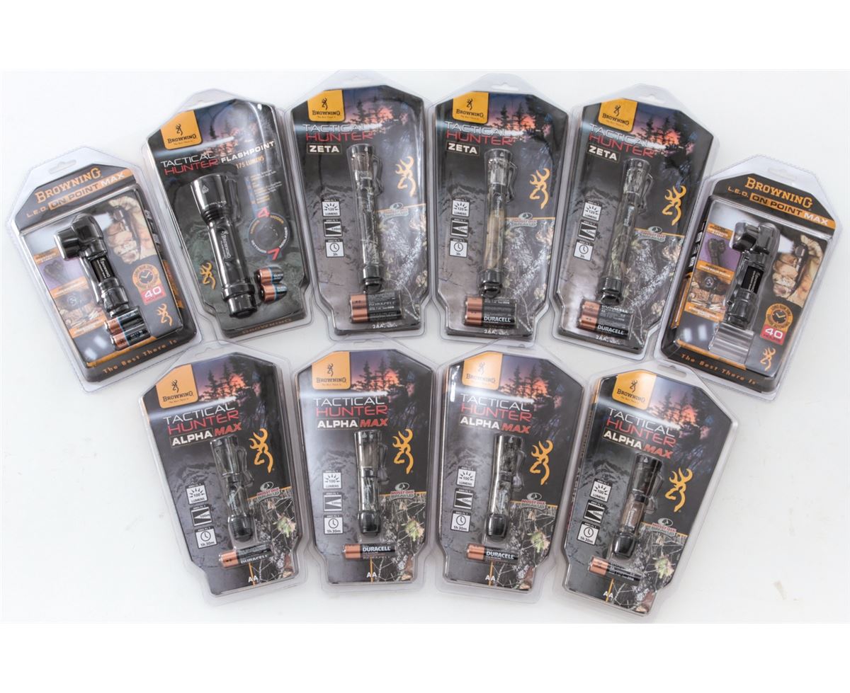 Lot of Eight (8) Browning Tactical Hunter Zeta and AlphaMax Flashlights, with batteries; along with two (2) Browning LED On-Point Max Flashlights. All brand new in original packaging. Retails @ over $500/lot. Est.: $250-$350/lot. (Field Time)
