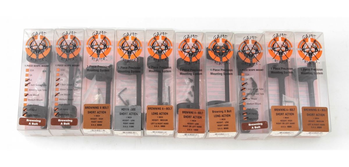 Lot of Ten (10) Game Reaper one-piece Precision Mounting Systems, for Browning A-Bolt, Browning X-Bolt, Howa 1500, long and short actions. All brand new in original packaging. Retails @ $500/lot. Est.: $250-$350/lot. (Field Time)
