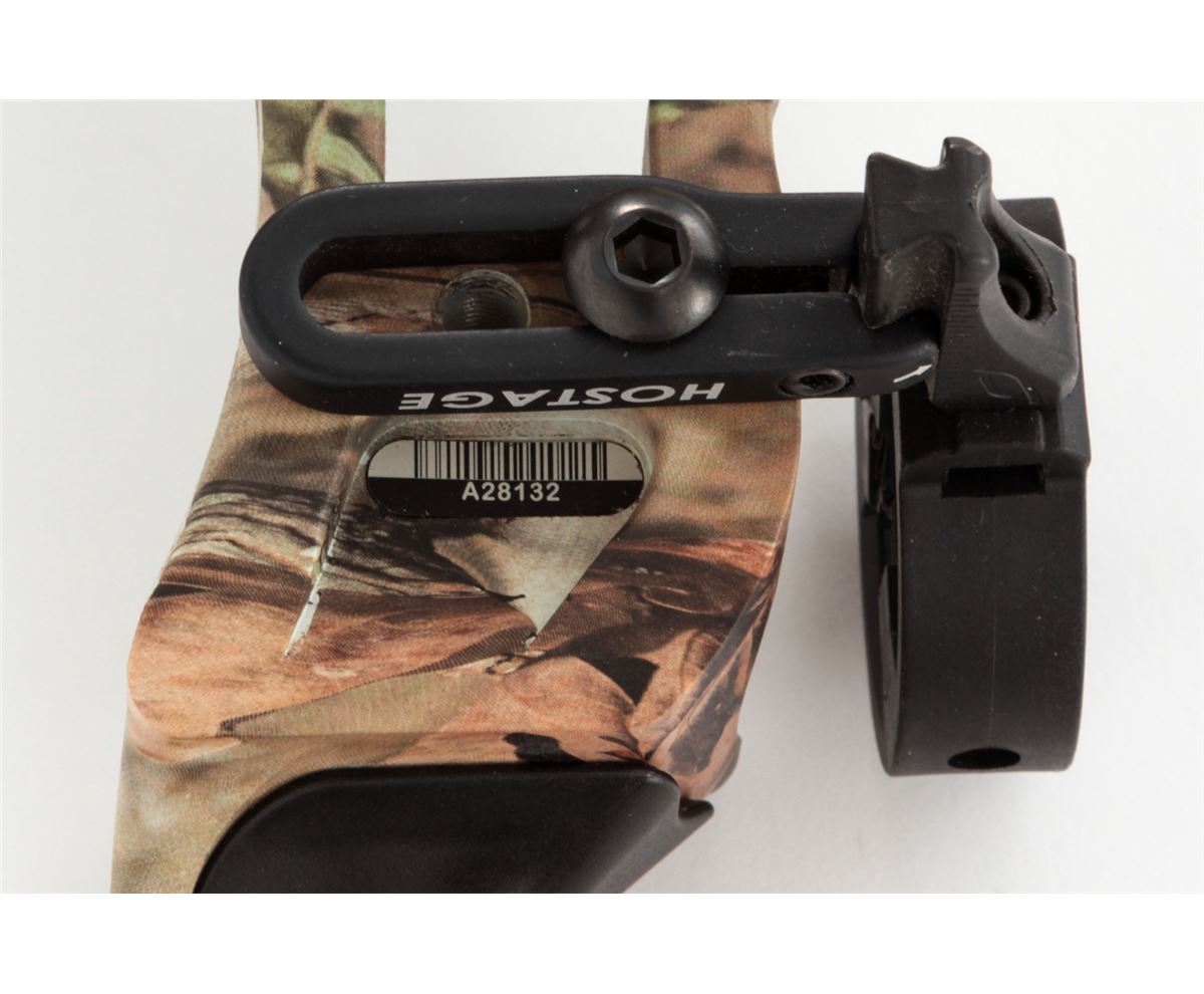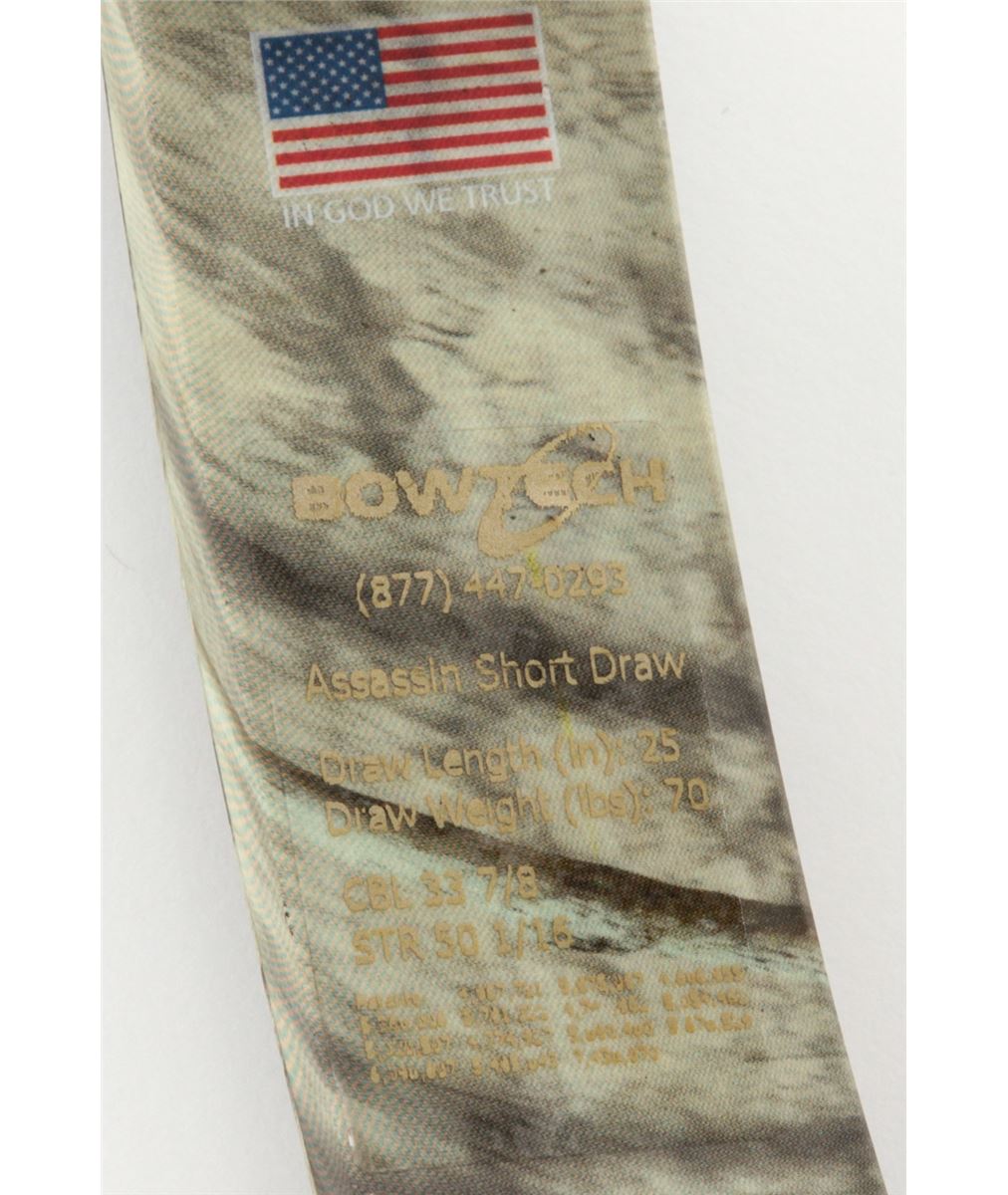 Left-Handed Bowtech Assassin Compound Bow, camouflage finish, 40-50 lbs. draw weight, 26-30'' draw length, 333rfps, with RAK package. Condition is very good. Needs to be re-strung. Retails at $549.95. Est.: $250-$350. (Field Time)