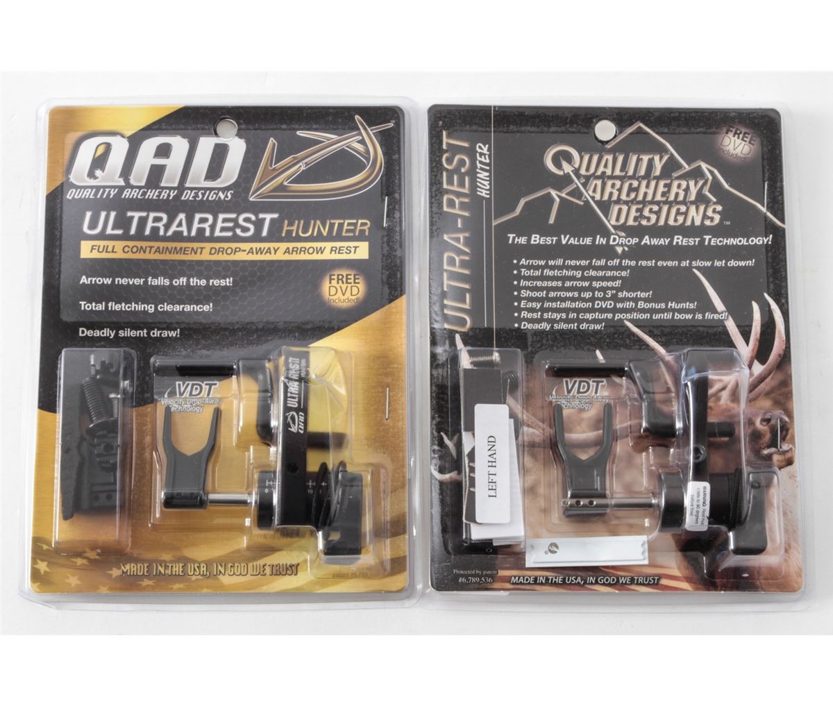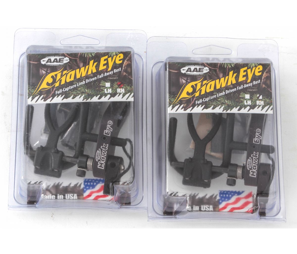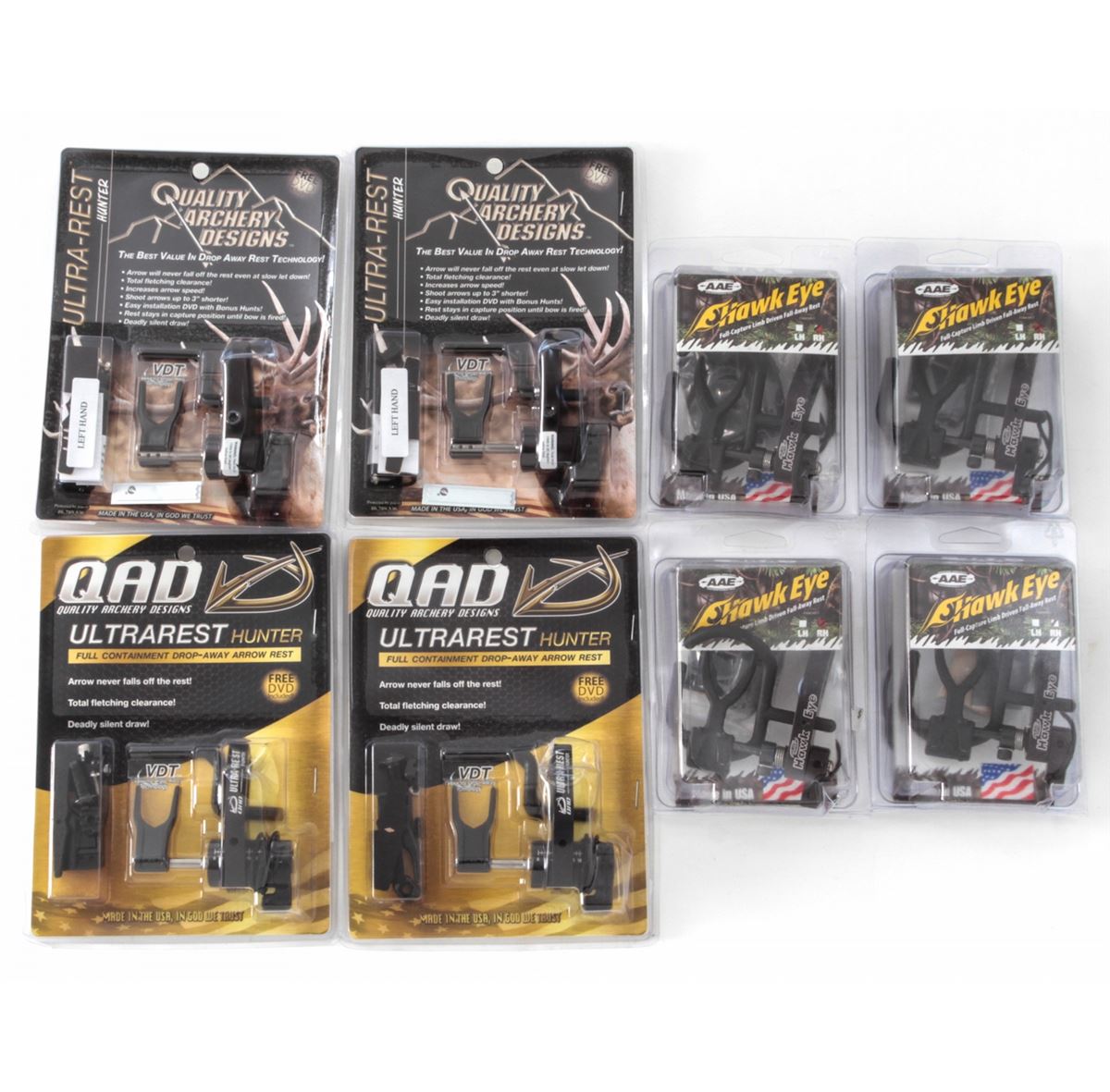 Archery: Lot of Four (4) Quality Archery Design Drop-Away Rests, two for left hand, with DVDs; along with four (4) Arizona Archery Ent. Hawkeye Drop-Away Rests. All brand new in original packaging. Retails @ $450/lot. Est.: $250-$350/lot. (Field Time)