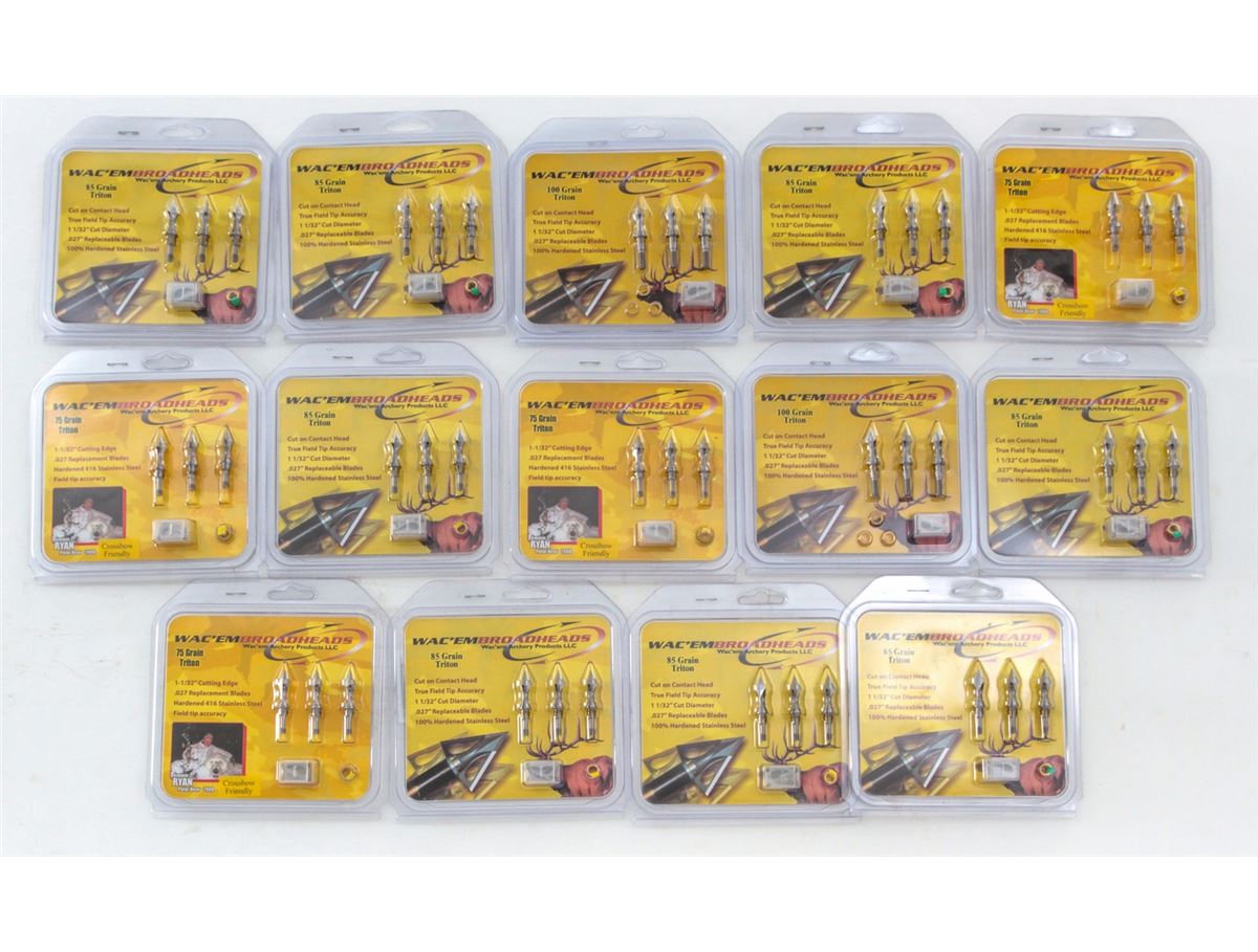 Archery: Lot of Fourteen (14) packages of Wac'emBroadheads, three (3) per package, including 85-grain triton, 75-grain triton, and 100-grain triton. All 1-1/32'' dia. with .027'' replaceable blades. All brand new in original packaging. Retails @ approx. $500/lot. Est.: $300-$400/lot. (Field Time)