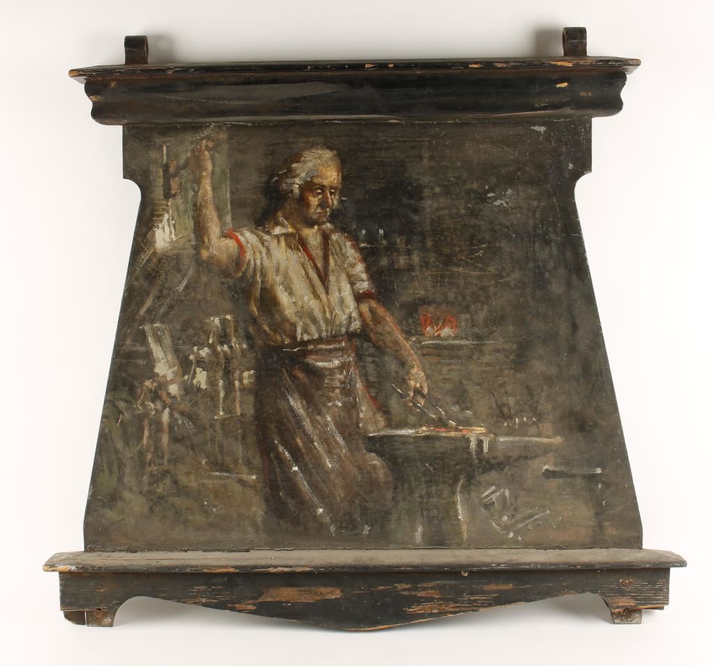 Depicting a Blacksmith on one side and "The Forge" on the other. Great decorator piece! Measures 31"x31"