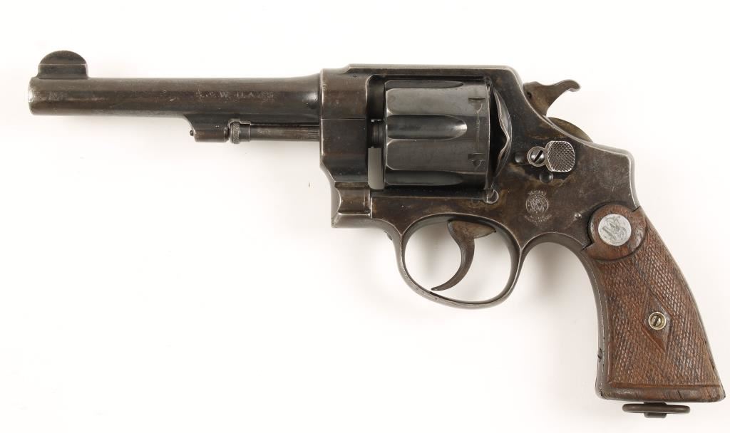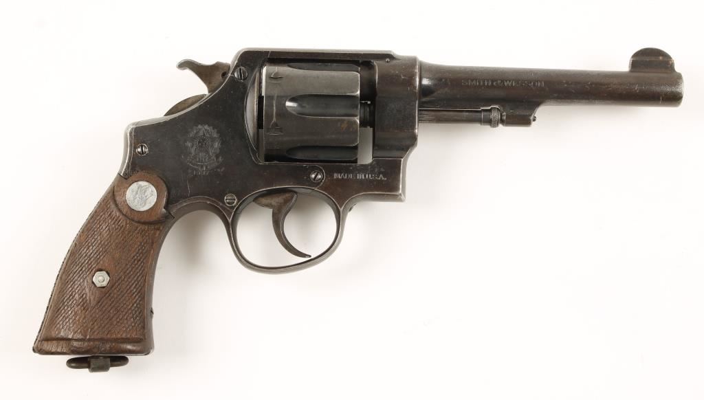 Blued double-action 6-shot revolver with a 5-1/2" barrel and fixed sights. Has Brazilian coat of arms on the side plate. Checkered wood grips with silver S&W medallions. Finish is worn and speckled with spots of surface rust and edge wear. The number 21804 is stamped on the backstrap. The bore is shiny with good rifling. The chambers are dirty. Wood grips are very worn with missing chips. Action is smooth with good lock-up. Condition is fair to good. *Modern Firearm*