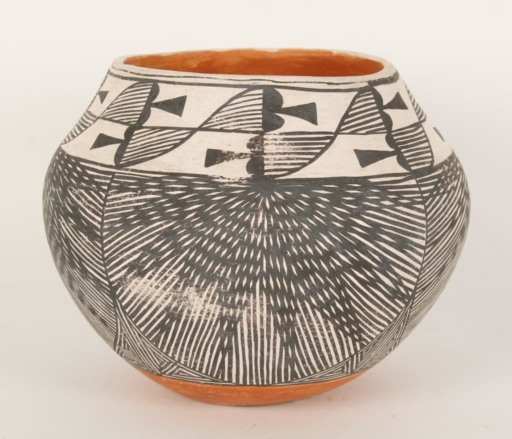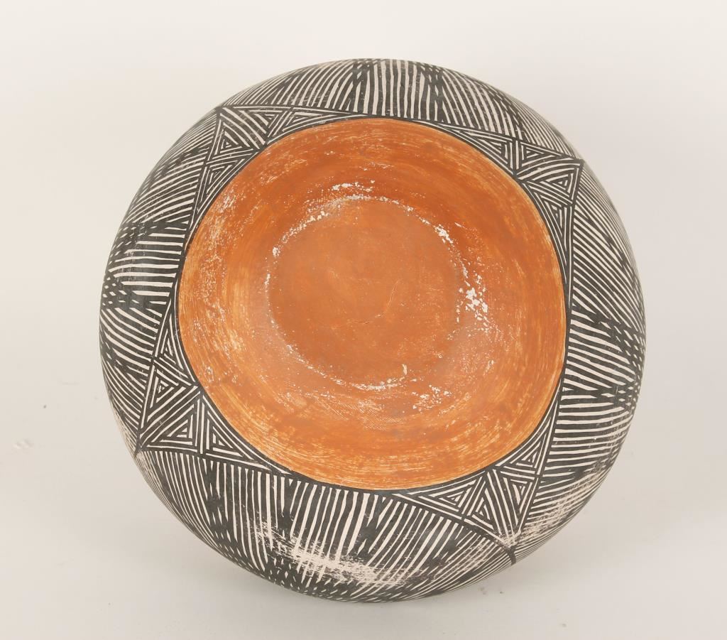 Black & white accented spiral coiled bowl with precise fine line star burst painted design. Bowl measures 7.5" x 6.5" in very good condition for it's vintage age.
