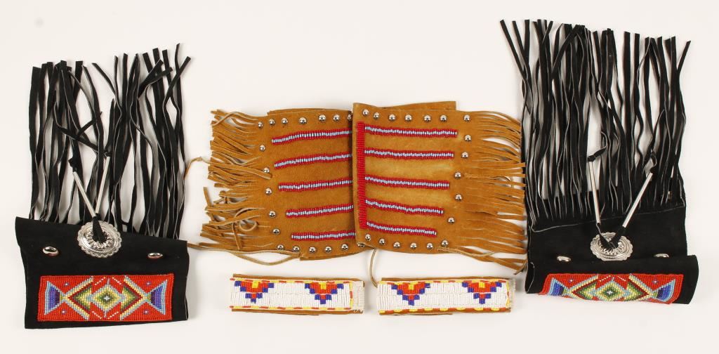 Brown buckskin wrist cuffs with fringes embellished with red and blue bead geometric patterns bordered by silver colored beads and rawhide tie closures, measures 6.75". Black buckskin wrist cuffs with fringes, adorned with single wide band of colorful orange, blue, green, red and yellow seed beads arranged in geometric design accented with silver buttons and a medallion with 3 snap closure, measures 7.5". Pair of buckskin arm or leg bands with elastic straps, embellished with blue, orange and yellow seed beads in geometric designs with white background, measures 12".