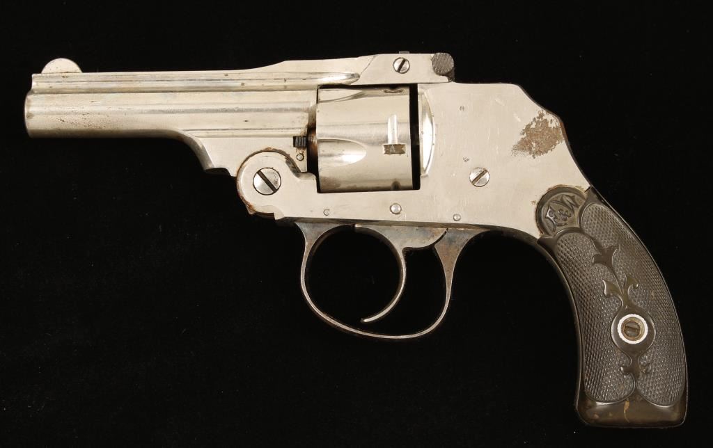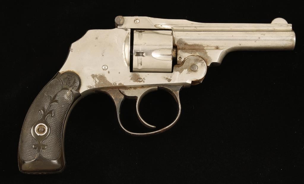 Nickel plated double-action only 5-shot top-break hammerless revolver with a 3" barrel. Plating has lost approx 20% with subsequent rusting. Blued trigger guard has wear to a grey finish and surface rust. Blued barrel latch is in good condition. Case colored trigger still shows color in protected areas. Hard rubber grips have a scratch and some dings but are complete. Bore and chambers are shiny and there is good rifling. Functions well. Condition is fair. *Modern Firearm*
