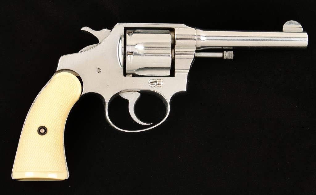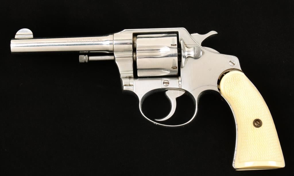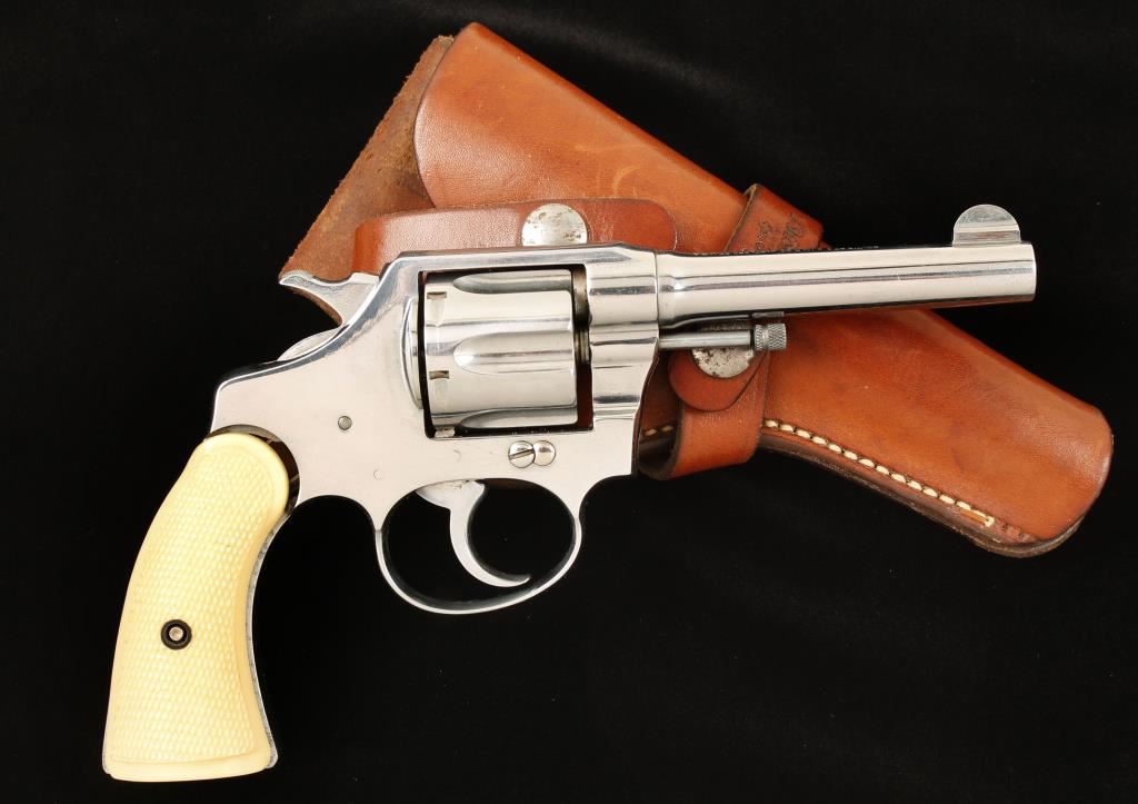Nickel plated double-action 6-shot revolver with a 4" barrel. Probably re-nickeled due to lost details. Plating is in very good shape with only a few scratches. Bore is bright with some pitting and sharp rifling. Chambers are clean. The grips appear to be white Franzite but they don't fit this model. Function is very good with very tight lock-up. Includes Brauer Bros. open-top leather holster. Condition is very good. *Modern Firearm*