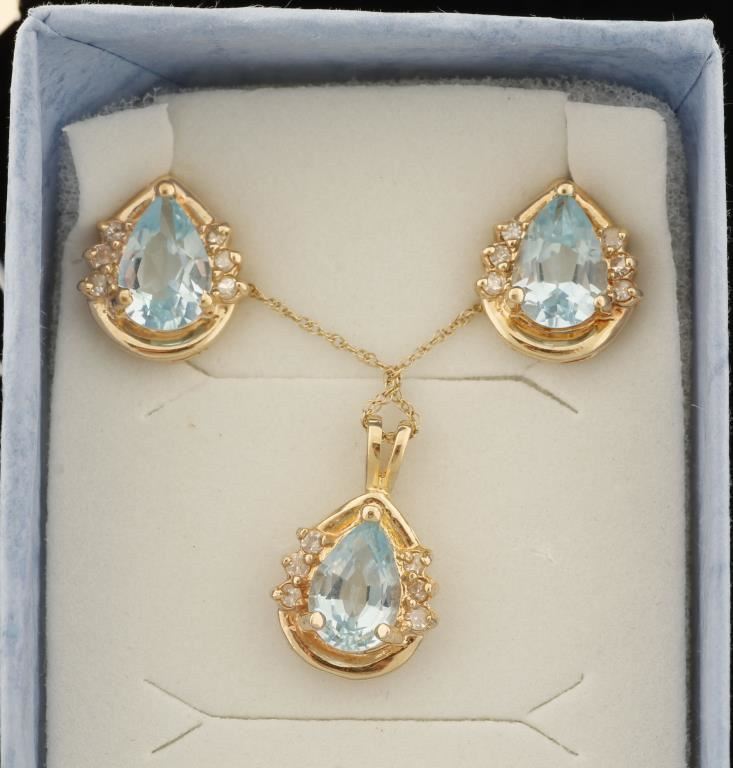 Stylish pendant & earrings set featuring Swiss blue topaz and diamonds. The topaz are pear cut and a lovely shade of sky blue. Accenting the topaz are 18 diamonds on each side of the topaz. The blue topaz total around 6 carats with about 1/4 carat of diamond accents. All set into 14k yellow gold. The pendant is suspended from an 18" chain made in 10kt yellow gold.