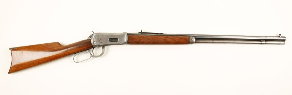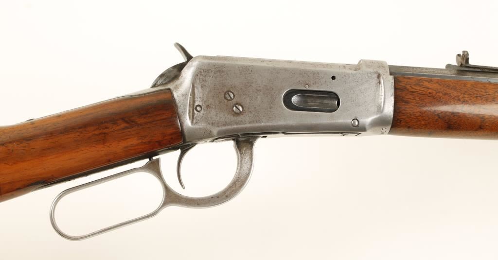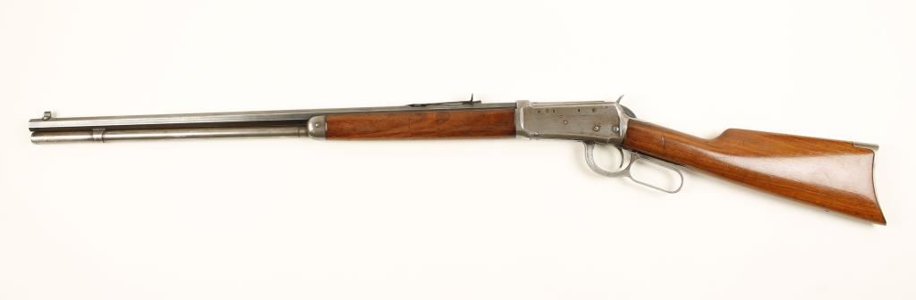 Popular lever action rifle made in 1929 with 26" octagon barrel. Blued finish, plain straight grip walnut stock, and capped forend, full length tube magazine, crescent butt plate and buckhorn rear sight. This was the last year of the forend being capped. Very good clean bore and action and very good action. Condition: Very good overall showing little finish remaining on receiver with thinning bluing on barrel and tube. Wood shows possible early refinish with excellent wood to metal fit. *Curio & Relic Firearm*