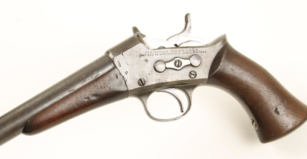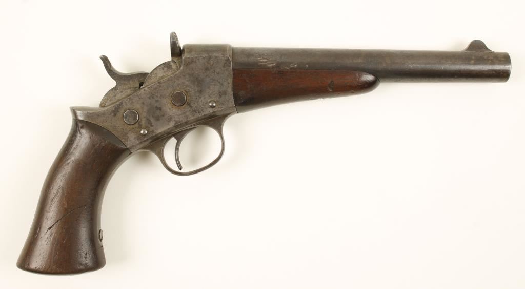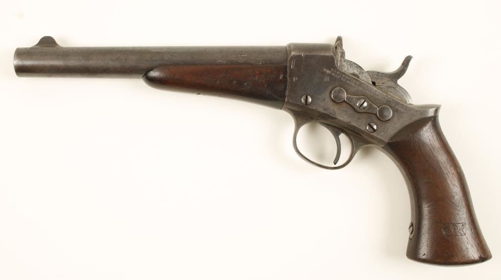 Blued and case-colored single-shot rolling block pistol with an 8" barrel. Bluing has faded to a patina with rust stains, some pitting and dings. There appear to be wrench marks on the barrel. The bore is bright and shiny with a few spots of discoloration. The case-coloring has faded and left a mildly rust stained and pitted surface with some large dings. The initials "P" and "S" are stamped on the frame. Wood furniture has dings, rubs and scratches and there is a cartouche on the grip. Action works well. Condition is good to very good. *Antique Firearm*