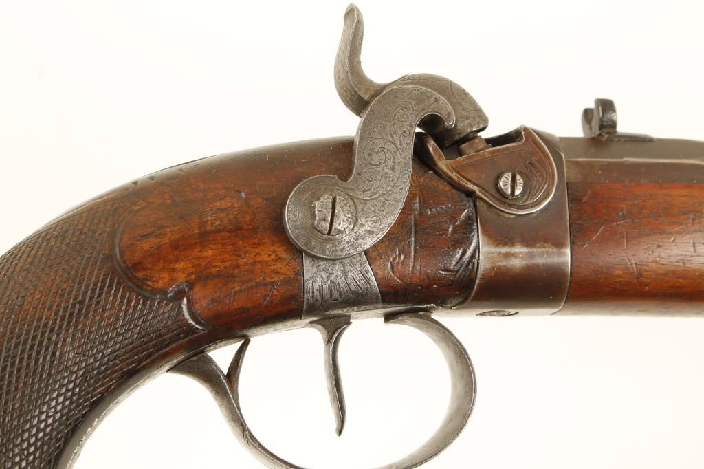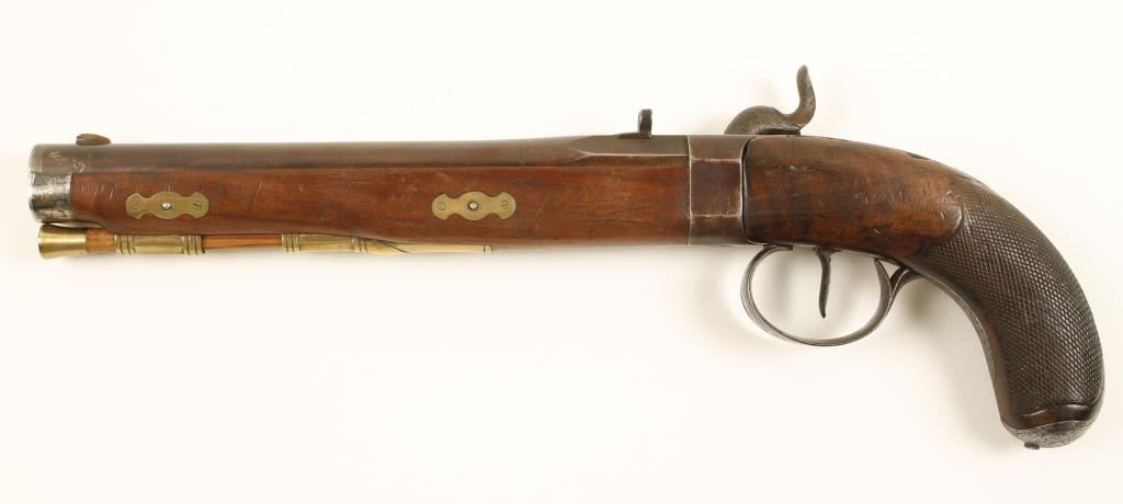 Browned Bar-in-Wood action percussion target pistol with a 8-3/4" barrel. 19th and 20th centuries Germanic style. Browned steel of the barrel and action has few scratches and rubs. Trigger guard, hammer and grip cap are engraved and have rust stains and pitting. The grip cap has a trapdoor for carrying... Bore is bright and shiny with rifling. Brass thimbles and side plates have scratches. Metal nose cap is dark. Wood has numerous scratches and dings and the checkering on the grip is worn almost smooth in spots. Action works well. Rear sight is semi-buckhorn. Condition is good. *Antique Firearm*