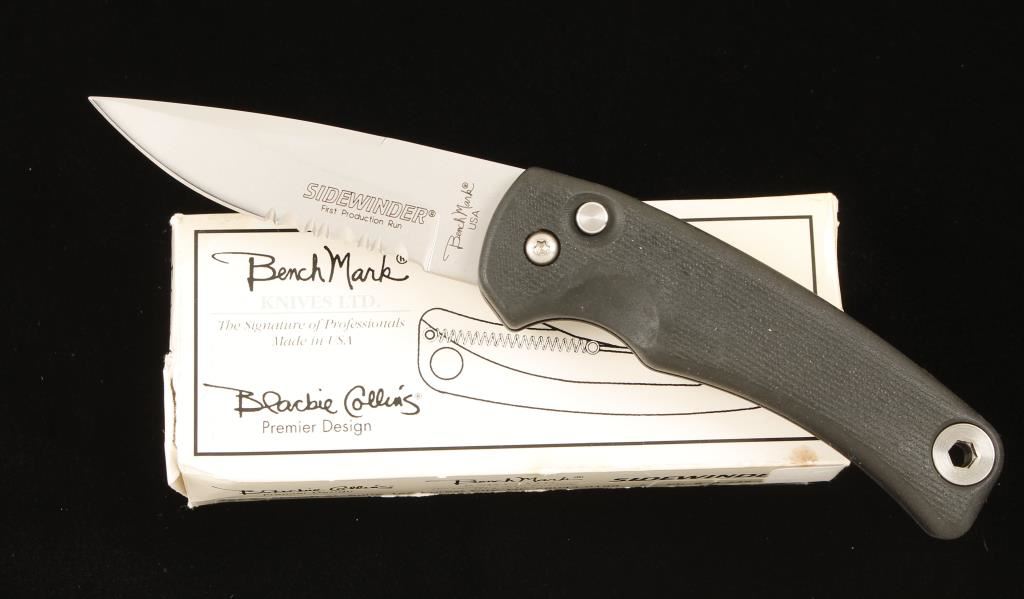 First Production Run Sidewinder designed by Blackie Collins produced by Benchmade. Features a partly serrated blade, pocket clip and lanyard loop. Condition is like new in box.
