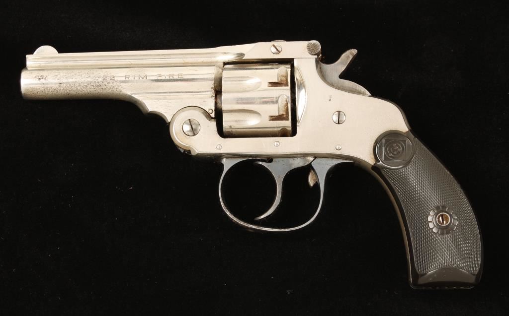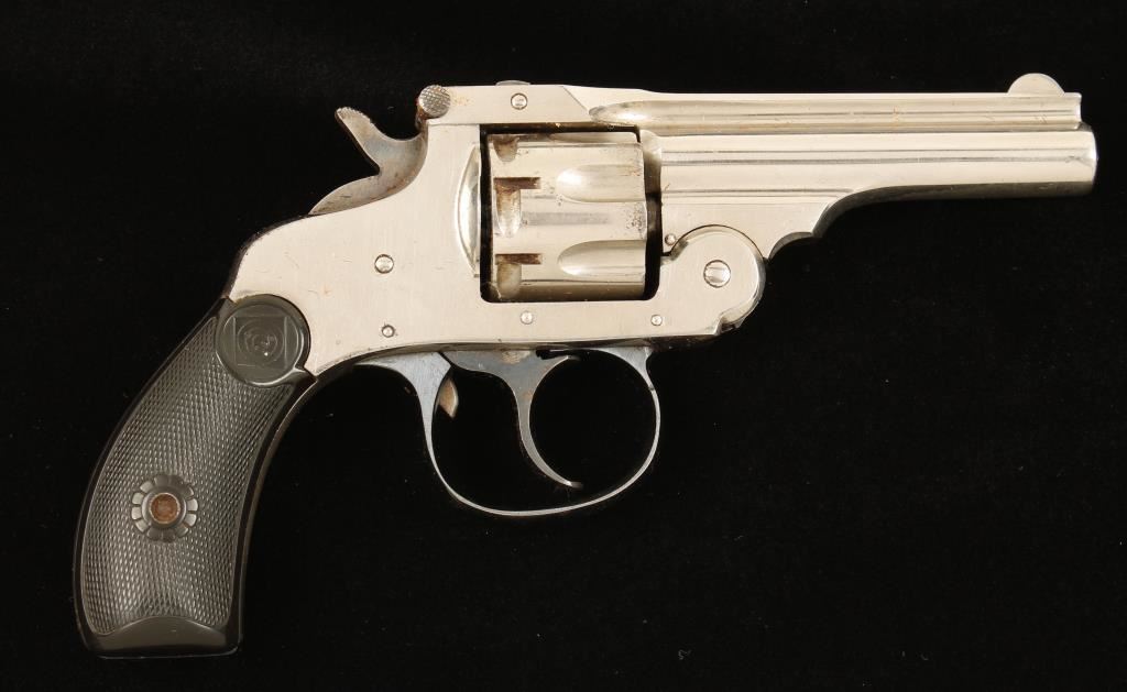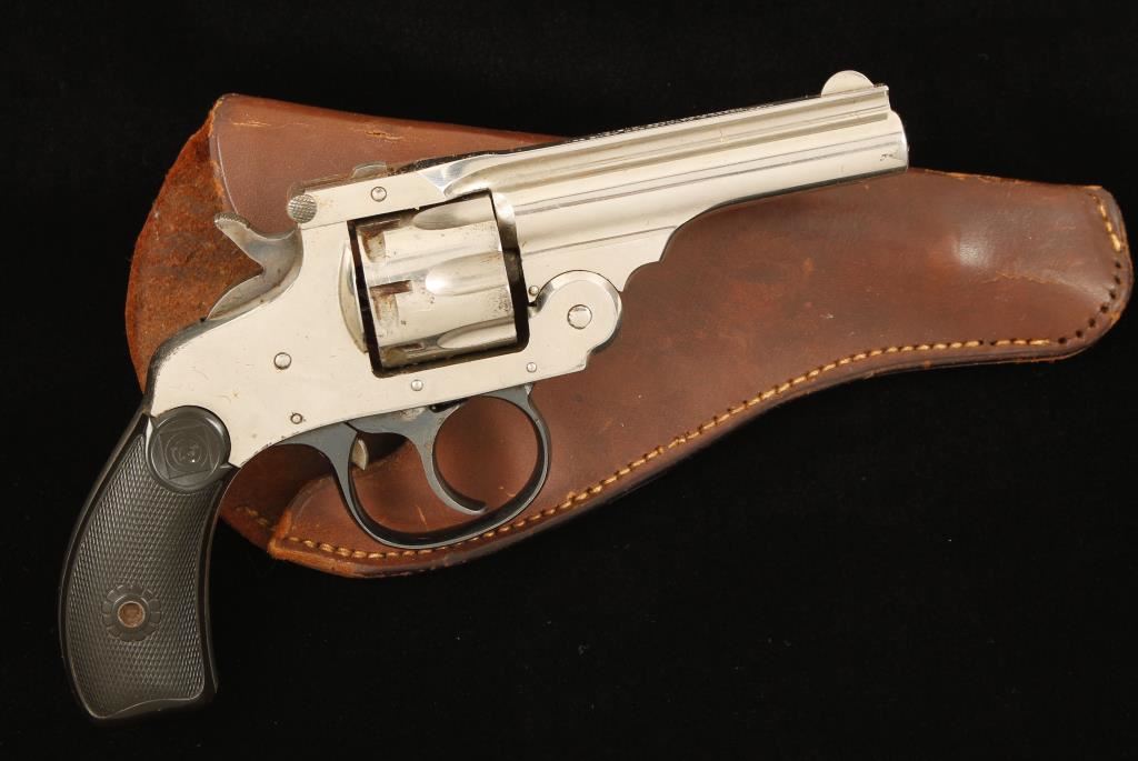 Harrington & Richardson nickel plated double-action 7-shot top-break revolver with a 3" barrel. Finish is worn with some penetrations to bare metal showing surface rust. Bore is bright with sharp rifling. Cylinders are clear. Blued trigger guard and trigger have spots of surface rust. The hammer retains some of the case-coloring. Hard rubber grips are in very good condition. Functions as it should. Includes a leather open-top holster with some broken stitching and some missing stitching. Condition is good. *Modern Firearm*